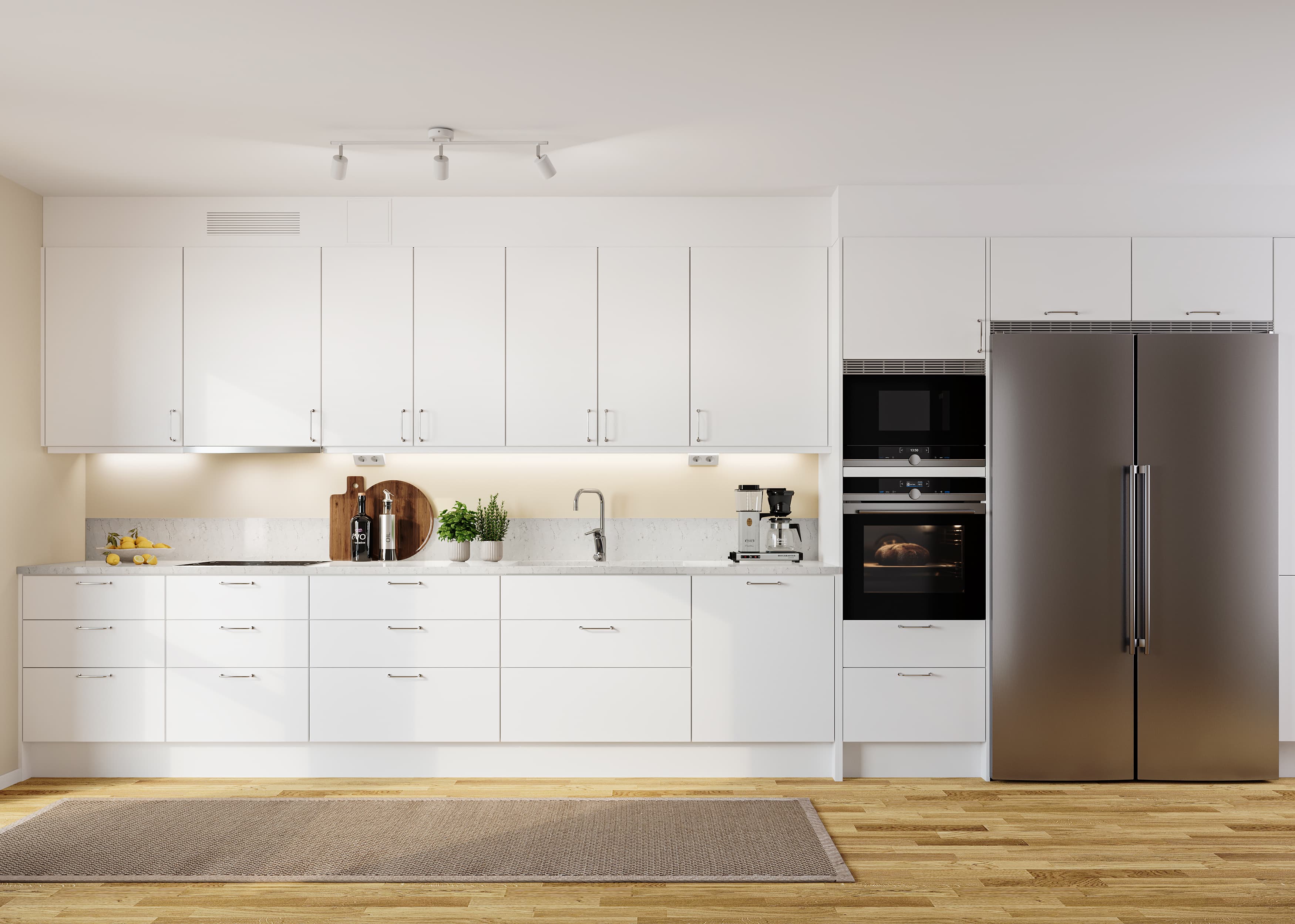 Fyra rum och kök i eftertraktat gavelläge. Rymlig balkong. Kök från Marbodal - lucka Arkitekt Plus med kvartskompositskiva, integrerad diskmaskin och rostfria vitvaror från Siemens. Dubbel kyl/frys. Trestavs ekparkett och sobert målade väggar. Fin förvaring i skjutdörrsgarderober. Två smakfulla badrum med klinker och kakel varav ett med handdukstork samt tvättmaskin och torktumlare side by side. Förråd med fönster i bostaden. Du väljer kostnadsfritt en av våra designstilar Sommar, Höst eller Vinter.