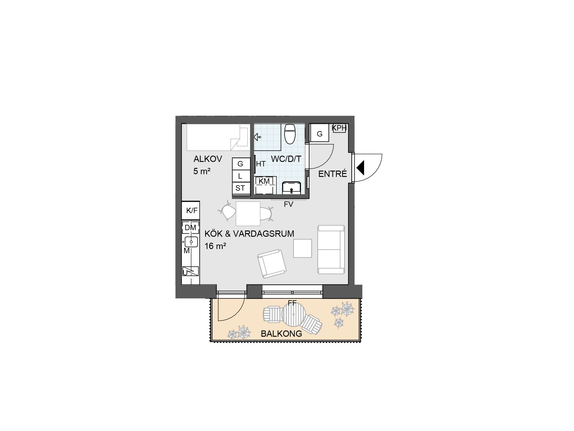 Det öppna sambandet mellan kök och vardagsrum gör hemmet luftigt och socialt, medan sovalkoven skapar en naturligt avskild plats för vila. Badrummet är helkaklat och utrustat med kombimaskin som både tvättar och torkar, så att du får full funktionalitet även på liten yta.