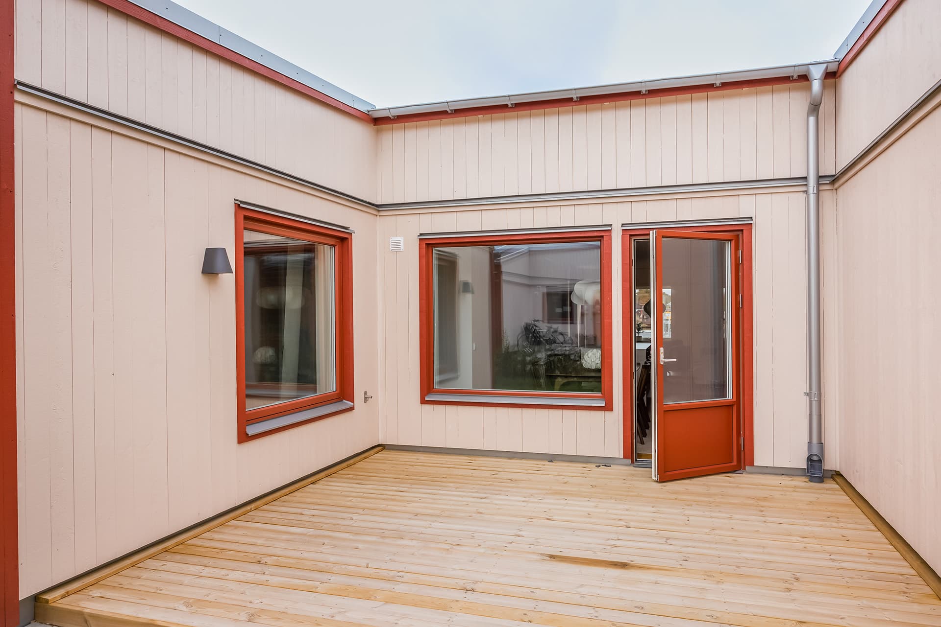 och får här ett insynsskyddat läge med utsikt över trädgården och uteplatsen.