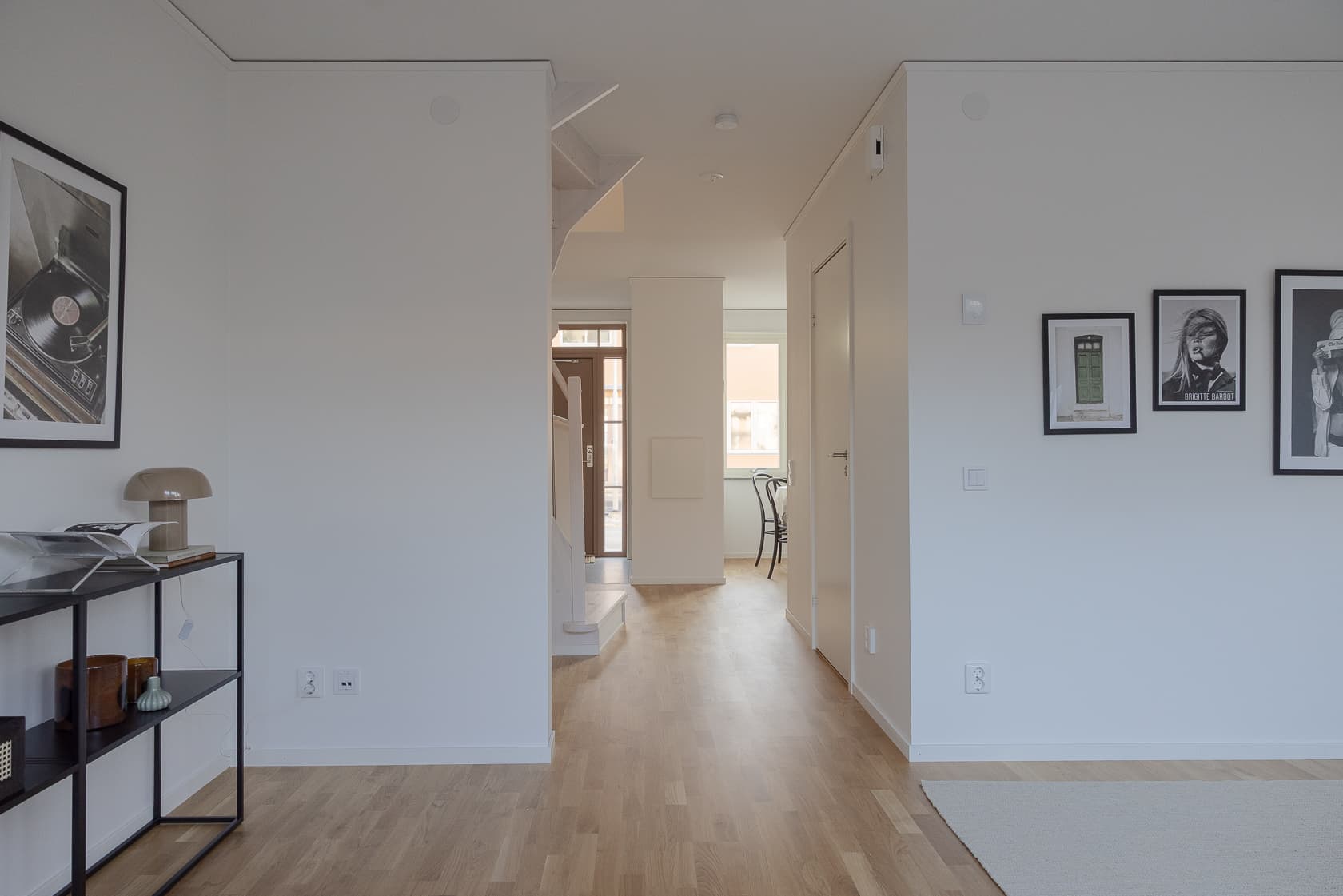 Innanför entrén möts du av en välkomnande hall. Från hallen går trappan