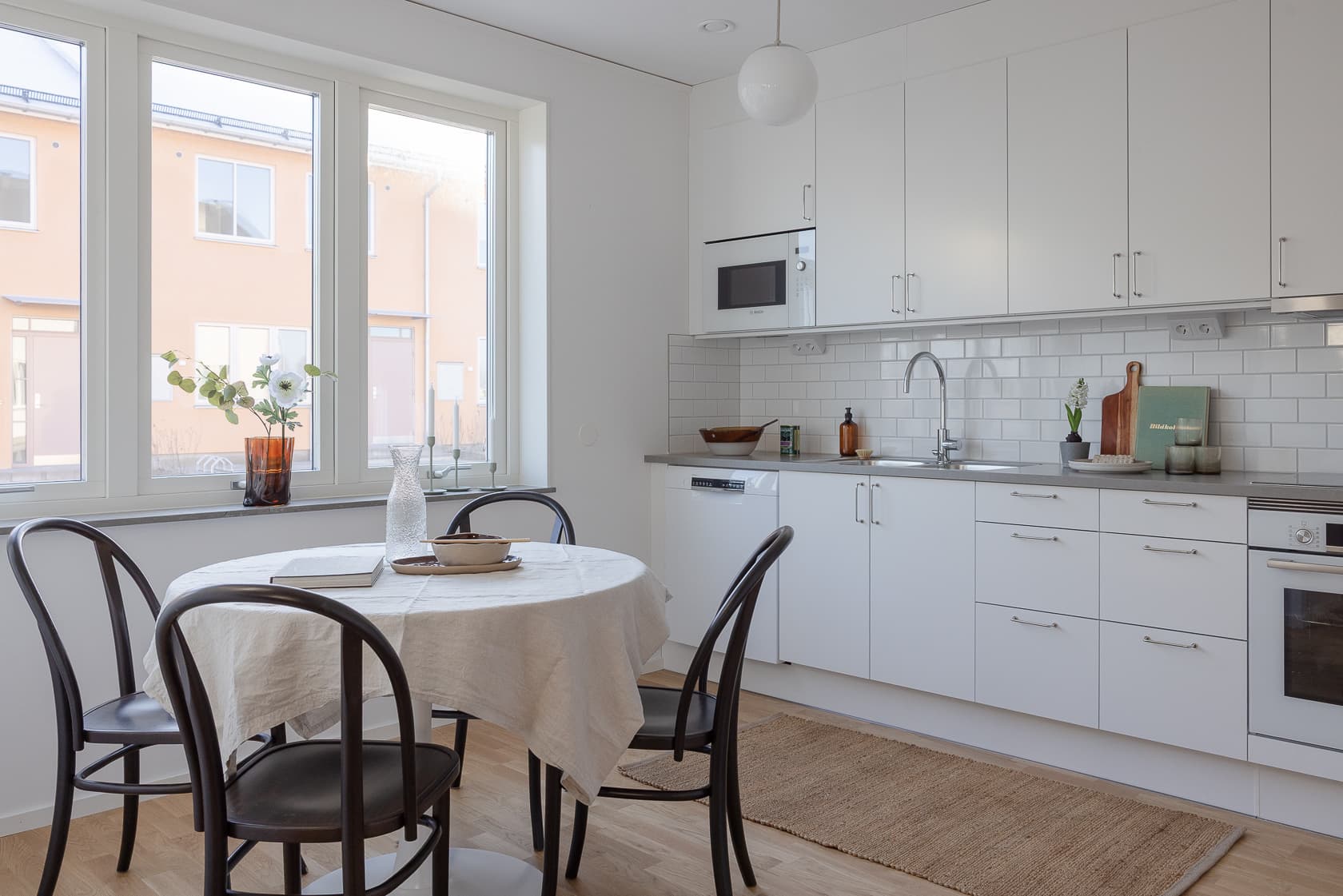 Innanför entrén möts du av en välkomnande hall med fint ljusinsläpp och plats för avhängning. Till vänster har du ett rymligt kök med plats för matbord framför de stora fönsterpartierna - som bjuder in till både middagar och spelkvällar med familjen eller vännerna.