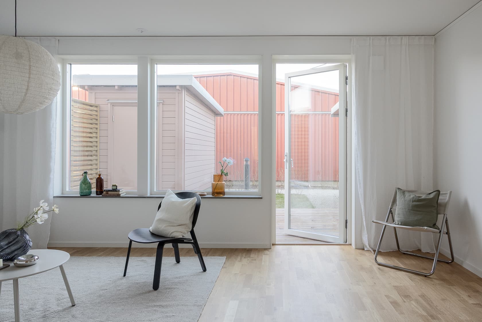 Vardagsrummet är på cirka 20 kvadratmeter och härifrån kan du gå ut till den mysiga uteplatsen med trätrall och grästäppa. Fönstersättningen gör att dagsljuset kan flöda fritt genom bostaden och ger rummen en luftig och rymlig känsla. I trädgården finns också ett kallförråd som rymmer både trädgårdsredskap och annat du behöver förvara.