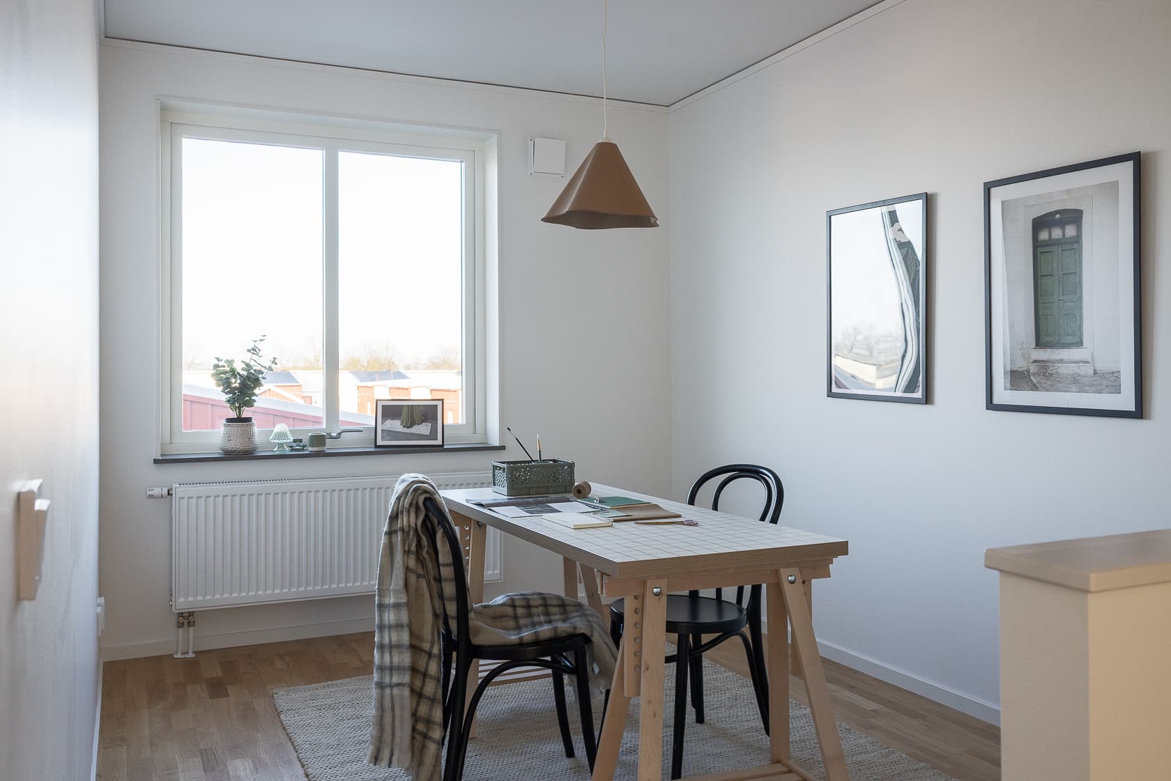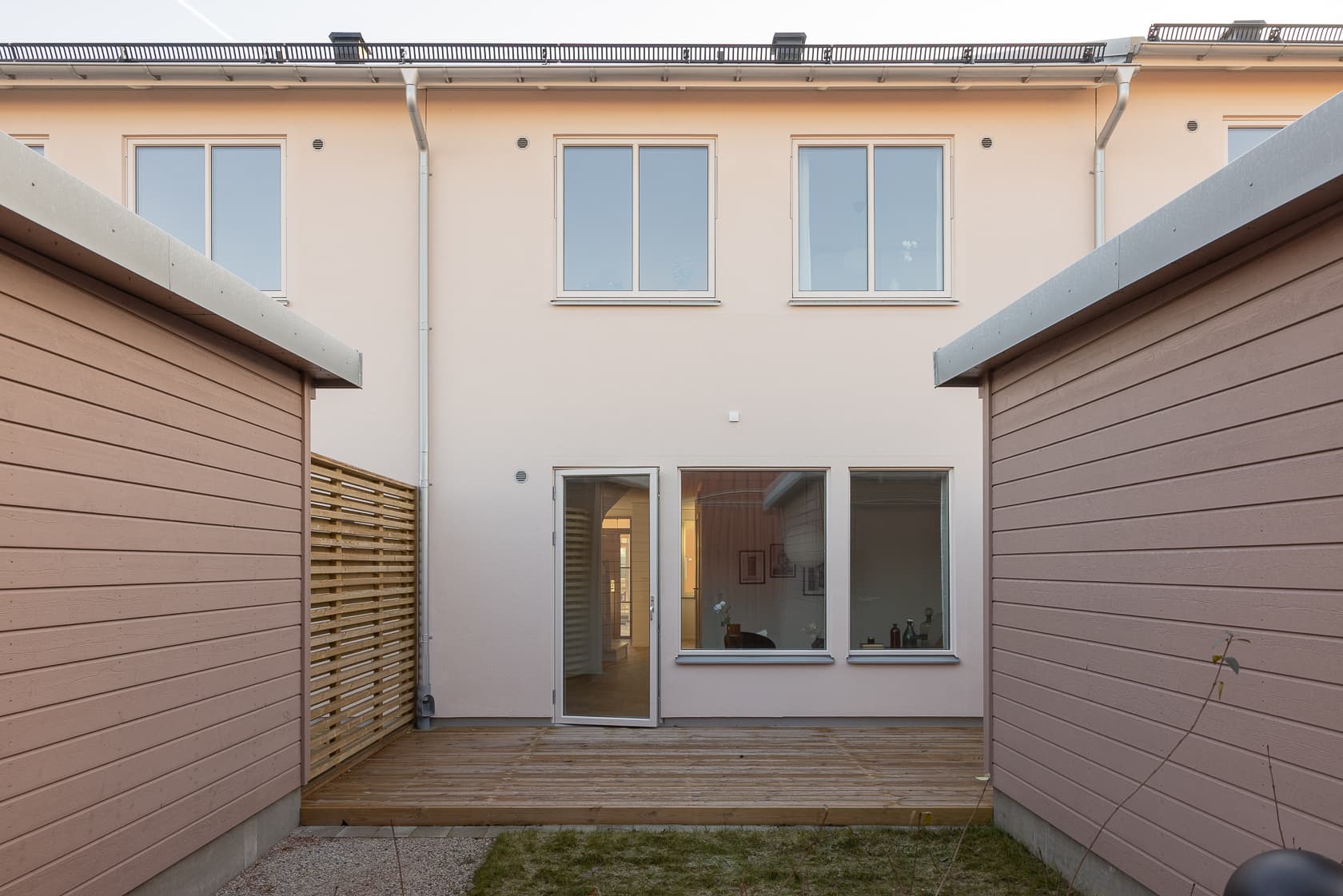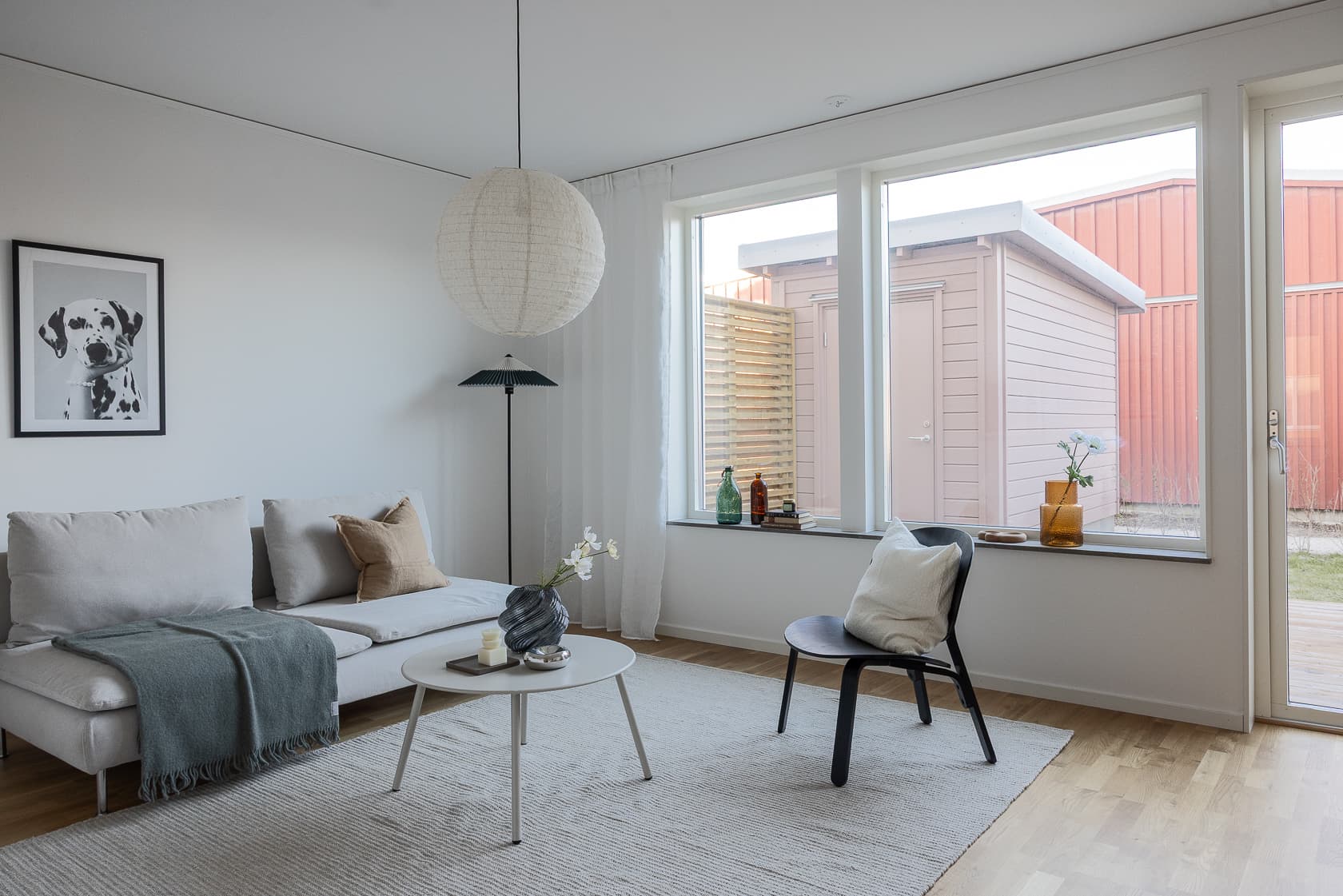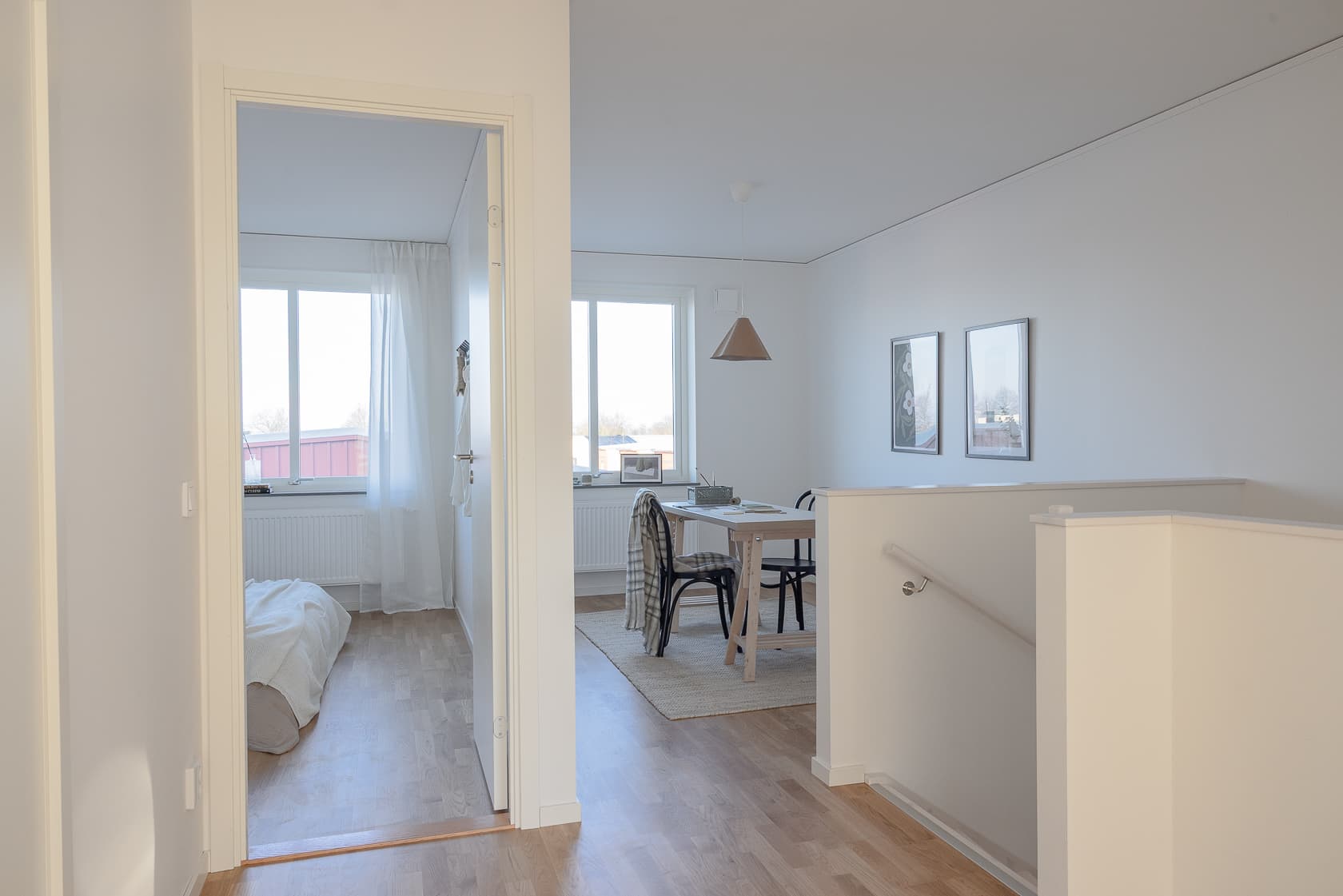 Innanför entrén möts du av en välkomnande hall. Från hallen går trappan upp till övre planet och under trappan finns ett praktiskt förrådsutrymme. På bottenvåningen ligger också ett välplanerat kök med matplats och ett helkaklat badrum med wc, dusch, tvättmaskin och torktumlare. Vardagsrummet är på cirka 20 kvadratmeter och härifrån kan du gå ut till den mysiga uteplatsen med trätrall. Fönstersättningen gör att dagsljuset kan flöda fritt genom bostaden och ger rummen en luftig och rymlig känsla.