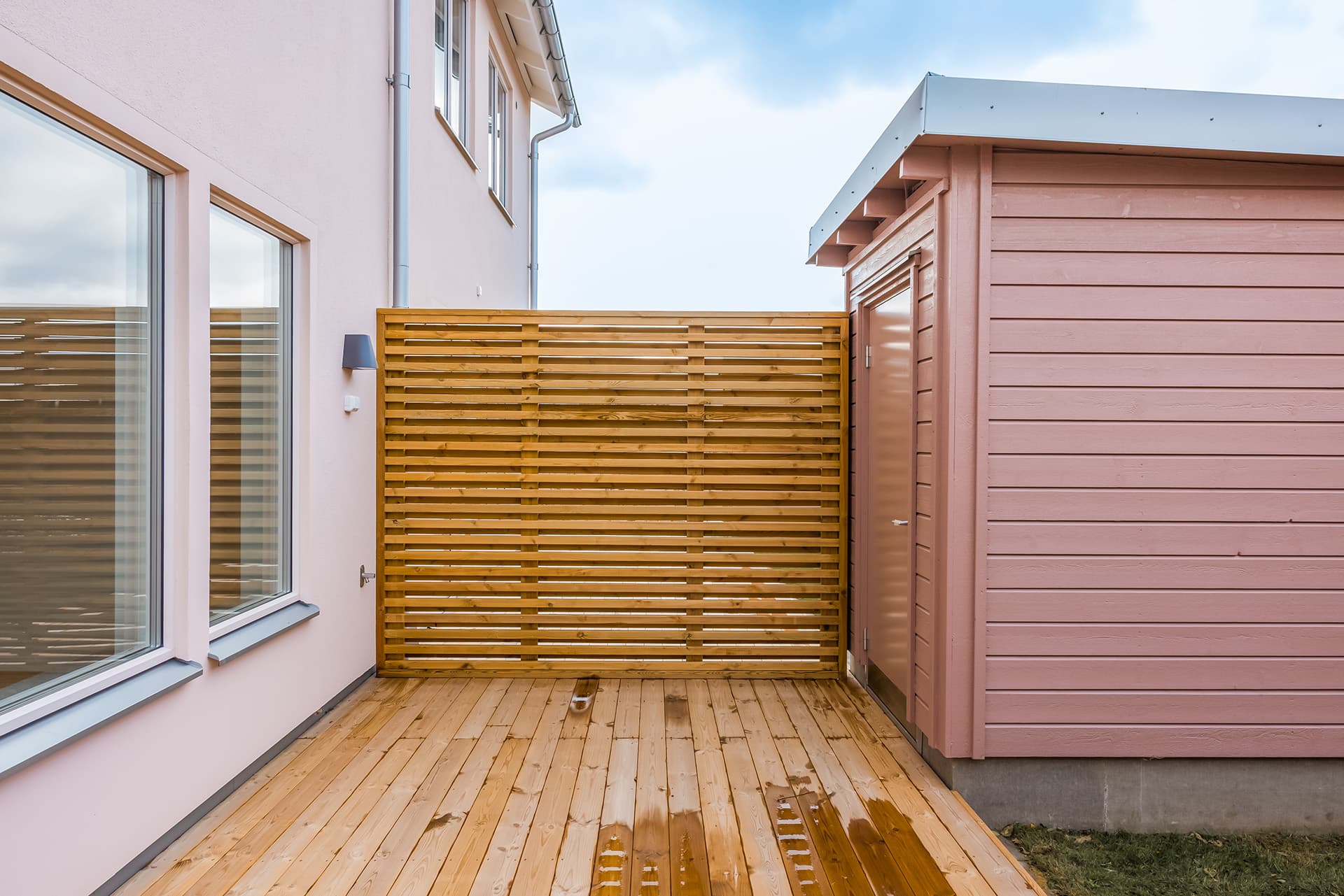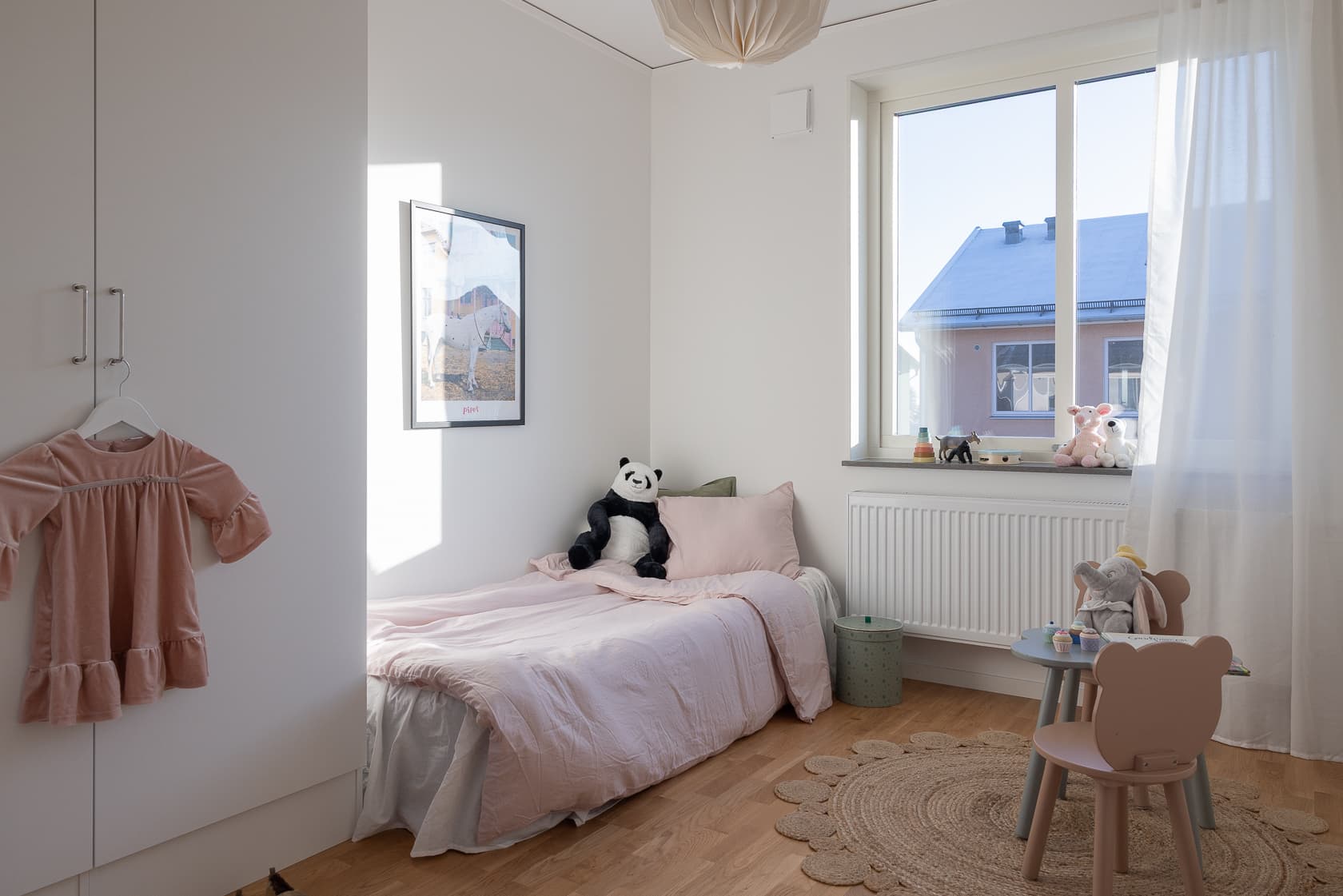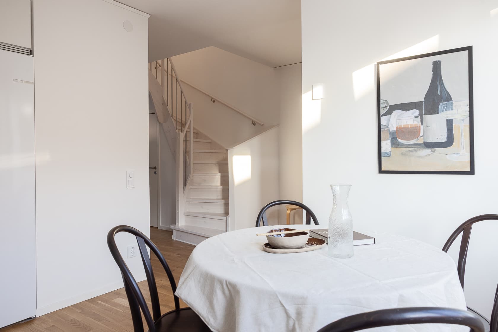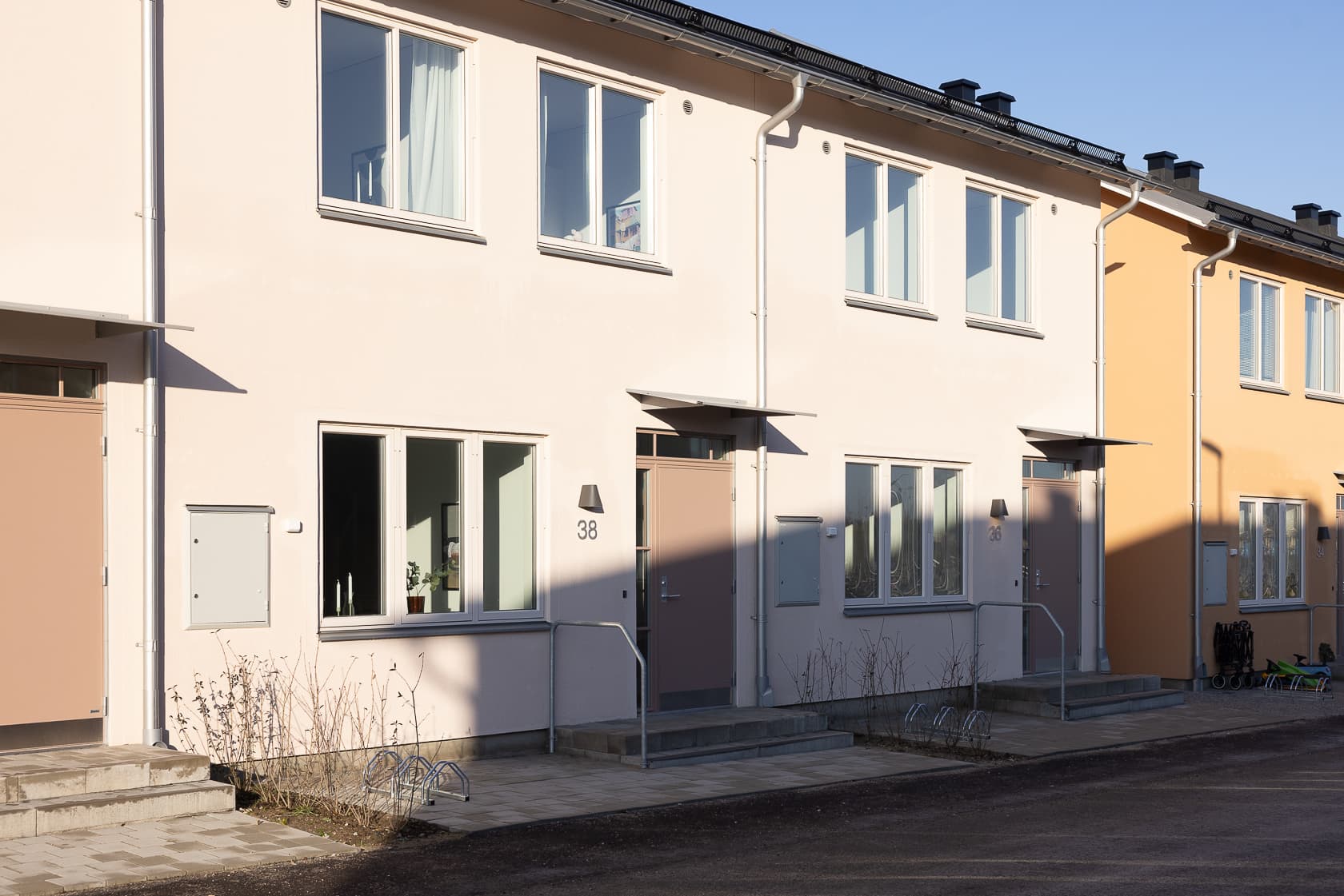 Innanför entrén möts du av en välkomnande hall. Från hallen går trappan upp till övre planet och under trappan finns ett praktiskt förrådsutrymme. På bottenvåningen ligger också ett välplanerat kök med matplats och ett helkaklat badrum med wc, dusch, tvättmaskin och torktumlare. Vardagsrummet är på cirka 20 kvadratmeter och härifrån kan du gå ut till den mysiga uteplatsen med trätrall. Fönstersättningen gör att dagsljuset kan flöda fritt genom bostaden och ger rummen en luftig och rymlig känsla.