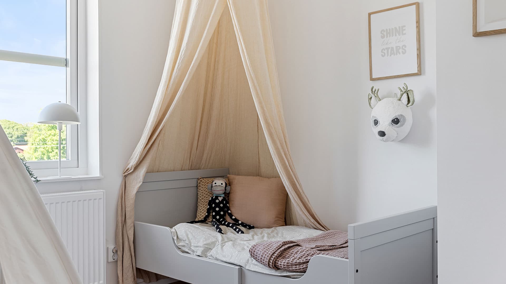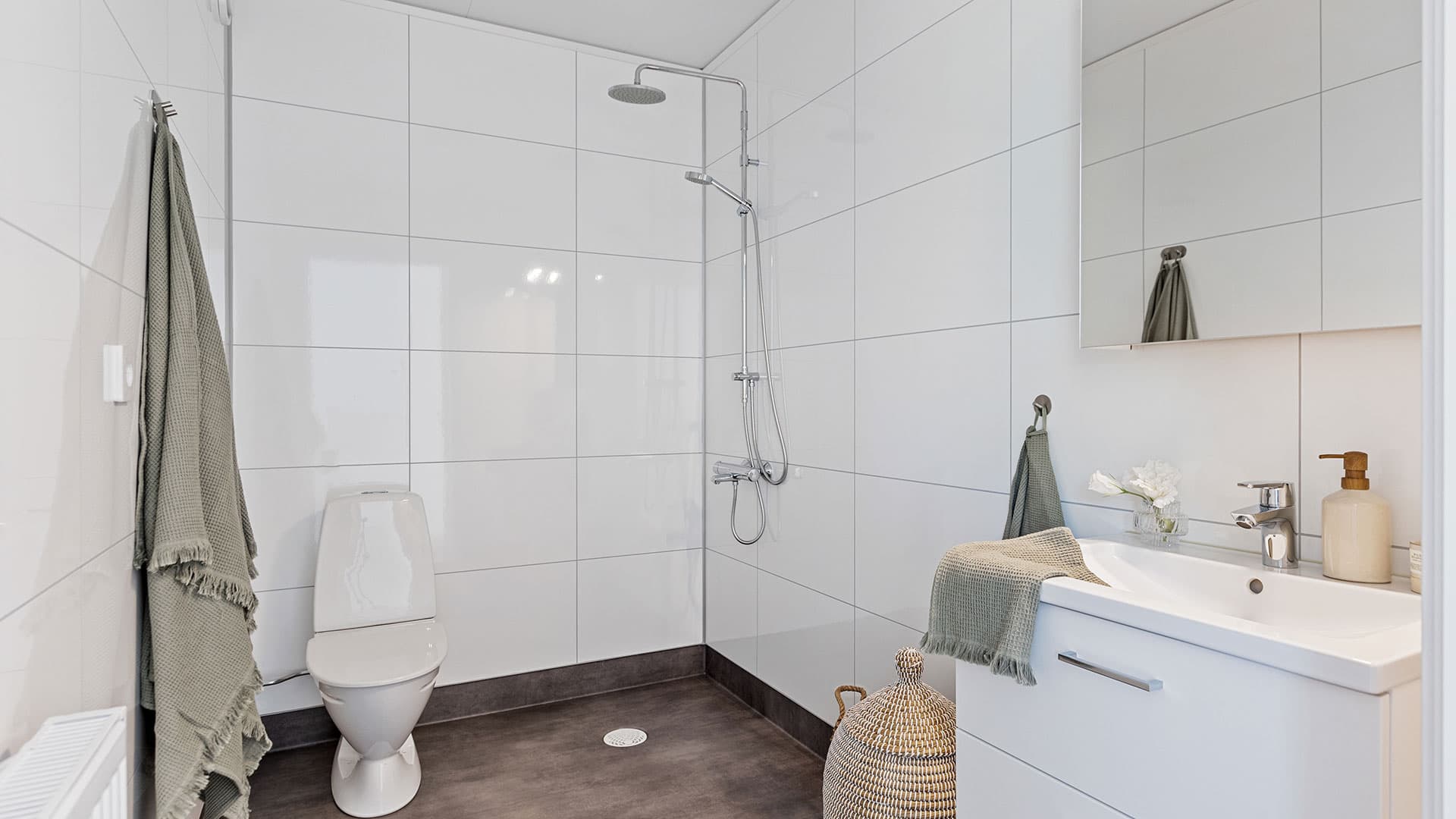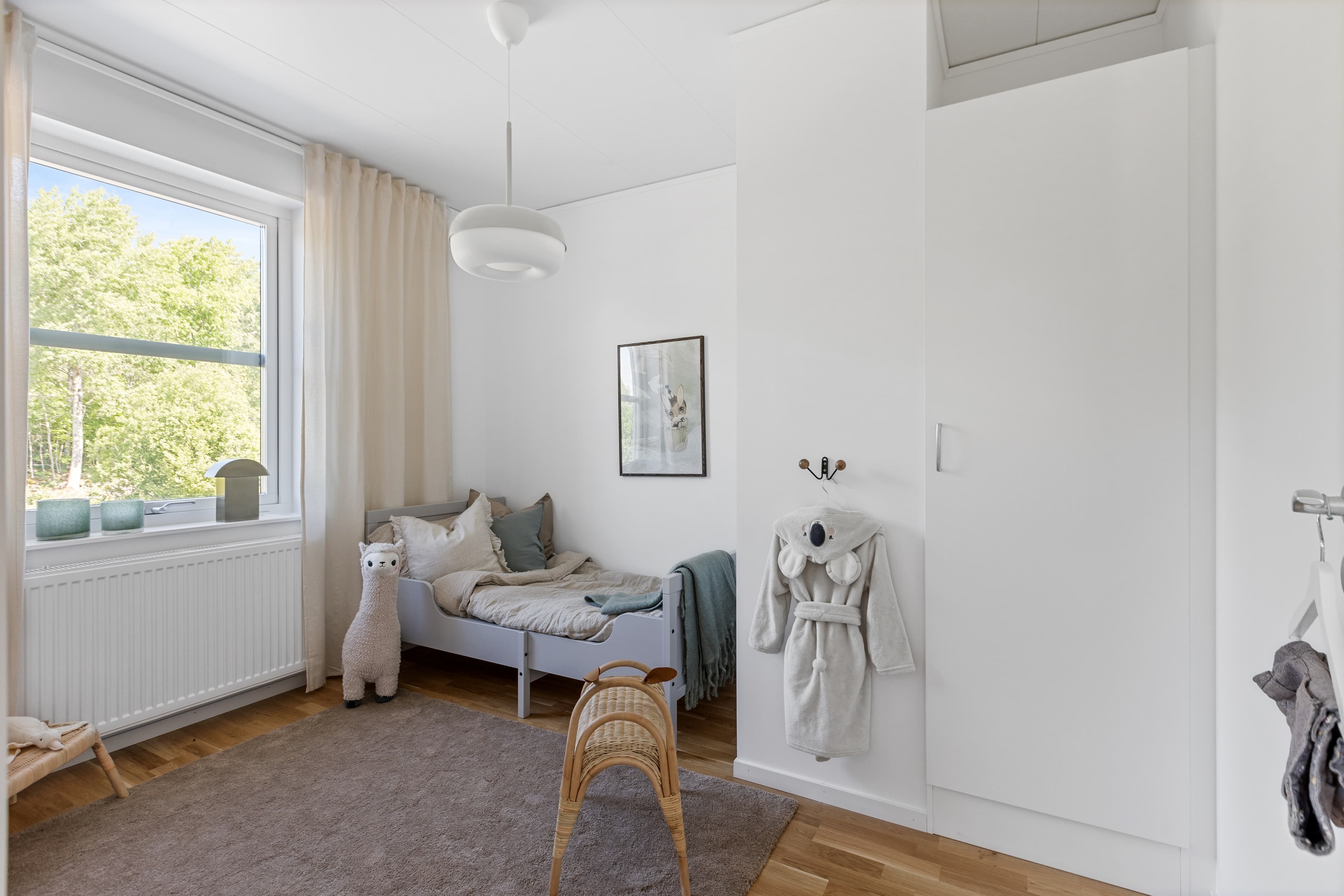 Nu fortsätter vi upp för trappan. Här finns husets mer privata utrymmen med två trivsamma sovrum, en mysig lek- eller kontorshörna och ett inbjudande allrum som passar perfekt för både filmkvällar och tv-spelande. Från allrummet öppnar en balkongdörr upp till en fin fransk balkong. Övervåningen bjuder också på praktiska detaljer i form av ett badrum med dusch och WC och en rejäl klädkammare. Behöver familjen ett extra sovrum? Då går det fint att göra om allrummet till ett sådant som tillval, läs mer om det i tillvalsbroschyren.