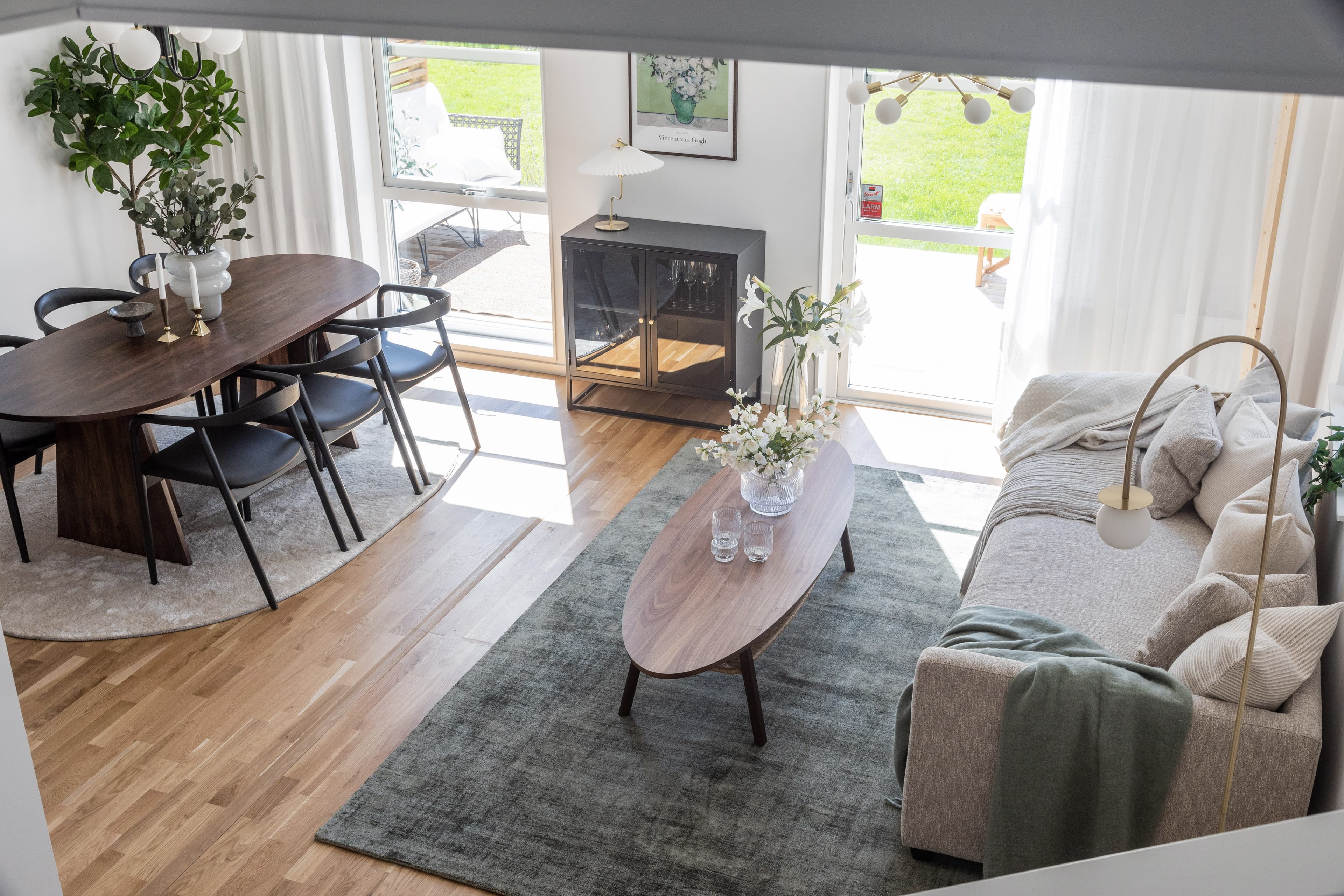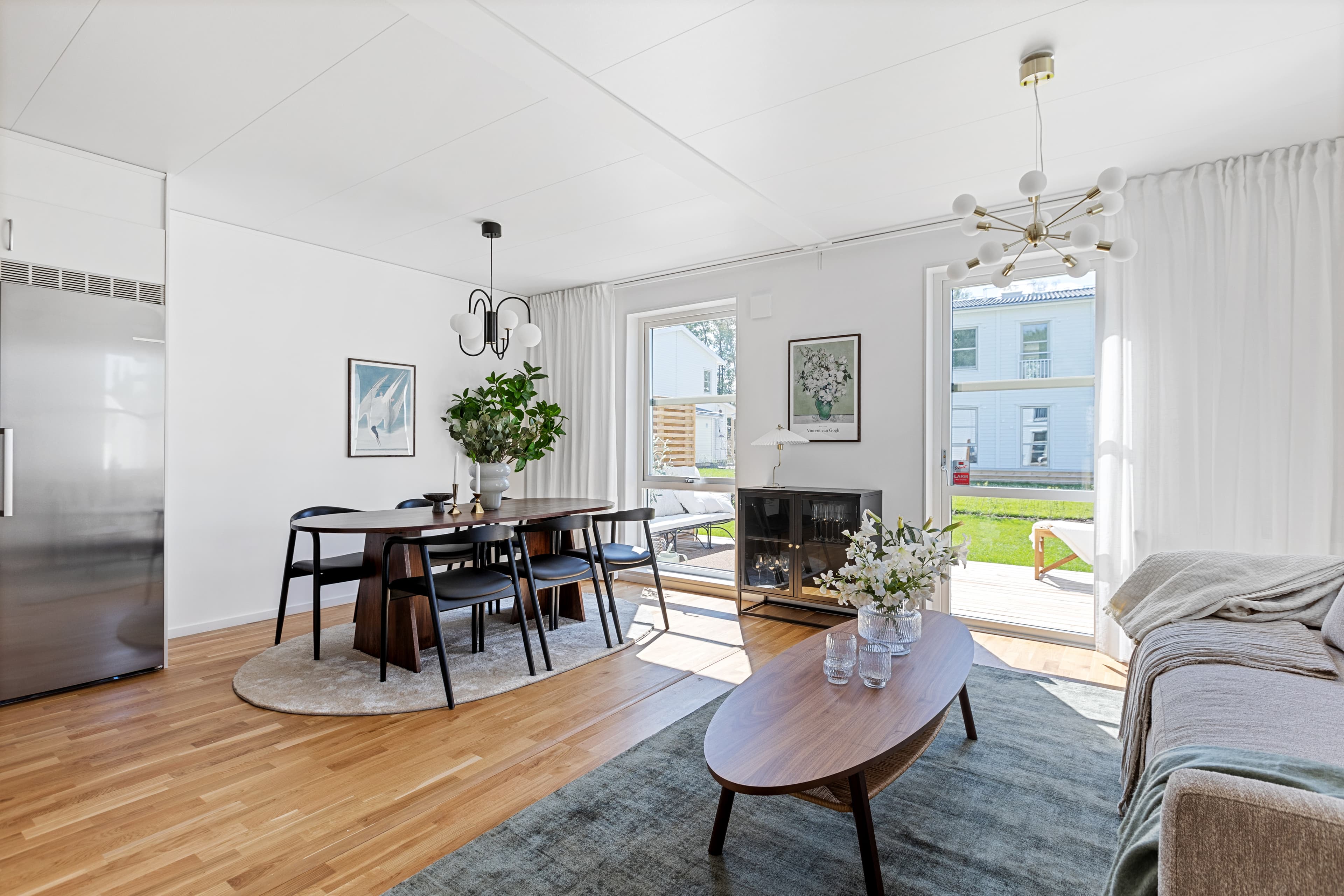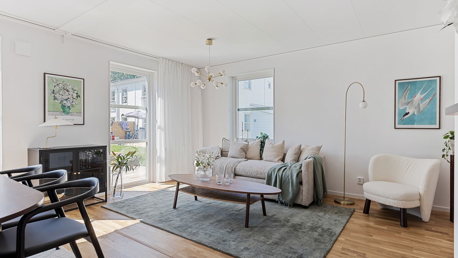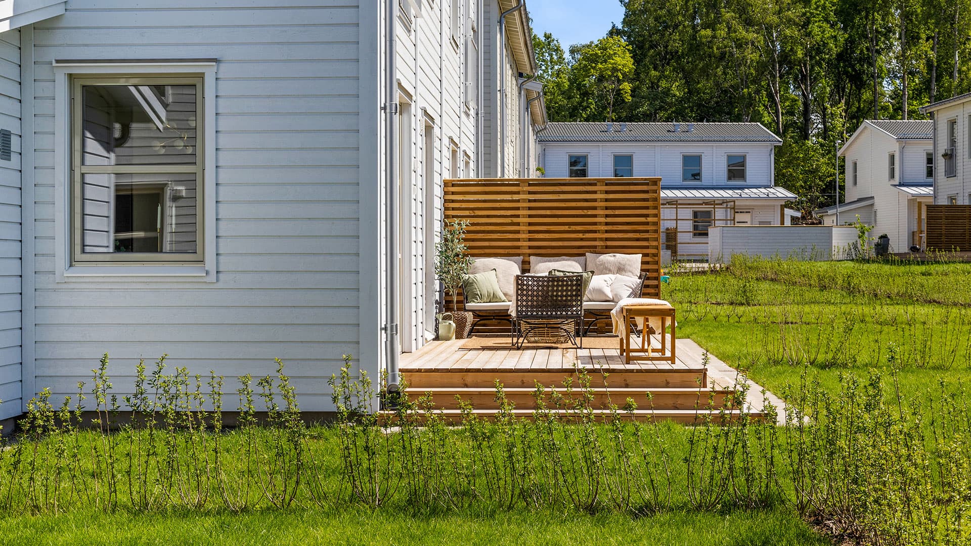 Sedan tar en härlig yta vid, med social öppen planlösning mellan kök och vardagsrum. Den ljusa och luftiga vardagsrumsdelen har gott om plats för både matbord och soffmys. Härifrån kliver du också ut på din stora altan med trädäck där det finns plats för alla tänkbara trevligheter: från familjefrukostar till släktkalas – och alla sommarens grillkvällar, såklart.