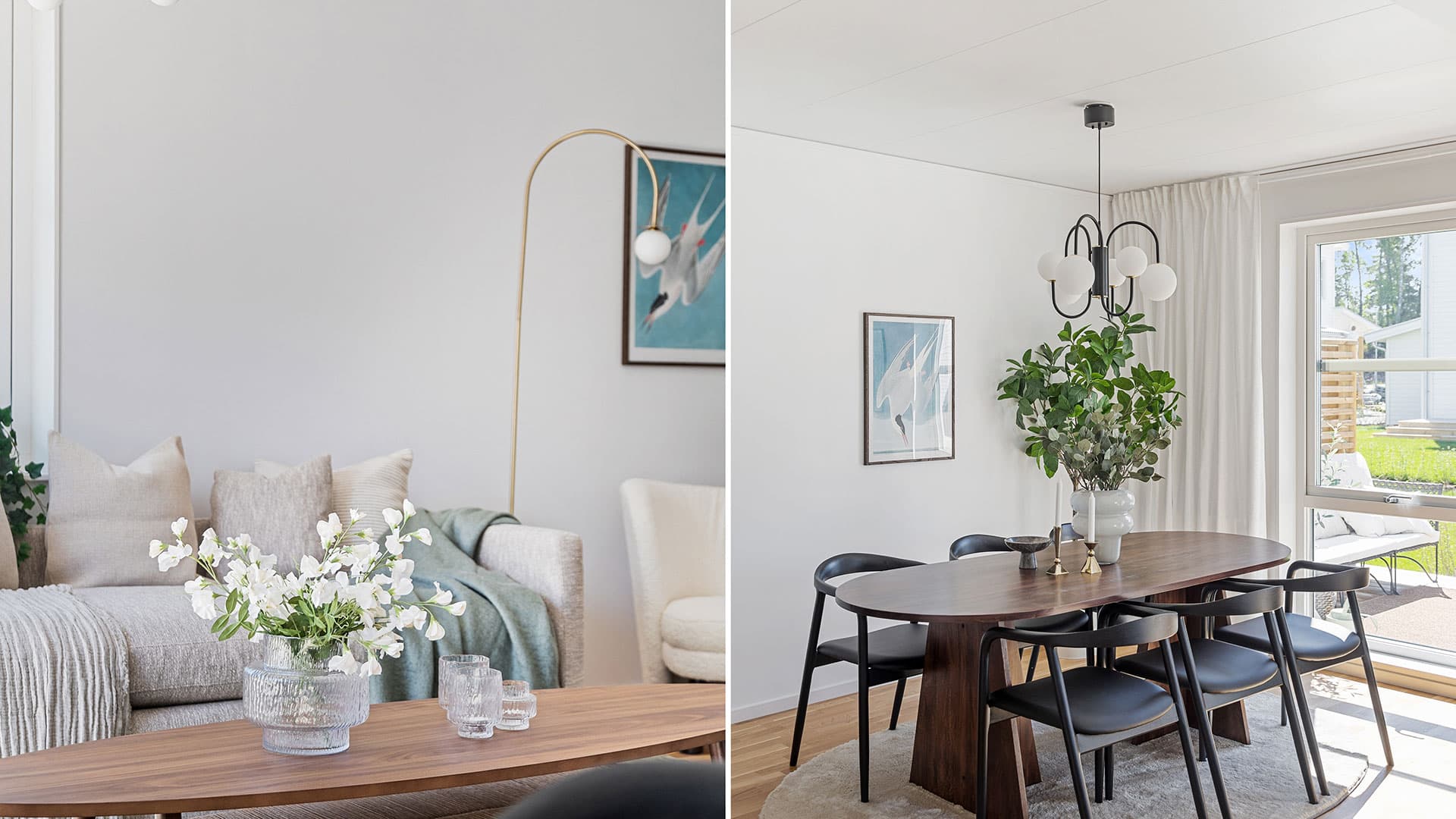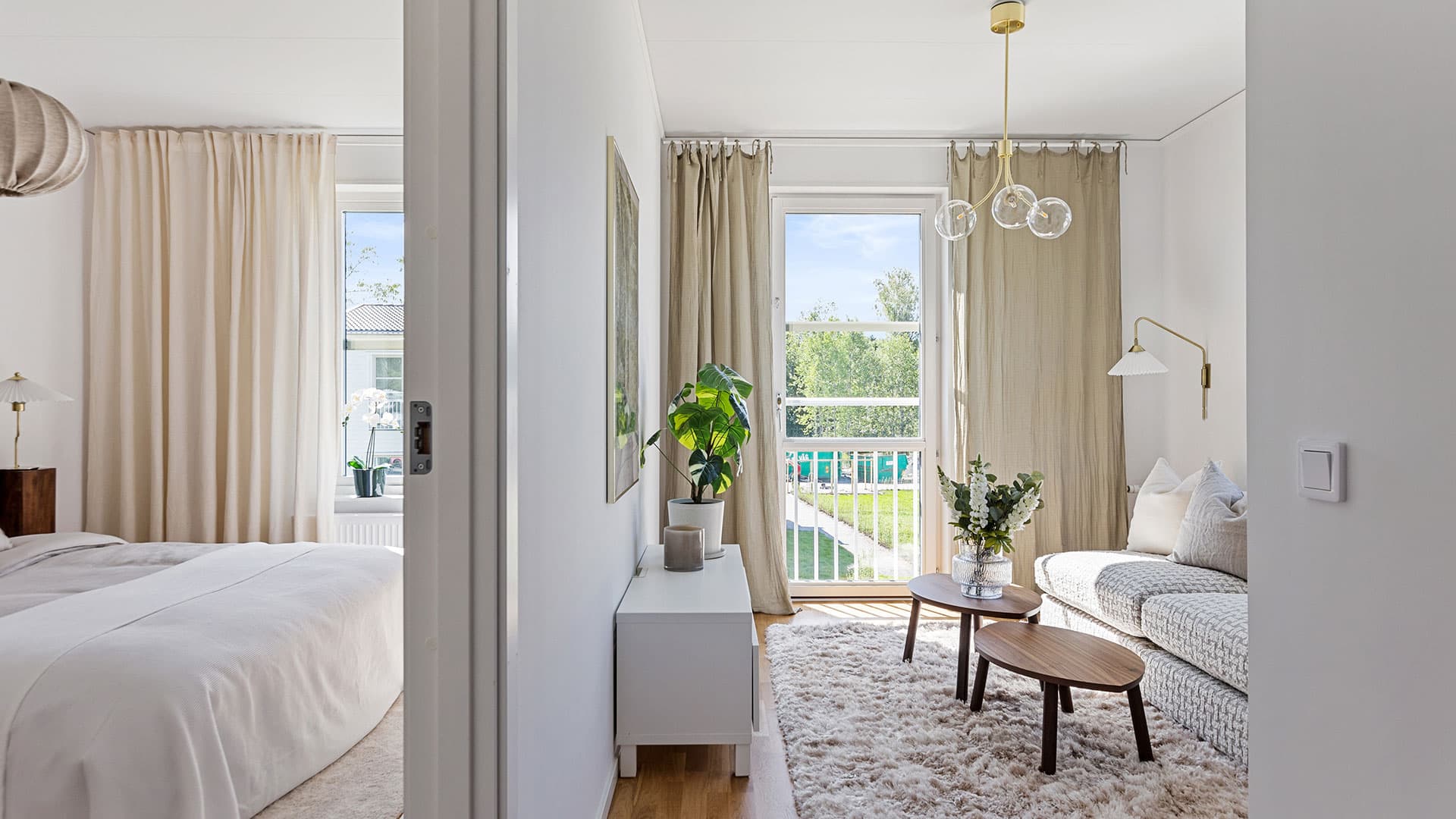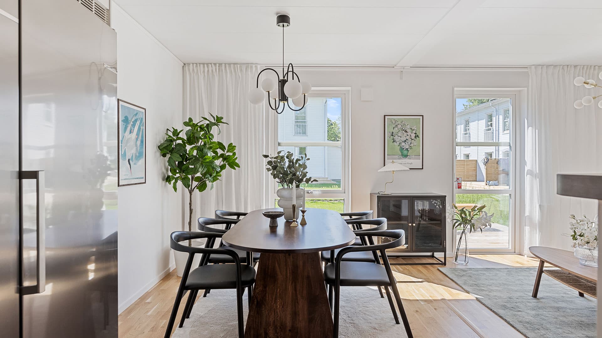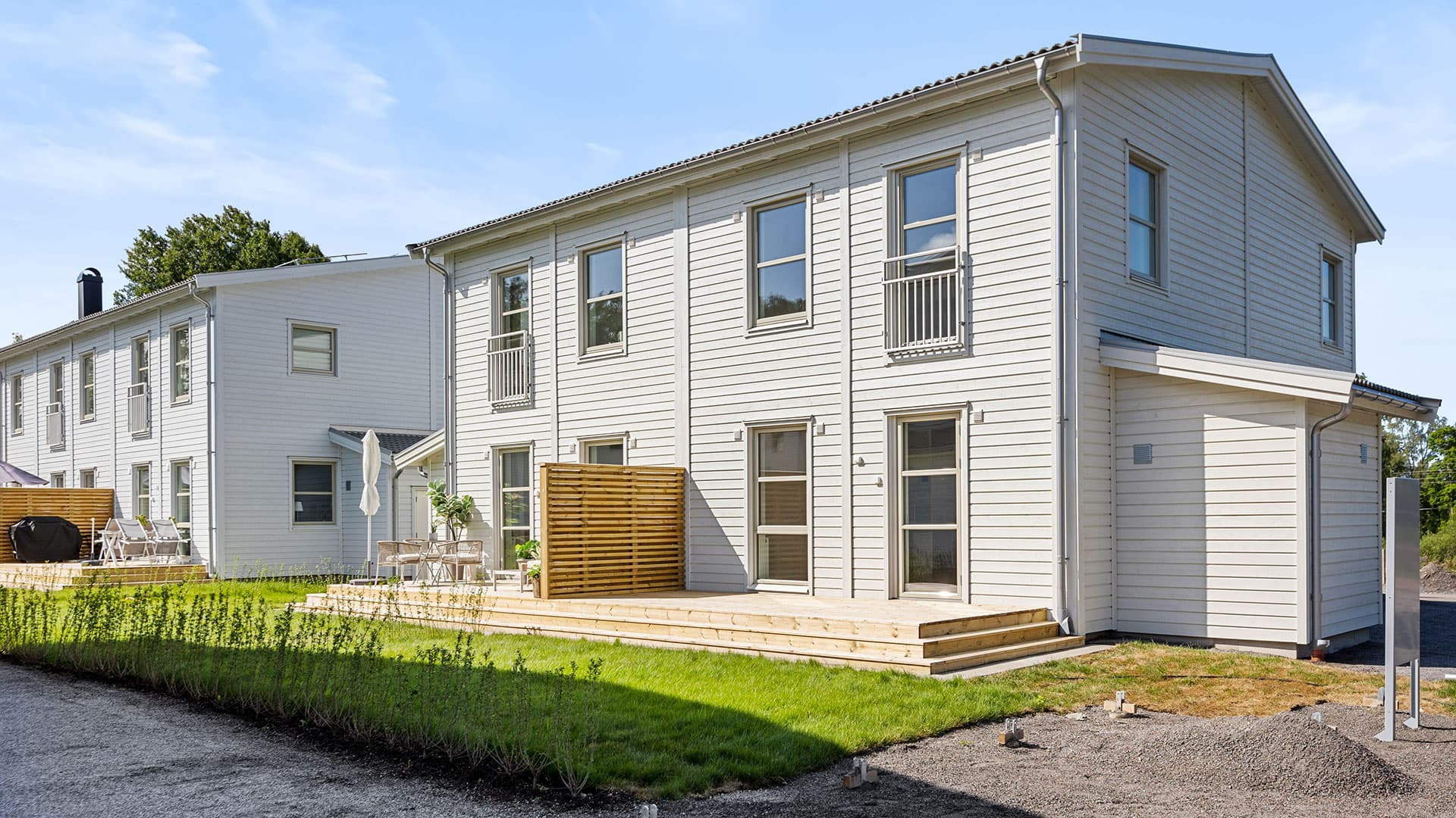Sedan tar en härlig yta vid, med social öppen planlösning mellan kök och vardagsrum. Den ljusa och luftiga vardagsrumsdelen har gott om plats för både matbord och soffmys. Härifrån kliver du också ut på din stora altan med trädäck där det finns plats för alla tänkbara trevligheter: från familjefrukostar till släktkalas – och alla sommarens grillkvällar, såklart.