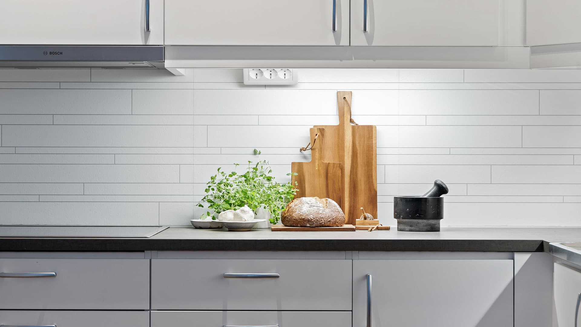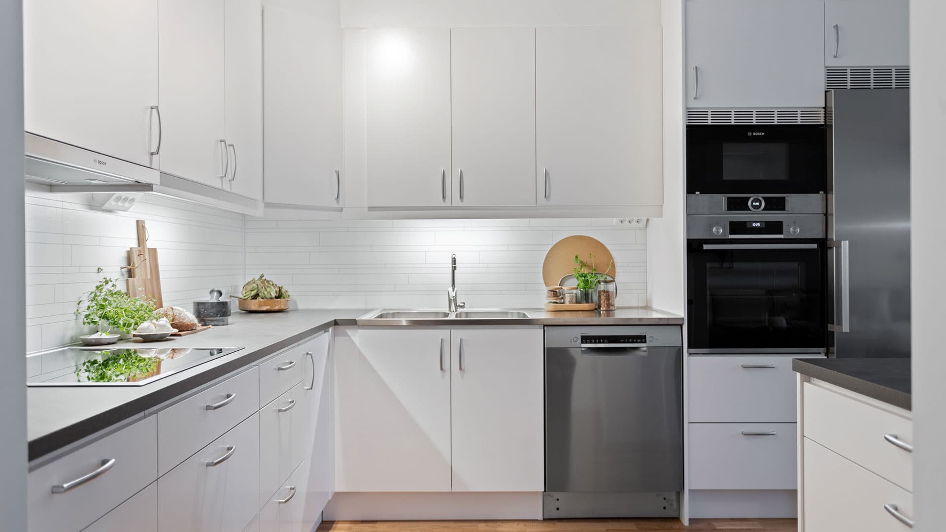 Det moderna köket är helt öppet mot vardagsrumsdelen, förutom en inbjudande liten bardisk som blir en perfekt sittplats när du vill hålla kocken sällskap. Dessutom är det utrustat för alla tänkbara matlagningsäventyr. Här finns fullstor kyl och frys, ugn, glaskeramikhäll, mikrovågsugn, diskmaskin och fina arbetsytor.