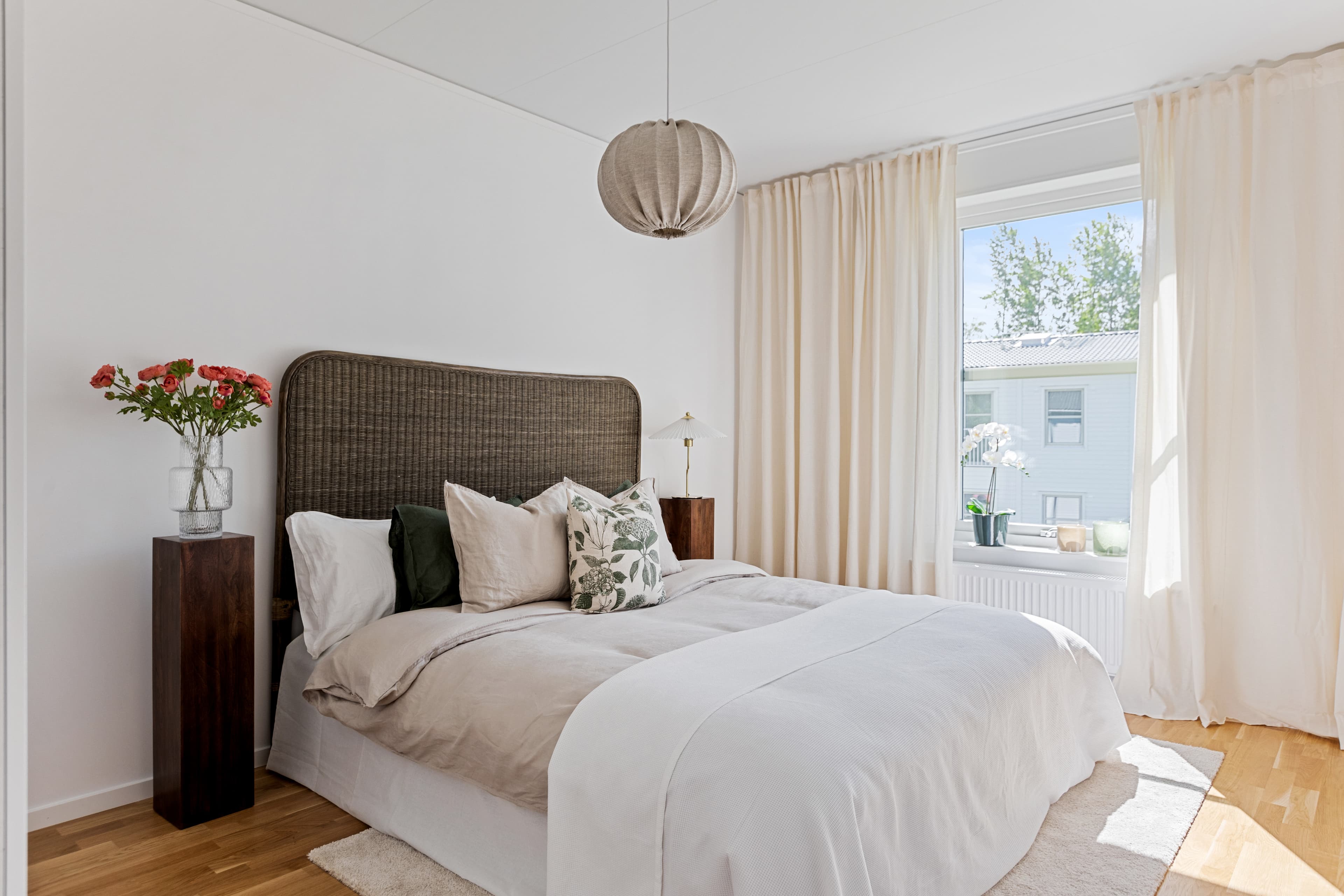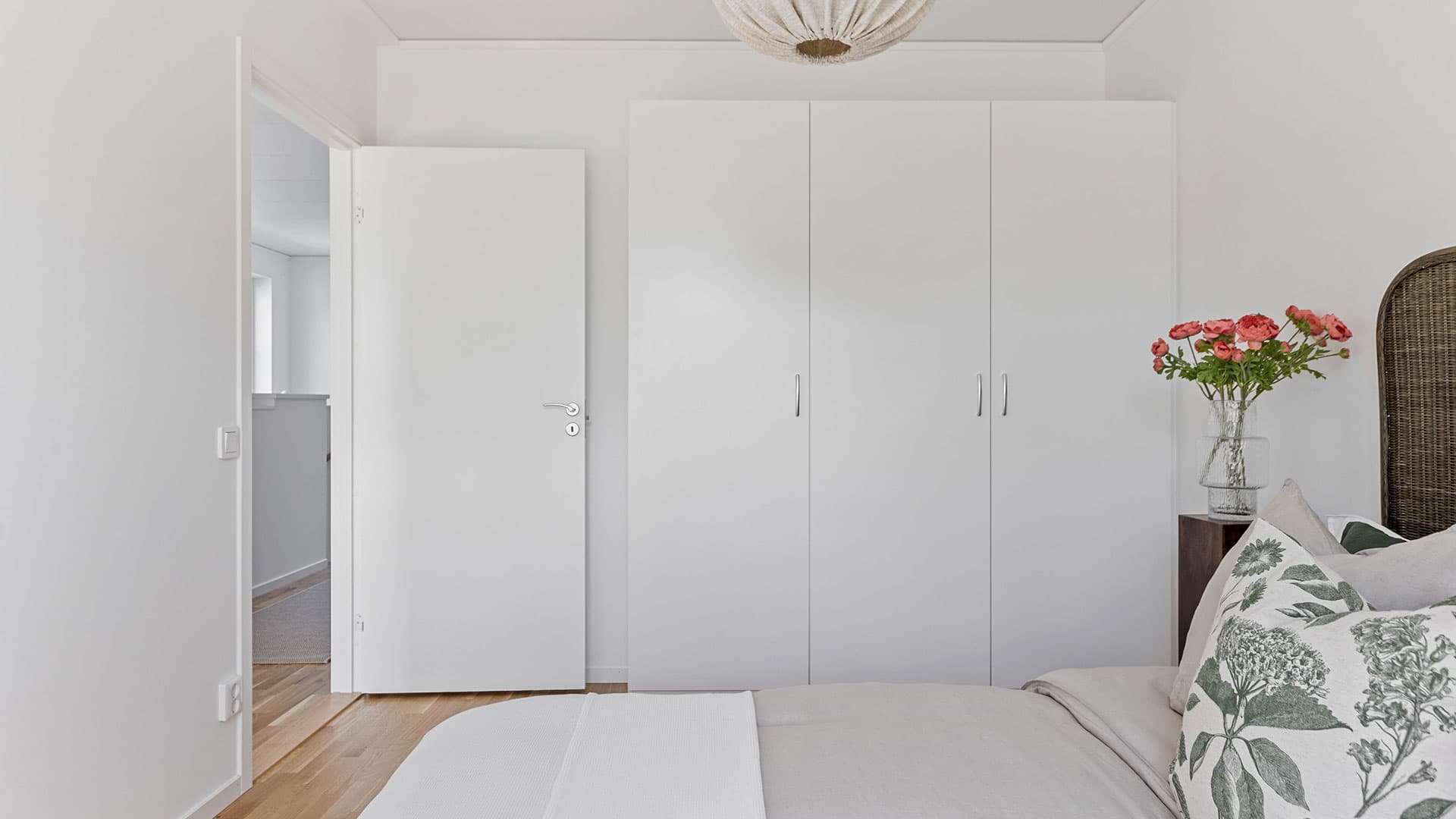 Fast innan vi kliver in pausar vi den trevliga uteplatsen vid entrén som bara väntar på att invigas. Kanske passar en liten cafégrupp fint här? Precis innanför dörren hittar vi sedan ingången till ett av husets sovrum. Ett perfekt rum för familjens tonåring som värnar om sitt privatliv, ett trevligt gästrum – eller varför inte ditt hemmakontor? Här finns också husets ena badrum med WC och dusch, liksom tvättmaskin och torktumlare för bekvämlighetens skull. Och på tal om bekvämligheter, så bjuds vi även på fina förvaringsmöjligheter med ett förråd under trappan och en praktisk klädkammare.
