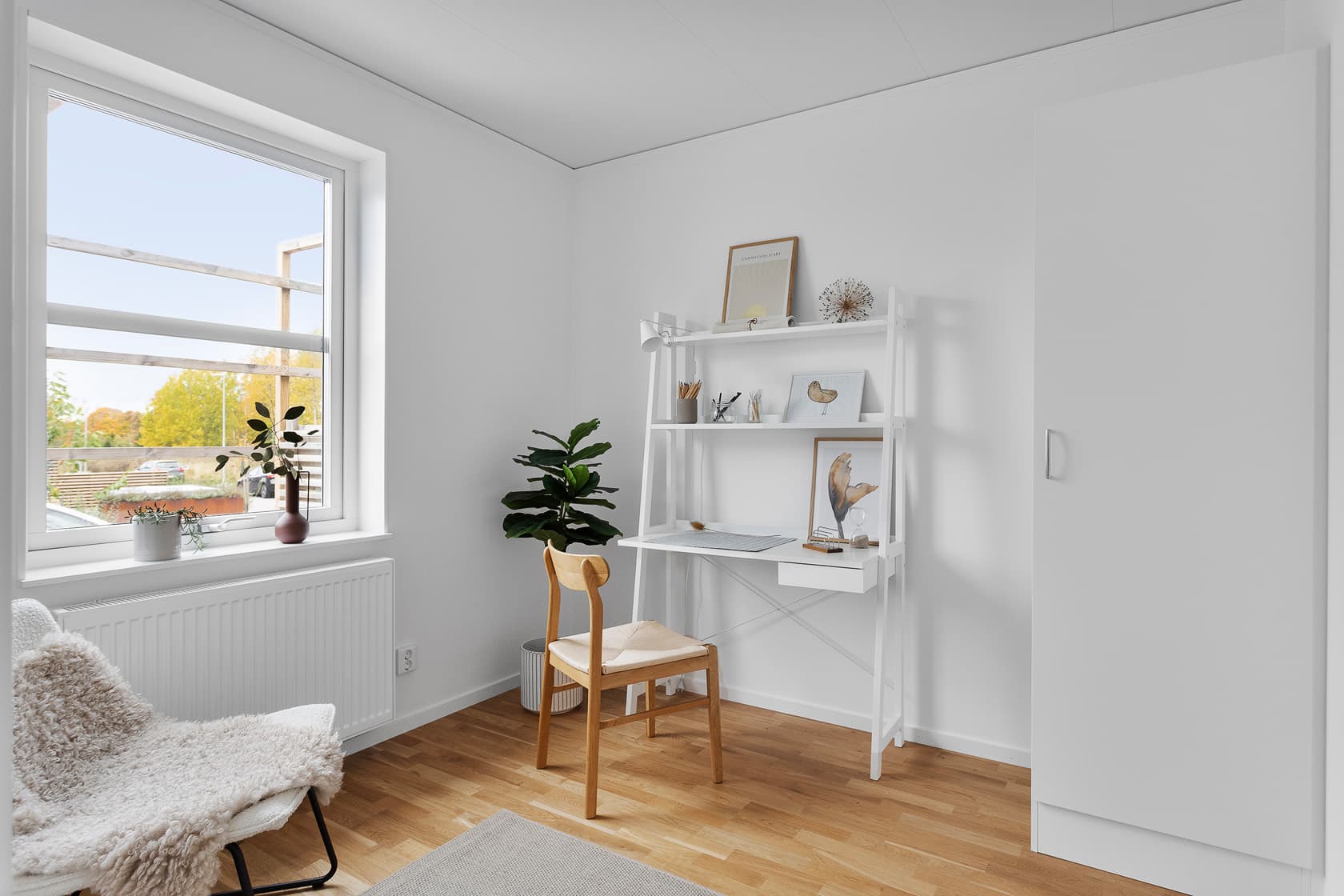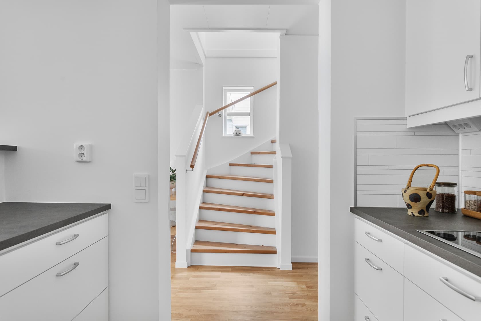 Fast innan vi kliver in pausar vi den trevliga uteplatsen vid entrén som bara väntar på att invigas. Kanske passar en liten cafégrupp fint här? Precis innanför dörren hittar vi sedan ingången till ett av husets sovrum. Ett perfekt rum för familjens tonåring som värnar om sitt privatliv, ett trevligt gästrum – eller varför inte ditt hemmakontor? Här finns också husets ena badrum med WC och dusch, liksom tvättmaskin och torktumlare för bekvämlighetens skull. Och på tal om bekvämligheter, så bjuds vi även på fina förvaringsmöjligheter med ett förråd under trappan och en praktisk klädkammare.