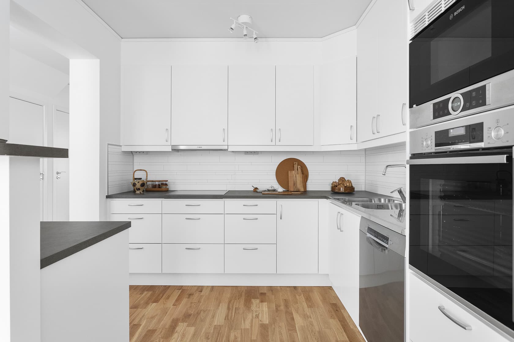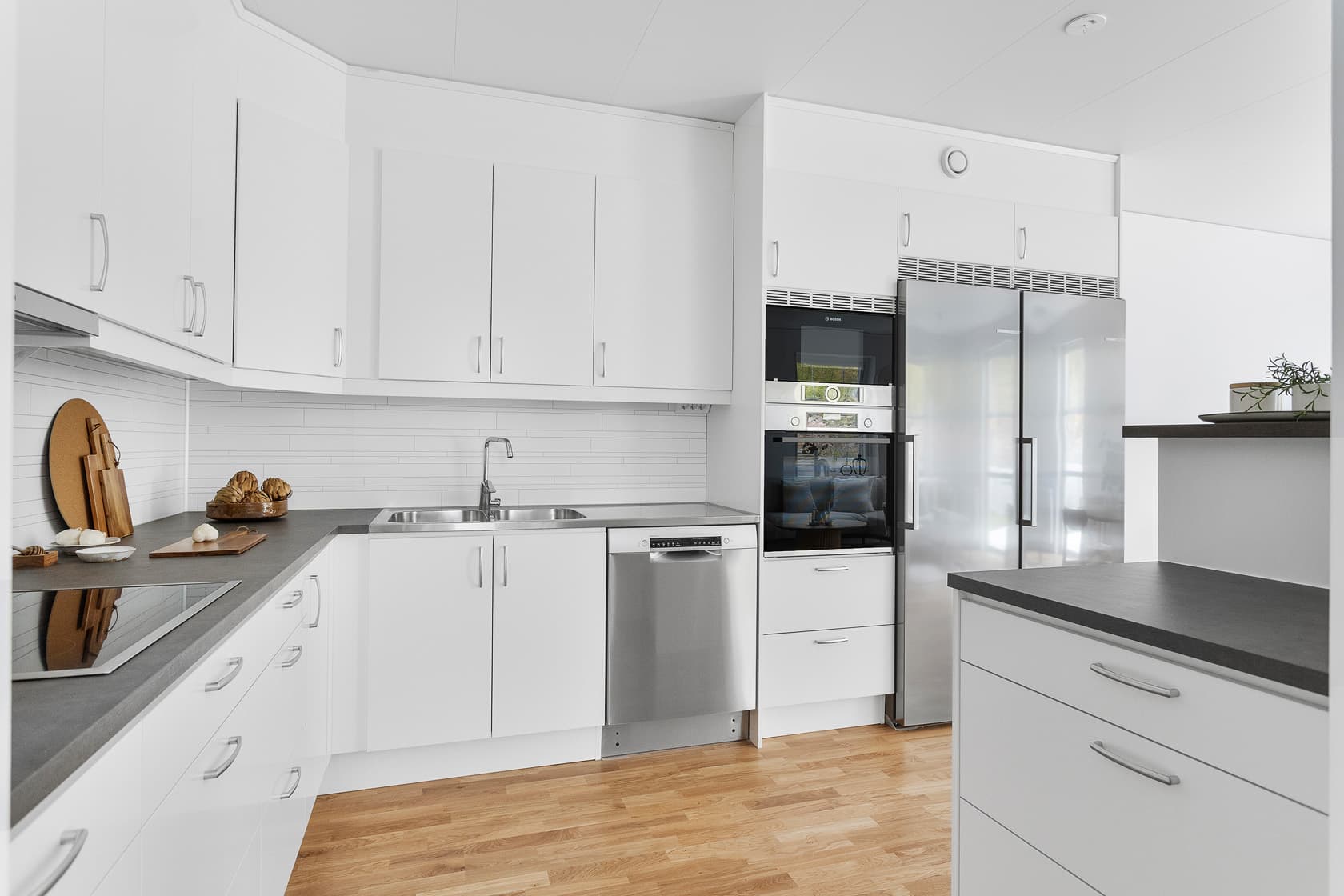 Det moderna köket är helt öppet mot vardagsrumsdelen, förutom en inbjudande liten bardisk som blir en perfekt sittplats när du vill hålla kocken sällskap. Dessutom är det utrustat för alla tänkbara matlagningsäventyr. Här finns fullstor kyl och frys, ugn, glaskeramikhäll, mikrovågsugn, diskmaskin och fina arbetsytor.