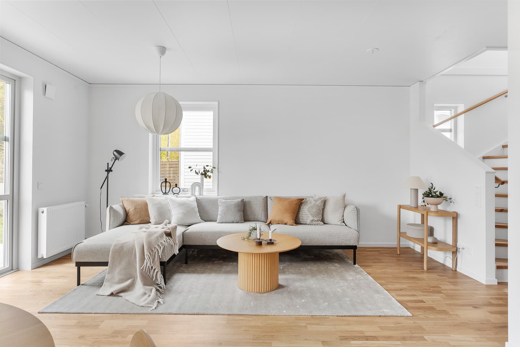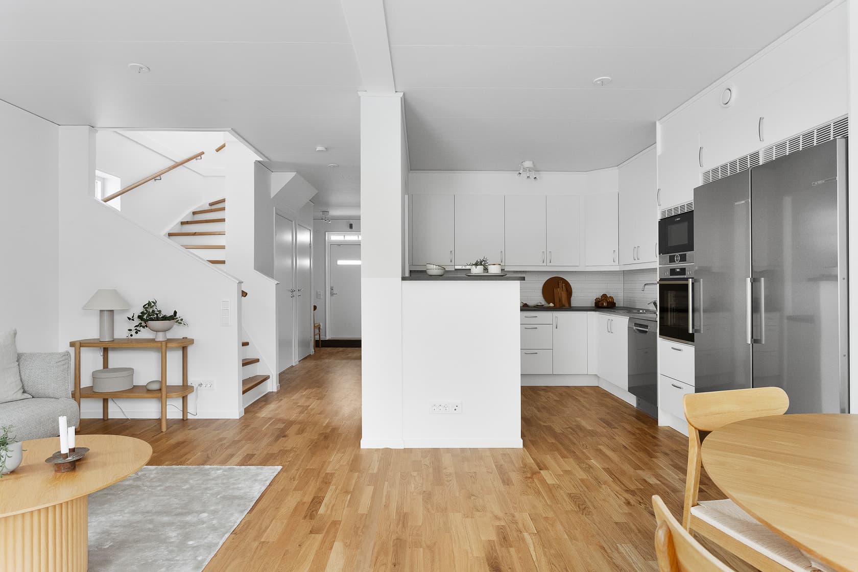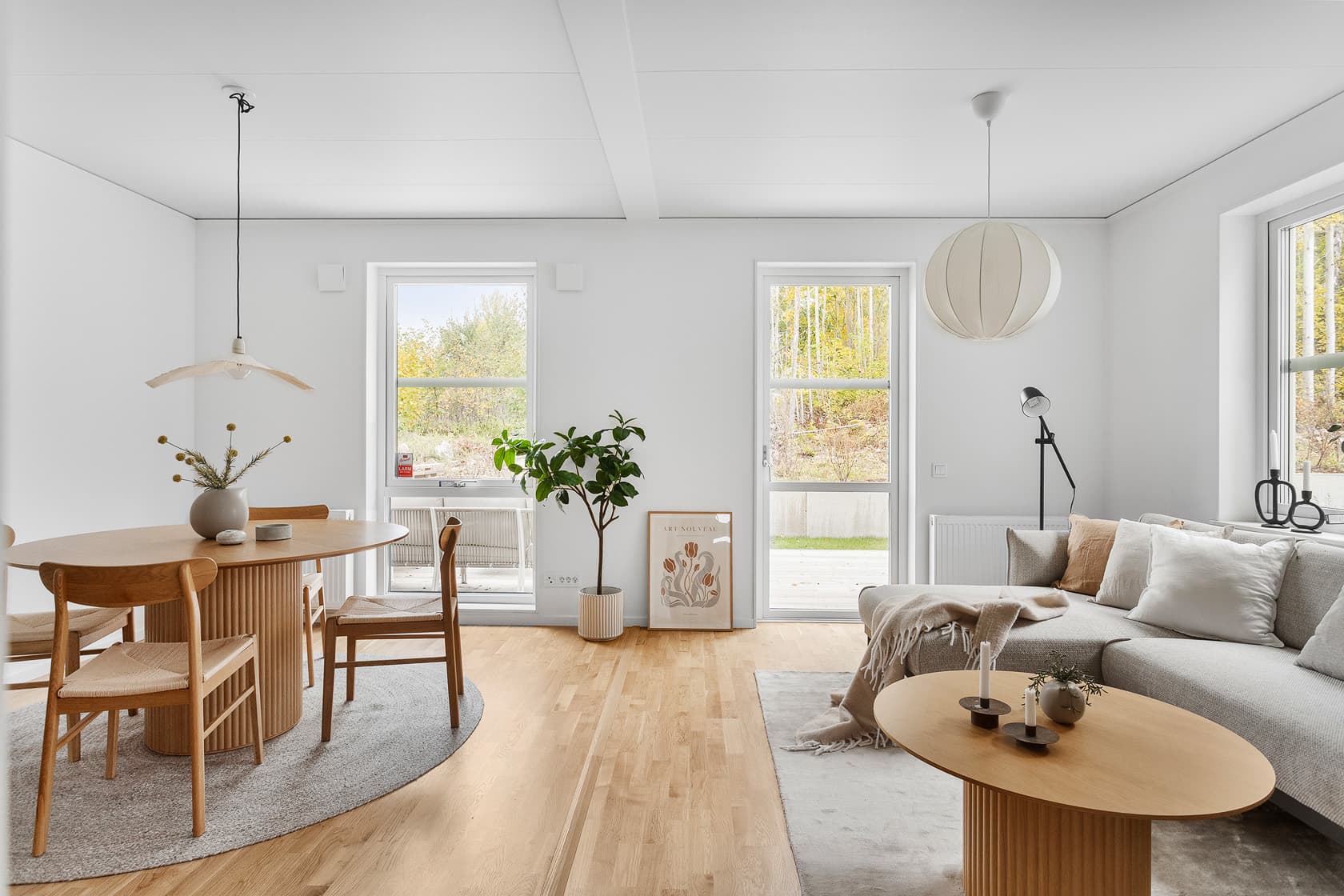 Sedan tar en härlig yta vid, med social öppen planlösning mellan kök och vardagsrum. Den ljusa och luftiga vardagsrumsdelen har gott om plats för både matbord och soffmys. Härifrån kliver du också ut på din stora altan med trädäck där det finns plats för alla tänkbara trevligheter: från familjefrukostar till släktkalas – och alla sommarens grillkvällar, såklart.