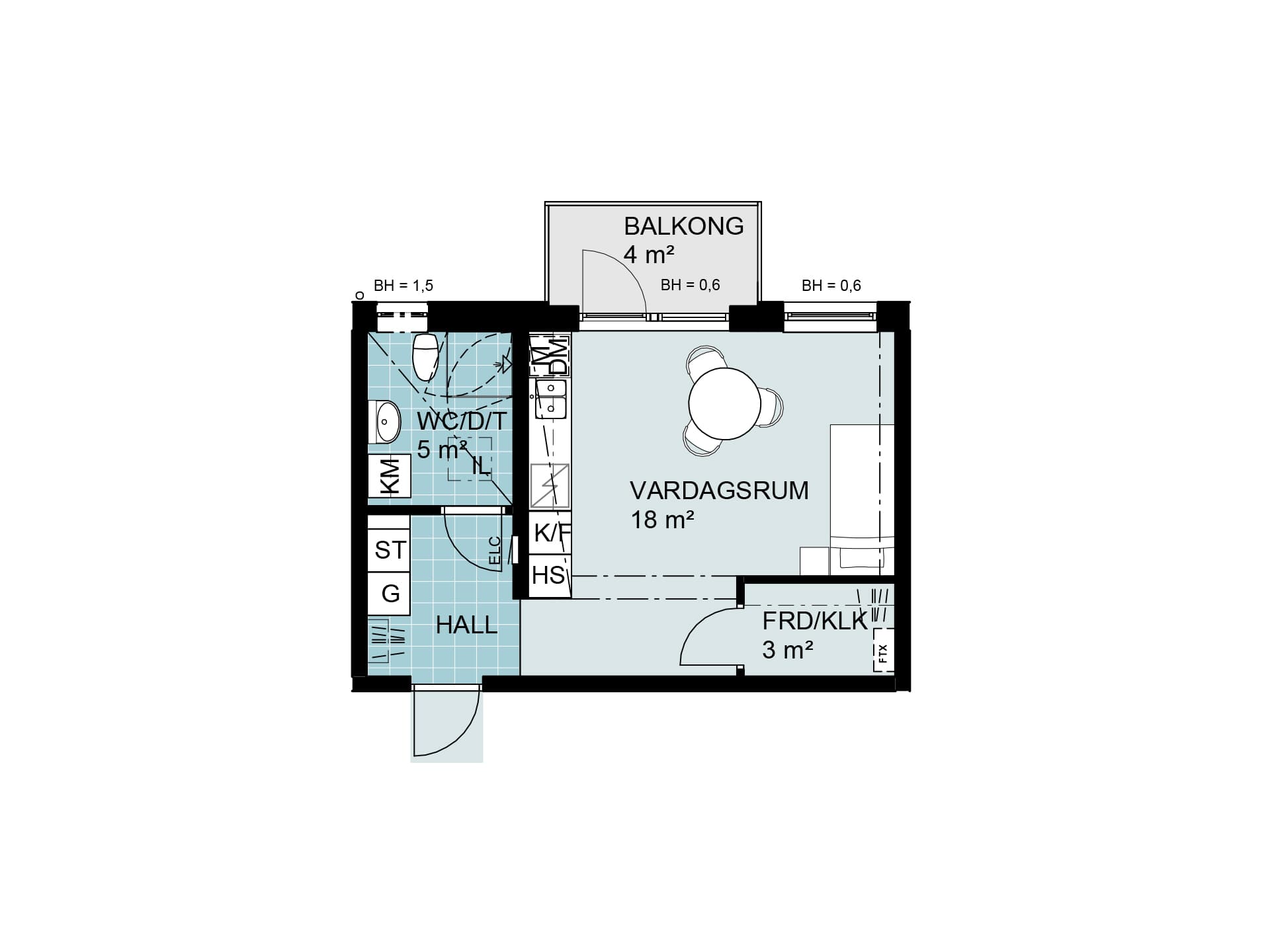 Vi går vidare in mot kök/vardagsrum där vi hittar utgången mot den lättmöblerade balkongen eller uteplatsen, och strax intill blir den perfekta platsen för matbord. Här får du njuta av en fin och öppen planlösning. Även om ytan är begränsad har vi inte kompromissat med funktionen. Köket är fullt utrustat med inredning från Marbodal och vitvaror från Siemens, och självklart finns det diskmaskin!