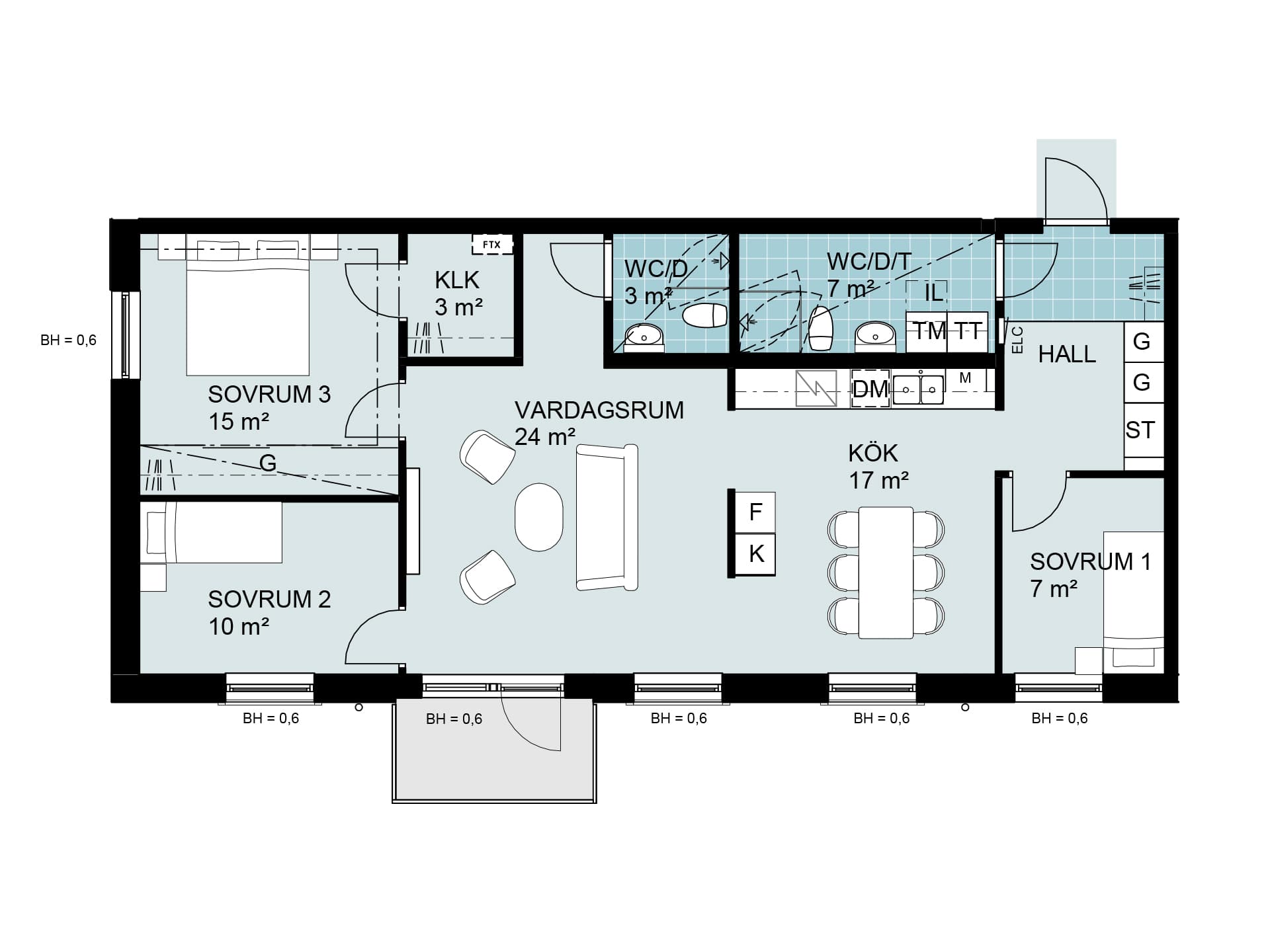 Här får du njuta av en fin öppen planlösning mellan kök och vardagsrum. Vardagsrumsdelen är både ljus och trivsam – här får du plats med soffa och fåtöljer utan problem. Om du väljer att flytta in på bottenvåningen har du också utgång till din egen uteplats här, på de övre våningarna har du i stället en fin balkong.