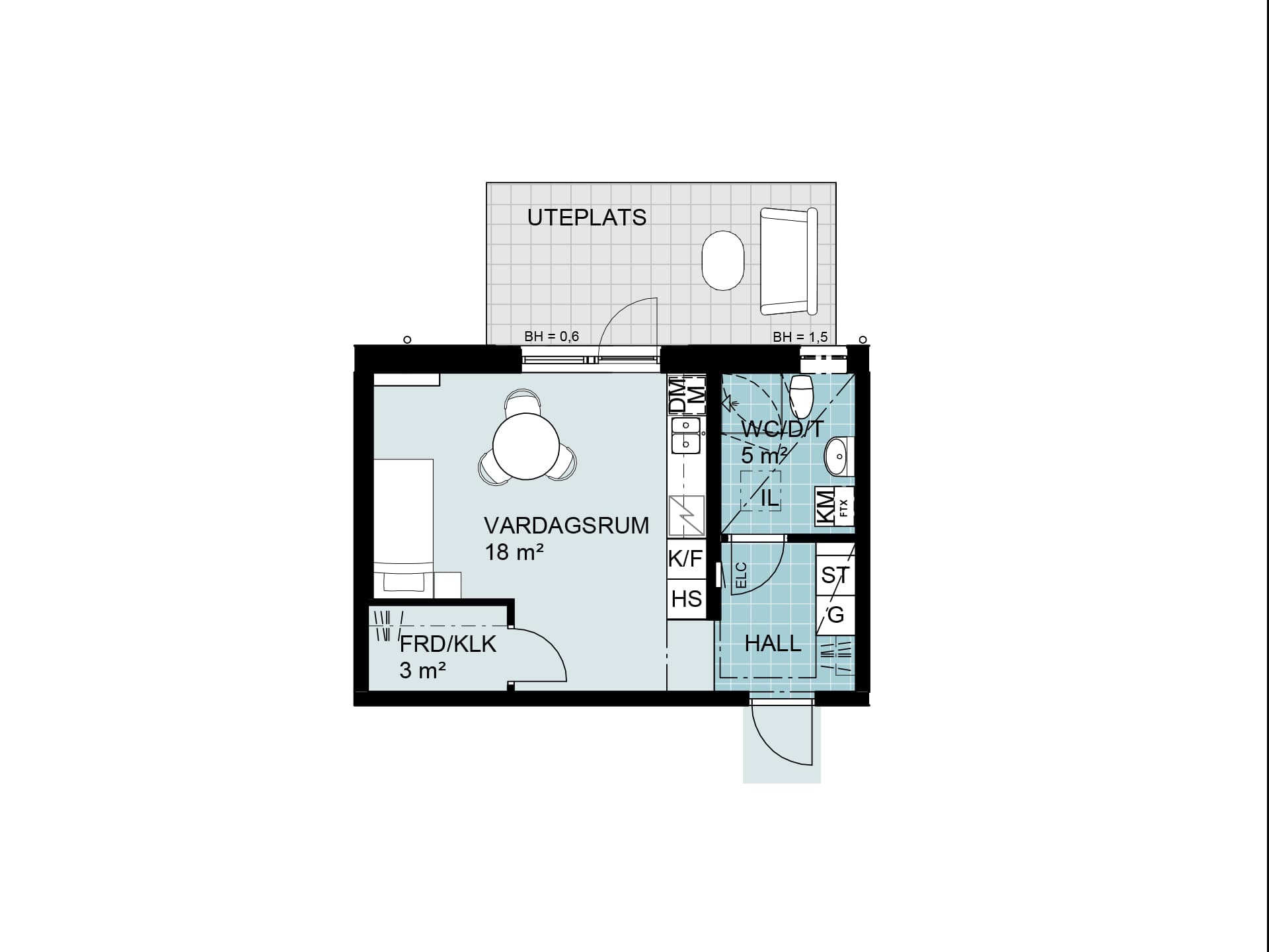 Vi går vidare in mot kök/vardagsrum där vi hittar utgången mot den lättmöblerade balkongen eller uteplatsen, och strax intill blir den perfekta platsen för matbord. Här får du njuta av en fin och öppen planlösning. Även om ytan är begränsad har vi inte kompromissat med funktionen. Köket är fullt utrustat med inredning från Marbodal och vitvaror från Siemens, och självklart finns det diskmaskin!