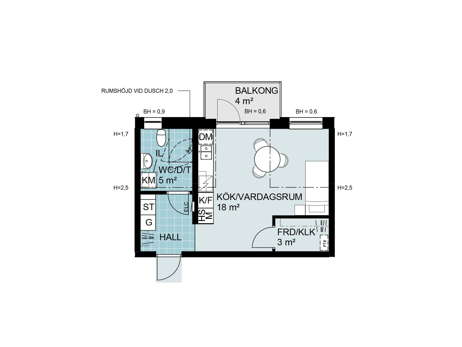 Vi går vidare in mot kök/vardagsrum där vi hittar utgången mot den lättmöblerade balkongen eller uteplatsen, och strax intill blir den perfekta platsen för matbord. Här får du njuta av en fin och öppen planlösning. Även om ytan är begränsad har vi inte kompromissat med funktionen. Köket är fullt utrustat med inredning från Marbodal och vitvaror från Siemens, och självklart finns det diskmaskin!