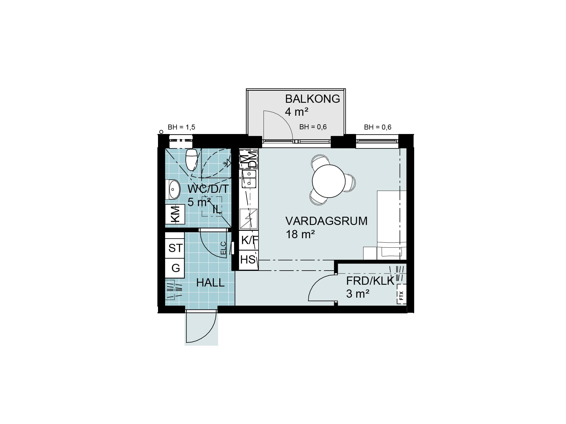 Vi går vidare in mot kök/vardagsrum där vi hittar utgången mot den lättmöblerade balkongen eller uteplatsen, och strax intill blir den perfekta platsen för matbord. Här får du njuta av en fin och öppen planlösning. Även om ytan är begränsad har vi inte kompromissat med funktionen. Köket är fullt utrustat med inredning från Marbodal och vitvaror från Siemens, och självklart finns det diskmaskin!