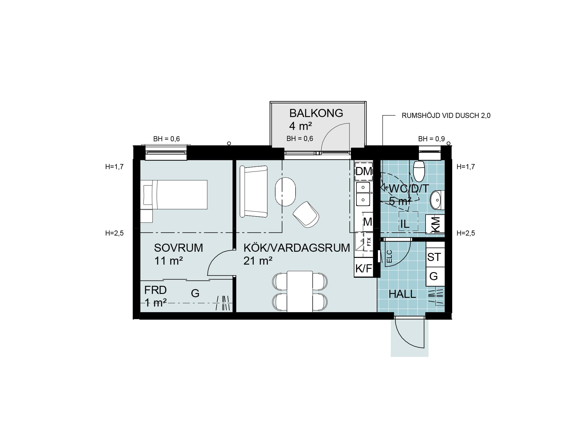 Vi går vidare in mot kök/vardagsrum där vi hittar utgången mot den lättmöblerade balkongen eller uteplatsen, och strax intill blir den perfekta platsen för matbord. Här får du njuta av en fin och öppen planlösning. Även om ytan är begränsad har vi inte kompromissat med funktionen. Köket är fullt utrustat med inredning från Marbodal och vitvaror från Siemens, och självklart finns det diskmaskin!