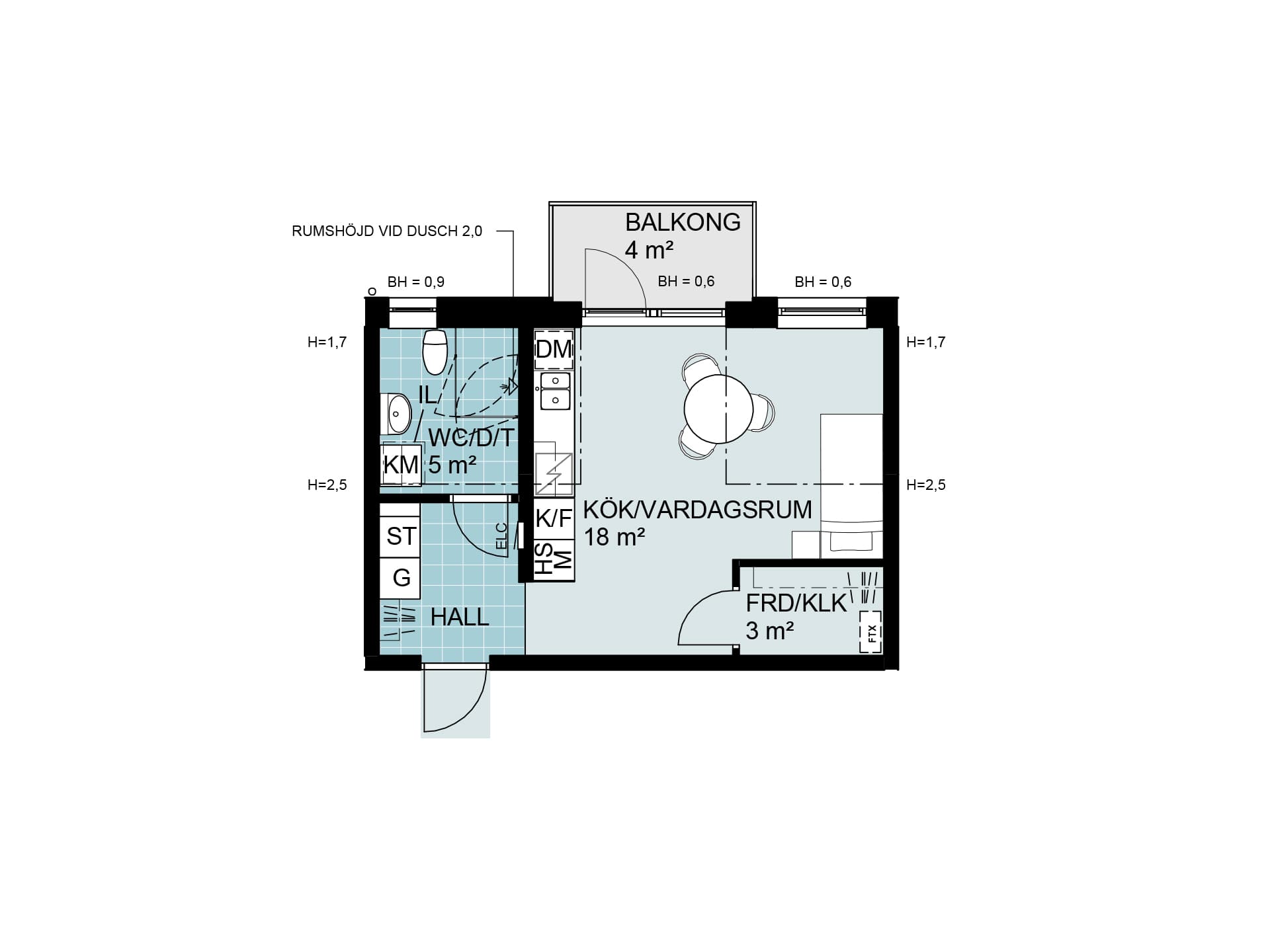 Vi går vidare in mot kök/vardagsrum där vi hittar utgången mot den lättmöblerade balkongen eller uteplatsen, och strax intill blir den perfekta platsen för matbord. Här får du njuta av en fin och öppen planlösning. Även om ytan är begränsad har vi inte kompromissat med funktionen. Köket är fullt utrustat med inredning från Marbodal och vitvaror från Siemens, och självklart finns det diskmaskin!