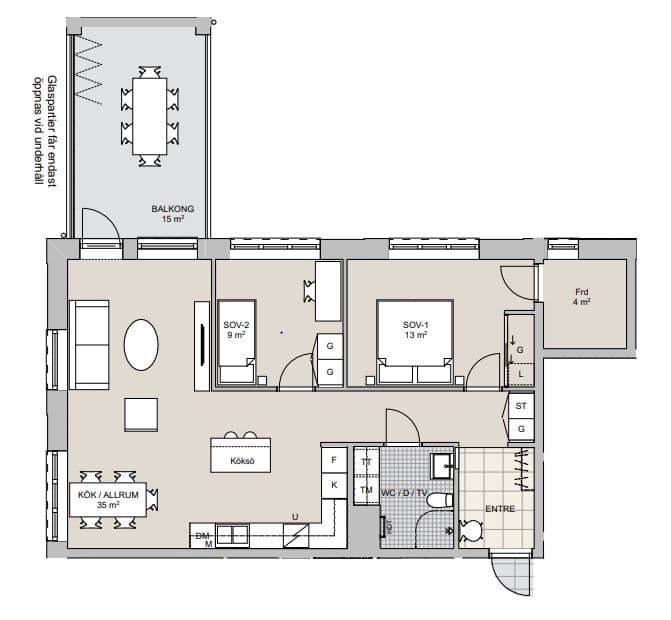 Denna trea erbjuder effektiva och välplanerade kvadratmeter. Det vita köket med sin köksö har öppen kontakt med vardagsrummet och därifrån nås den stora balkongen. Den rymliga balkongen är delvis inglasad och har utblick mot föreningens innergård.