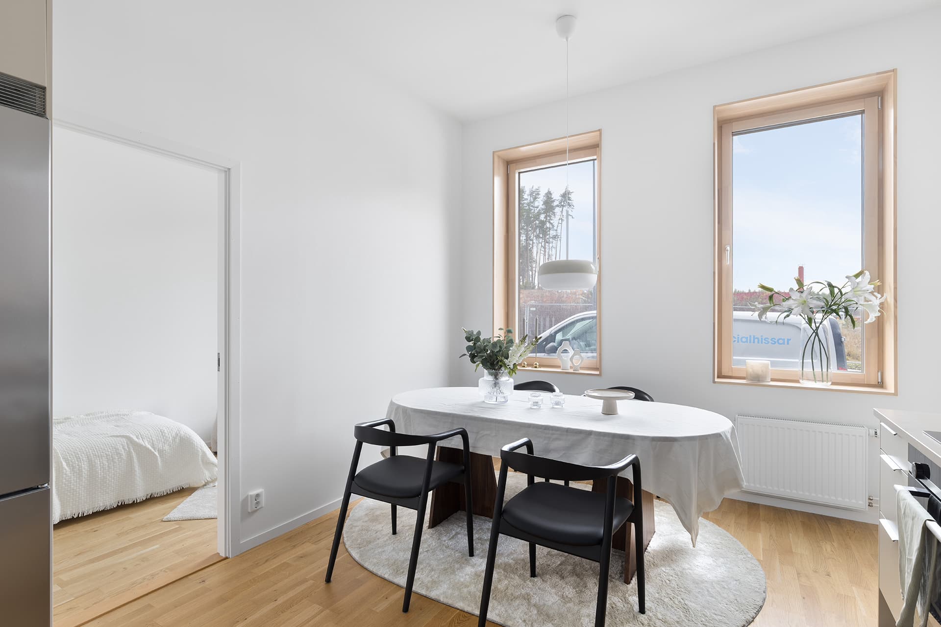Planlösningen delar upp hemmet på ett trivsamt sätt. På ena sidan hittar du det fina köket från Marbodal, komplett med Siemens vitvaror och en naturlig plats för matbordet – perfekt för både vardagsfrukostar och middagar. Här ligger också två av bostadens tre sovrum – lugna, ljusa och inbjudande.