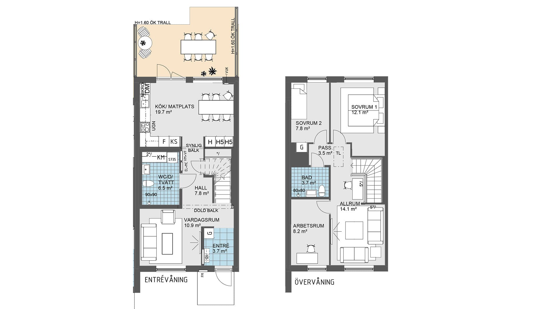 Välkommen till en välplanerad bostad med funktionella ytor. Våra tolv radhus är uppdelade i två längor med sex bostäder i vardera, alla med härliga uteplatser i sydväst- eller västläge. Hälften av radhusen har sin altan på entrésidan och hälften på baksidan.