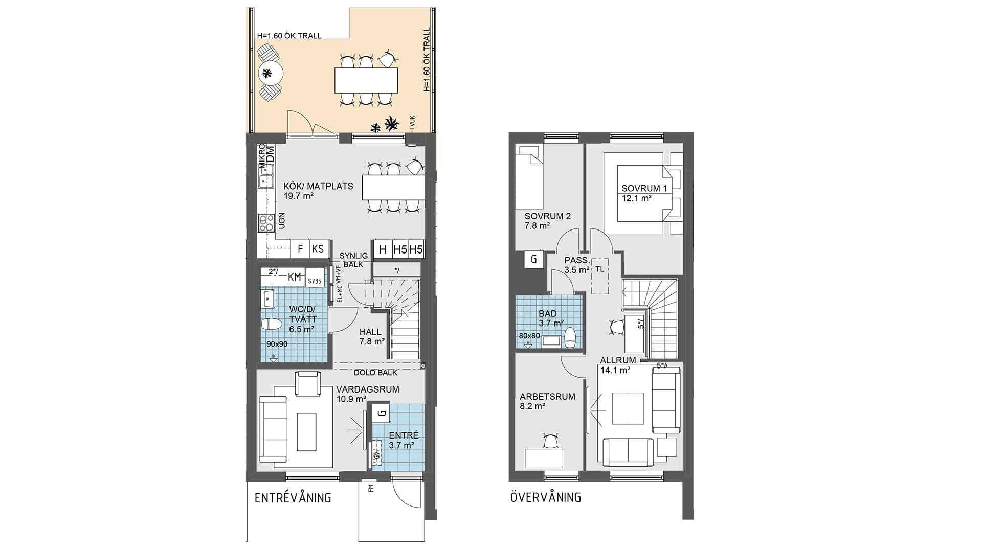 Välkommen till en välplanerad bostad med funktionella ytor. Våra tolv radhus är uppdelade i två längor med sex bostäder i vardera, alla med härliga uteplatser i sydväst- eller västläge. Hälften av radhusen har sin altan på entrésidan och hälften på baksidan.