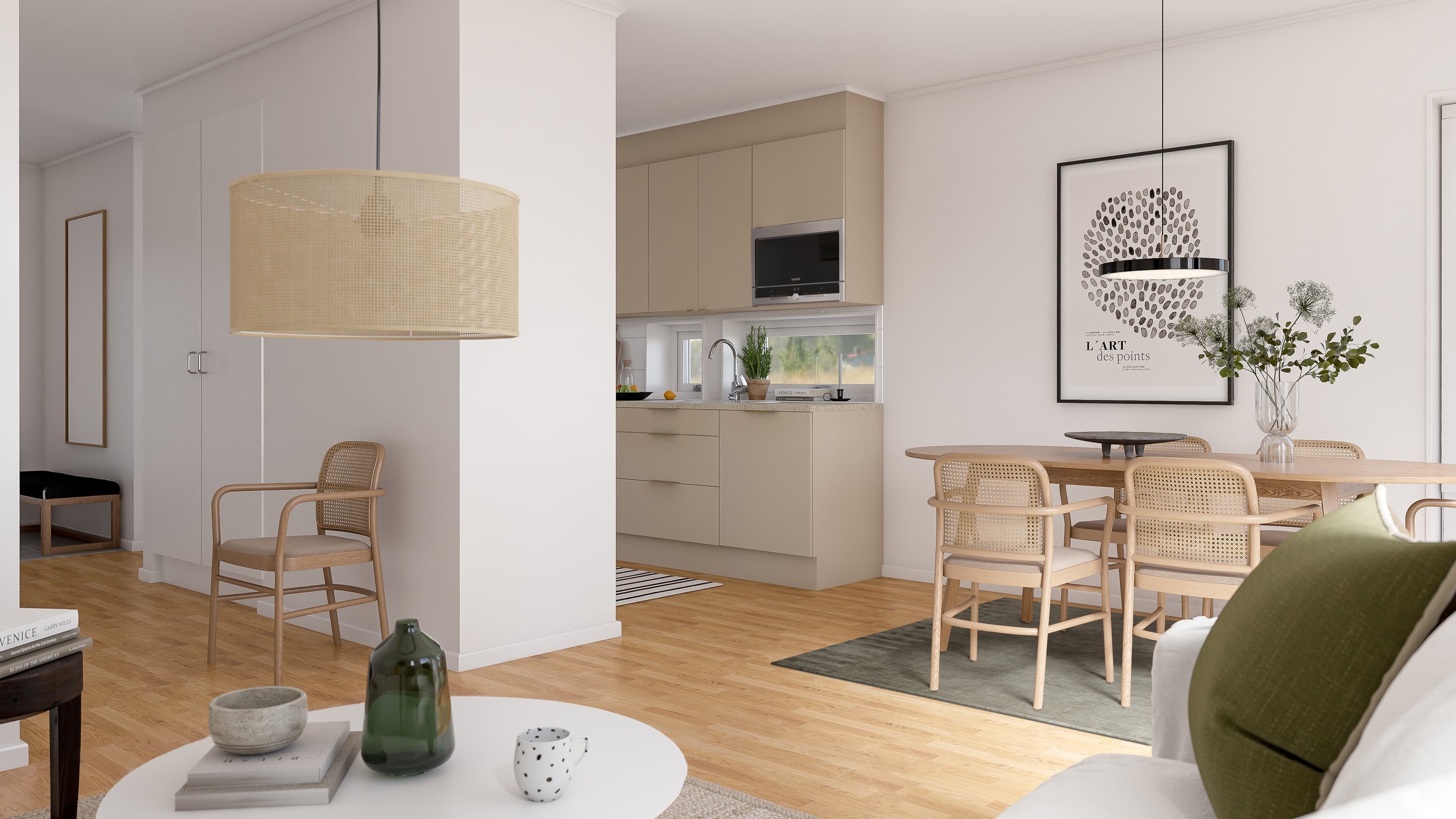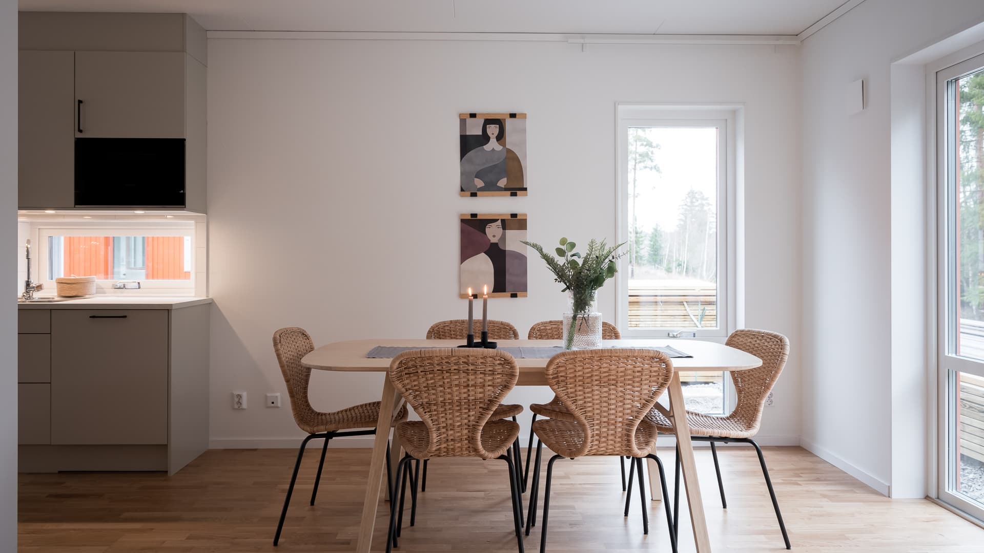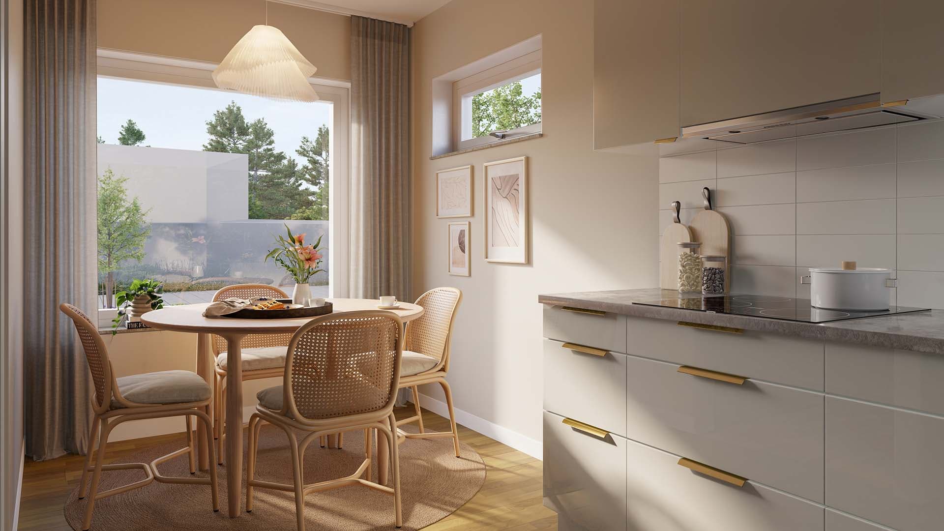 Hallen har ett fint ljusinsläpp via fönstret i dörren och gott om plats till förvaring. På ena sidan om entrén ligger ett helkaklat badrum med wc, dusch och kombimaskin med tvättmaskin och torktumlare i ett. På andra sidan ligger det luftiga köket med matplats vid fönstret och öppen planlösning till vardagsrummet.