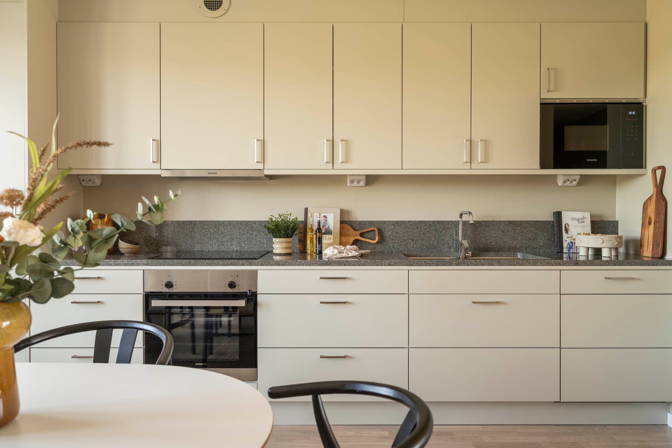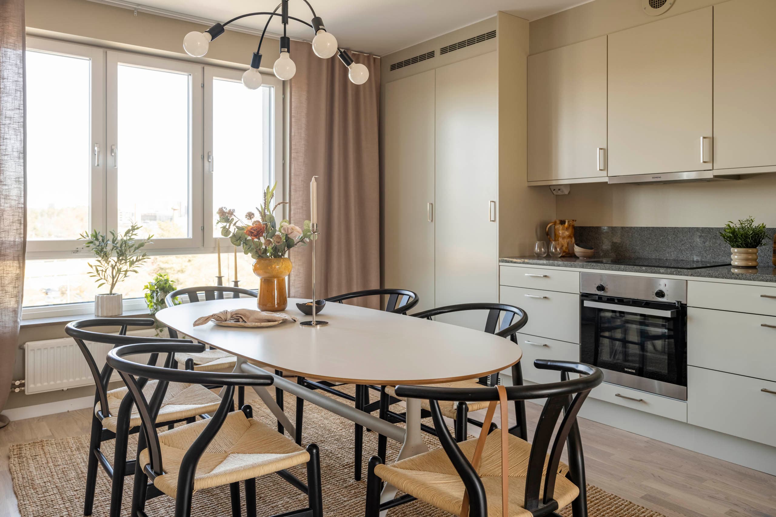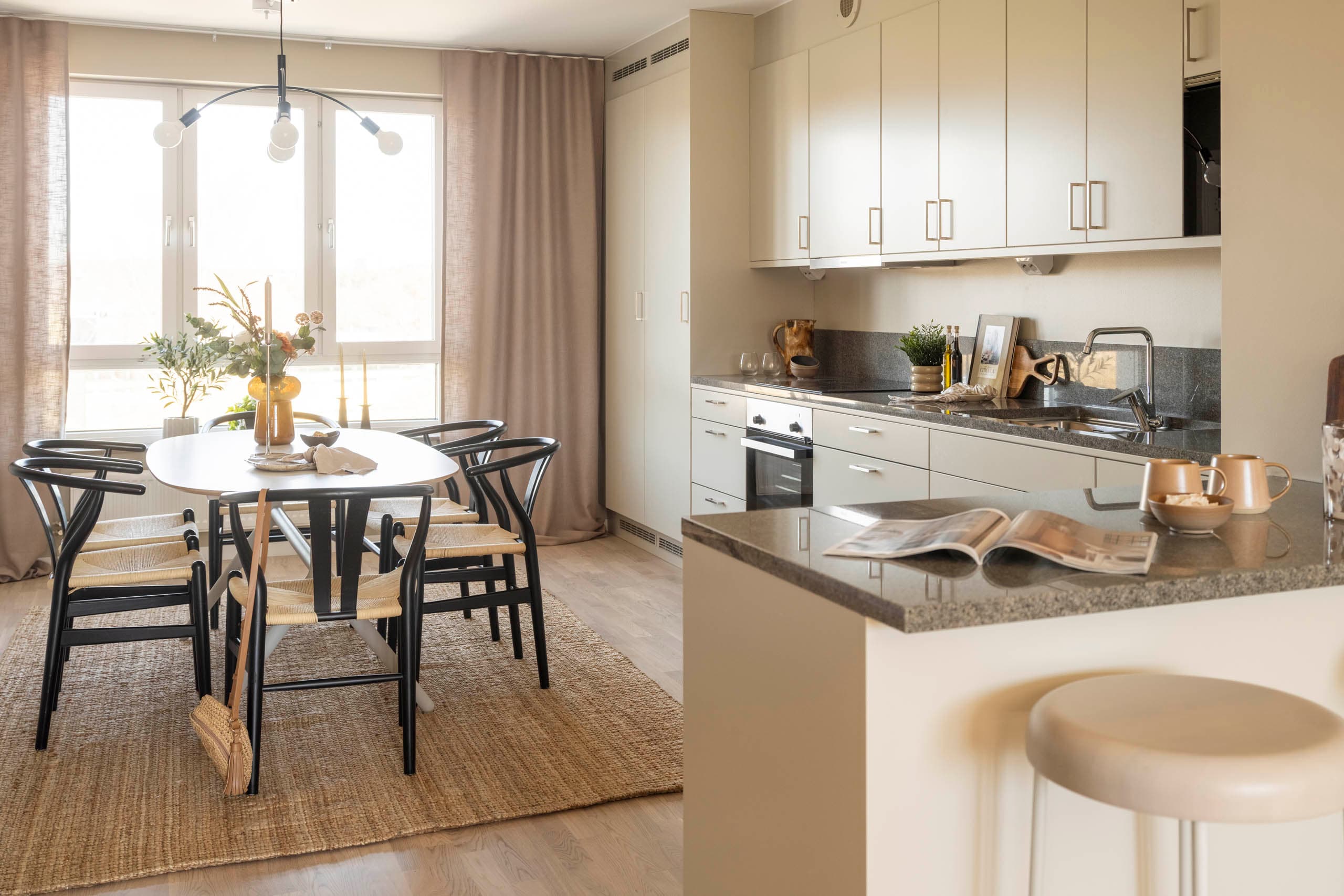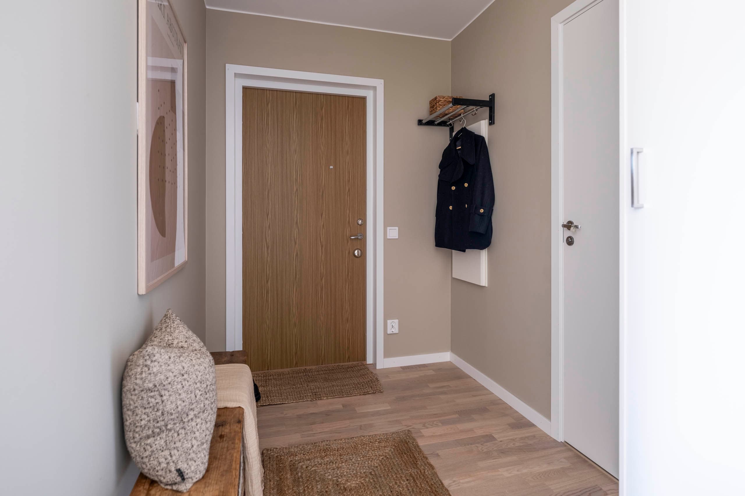 Genomgående bostad med rymlig balkong i söderläge. Ett fullt utrustat kök med rymlig matplats. Den sociala planlösningen gör att du har kök och vardagsrum i anslutning med varandra. De tre separata sovrummen ligger i varsitt hörn vilket skapar en privat känsla för respektive rum. Två stilrena badrum med handdukstork och dusch i respektive badrum. Det större badrummet är utrustat med tvättmaskin samt torktumlare. Bostaden är inredd med vår designlinje Höst som har vitlaserad ekparkett och går i beige toner i kök och badrum.