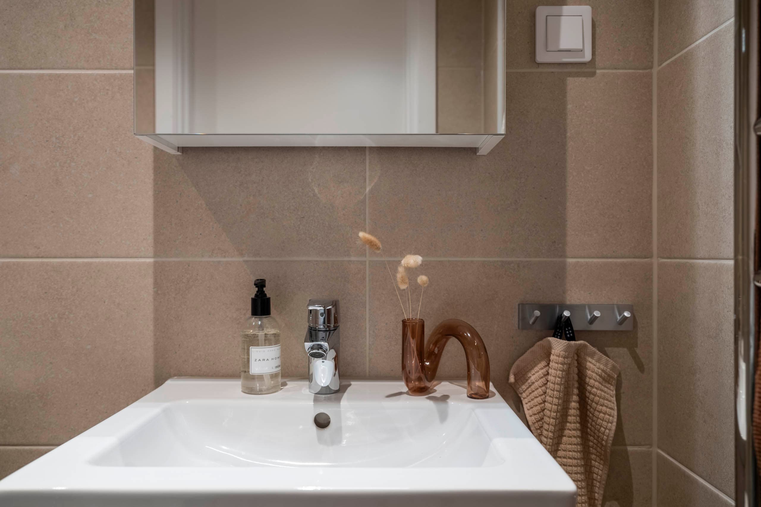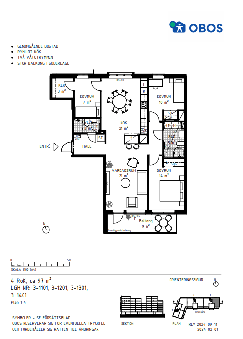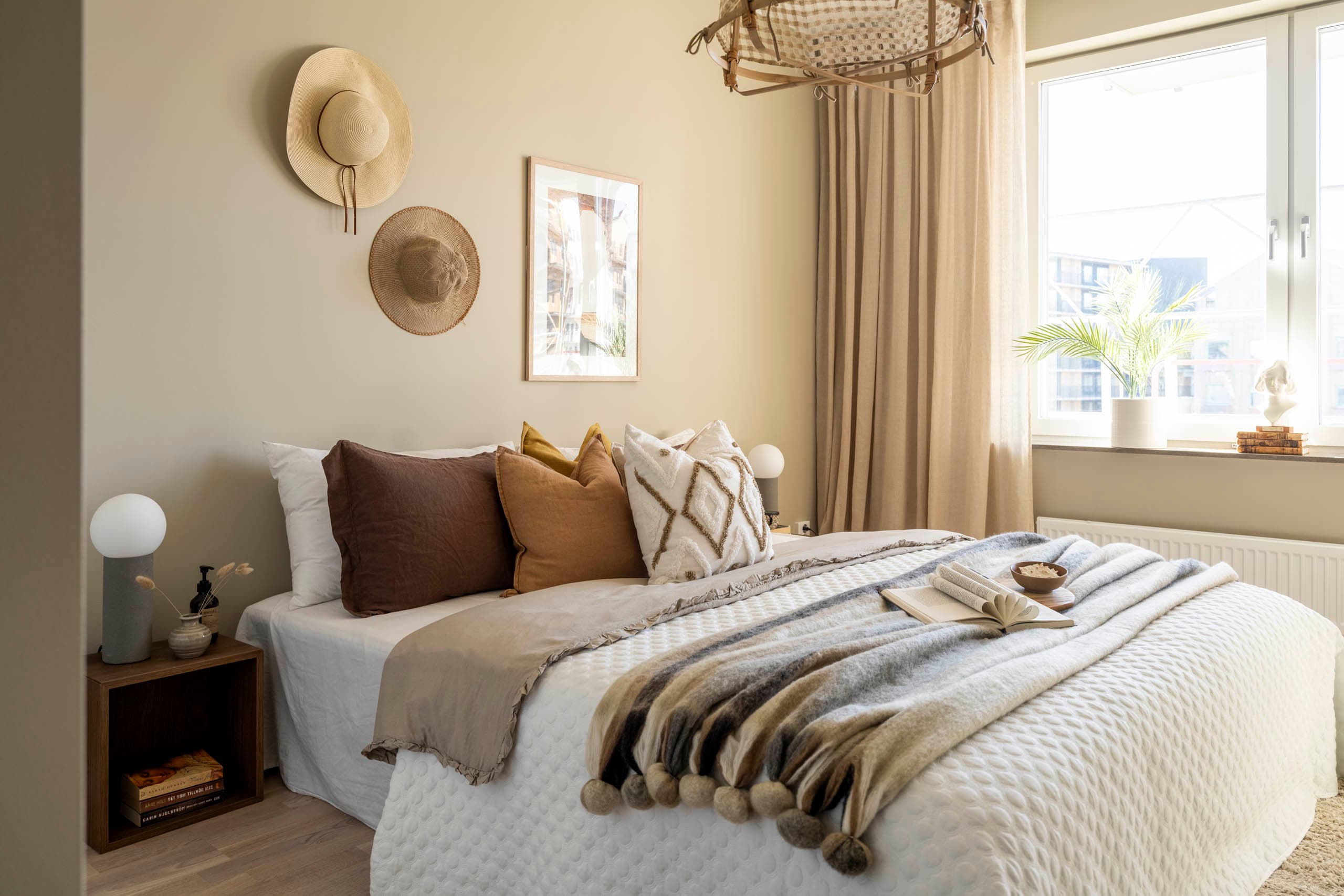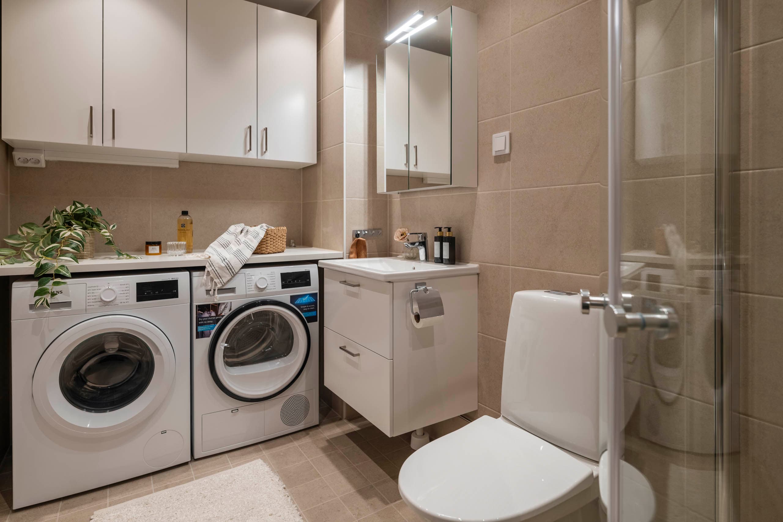 Genomgående bostad med rymlig balkong i söderläge. Ett fullt utrustat kök med rymlig matplats. Den sociala planlösningen gör att du har kök och vardagsrum i anslutning med varandra. De tre separata sovrummen ligger i varsitt hörn vilket skapar en privat känsla för respektive rum. Två stilrena badrum med handdukstork och dusch i respektive badrum. Det större badrummet är utrustat med tvättmaskin samt torktumlare. Bostaden är inredd med vår designlinje Höst som har vitlaserad ekparkett och går i beige toner i kök och badrum.