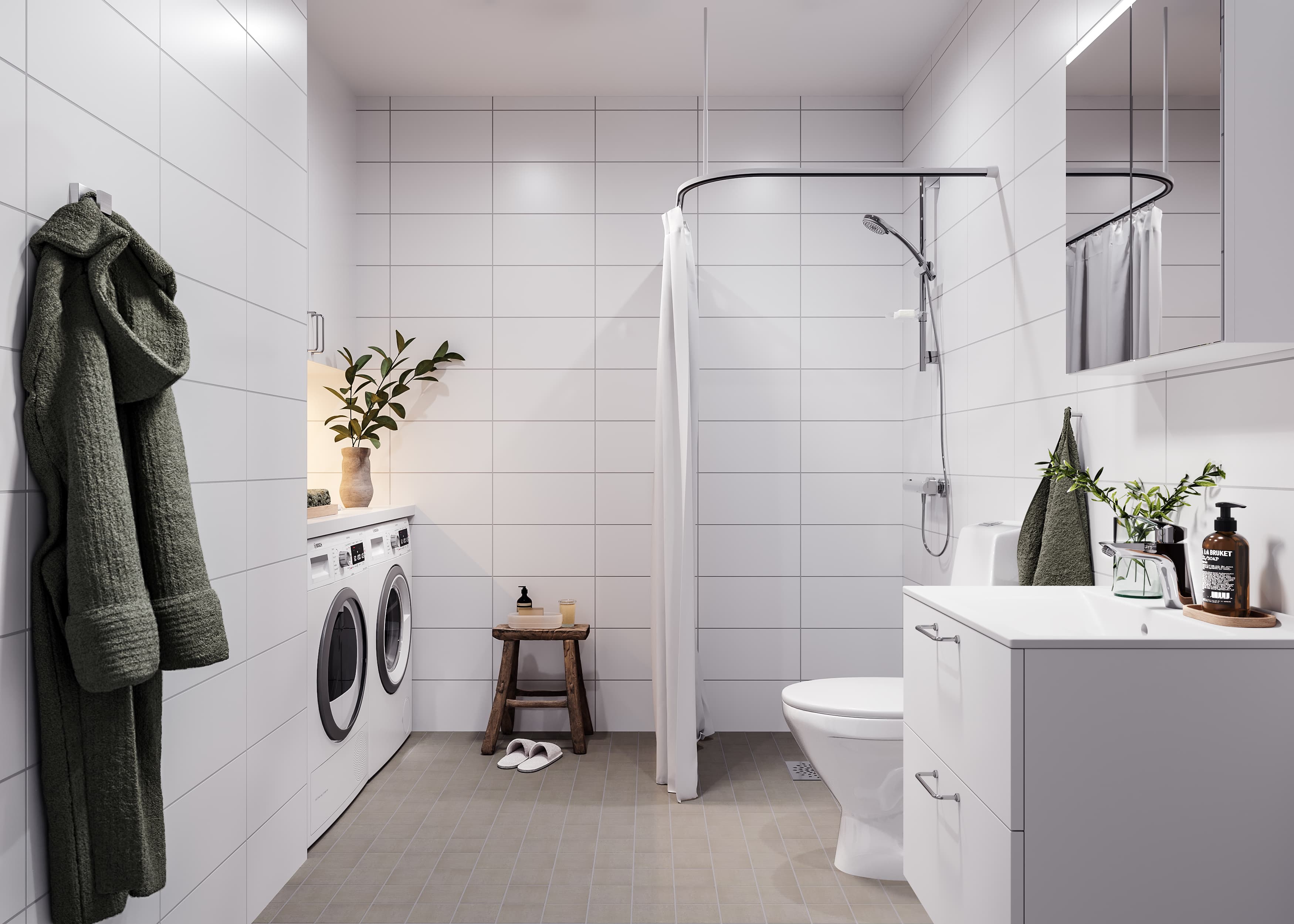 Här kliver du in i en hall med skjutdörrsgarderob och bra förvaringsutrymme. Till vänster ligger det trevliga köket med matplats, utrustat med allt du behöver för en bekväm vardag, så som diskmaskin och mikrovågsugn. På väg mot vardagsrummet passerar du det stora badrummet som är helkaklat med wc och duschhörna, samt tvättmaskin och torktumlare med en praktisk arbetsyta ovanpå. I vardagsrummet finns det plats för en härlig soffgrupp och umgänge. Härifrån når du också den mysiga uteplatsen med altan i trätrall och trädgårdstäppan. En skärmvägg avgränsar mot grannen och i trädgården finns ett utomhusförråd med plats för trädgårdsredskapen.