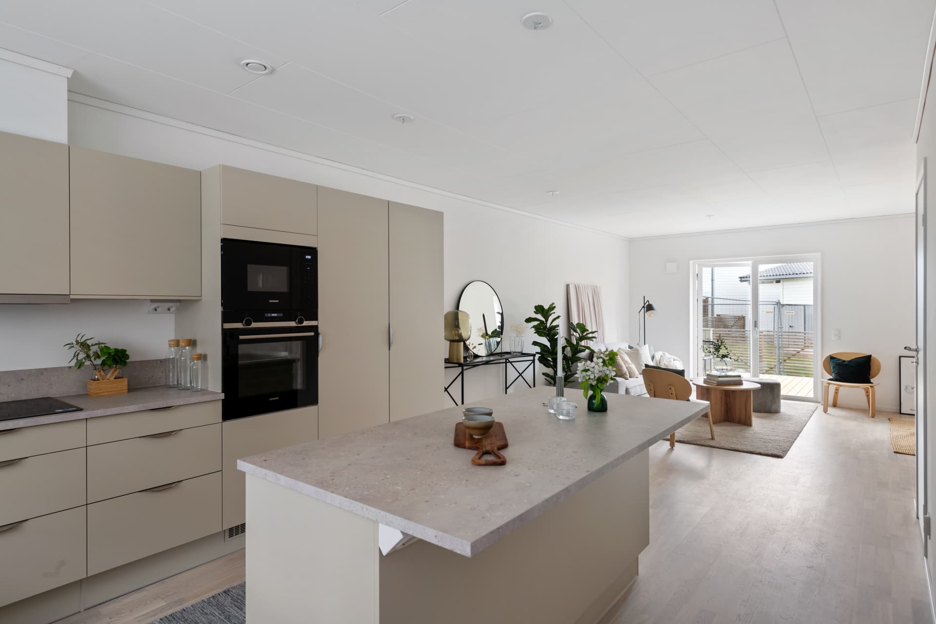 Vardagsrummets dubbeldörrar leder dig ut på altanen med trädäck och sedan vidare ut i den lättskötta trädgården. Här kan du njuta av en av de allra största fördelarna med att bo i hus – nämligen att kunna gå rakt ut och känna gräset under fotsulorna!