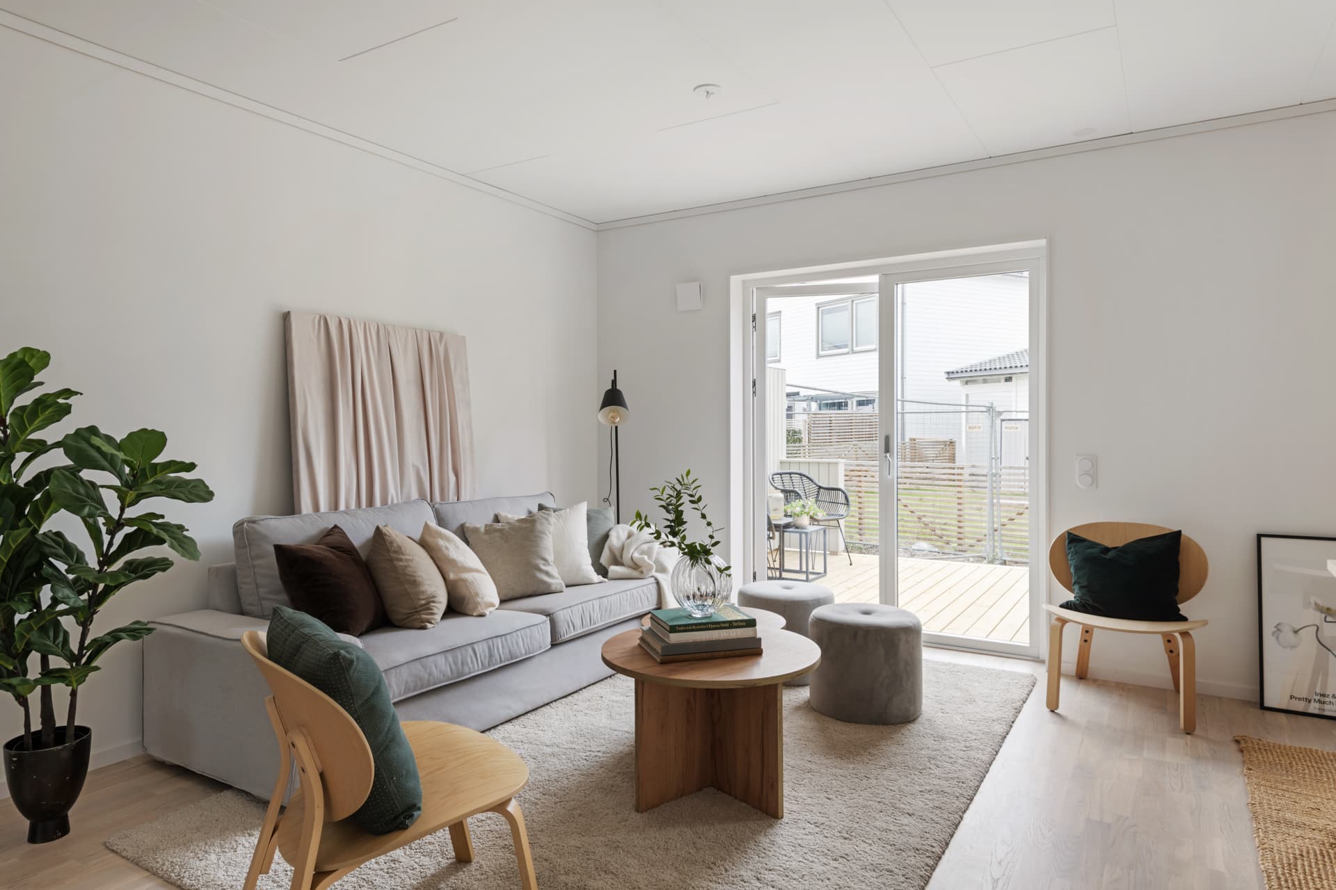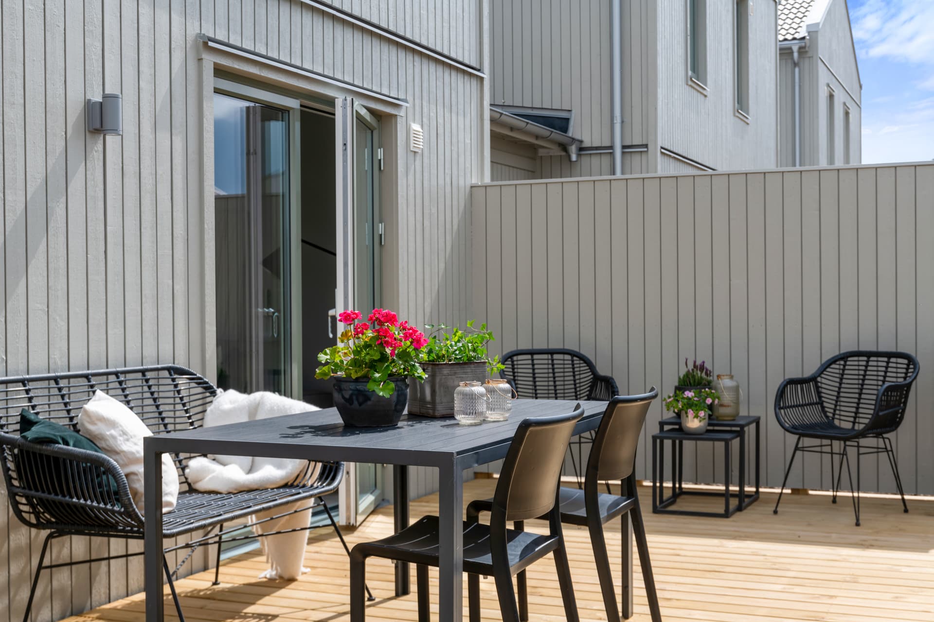Vardagsrummets dubbeldörrar leder dig ut på altanen med trädäck och sedan vidare ut i den lättskötta trädgården. Här kan du njuta av en av de allra största fördelarna med att bo i hus – nämligen att kunna gå rakt ut och känna gräset under fotsulorna!