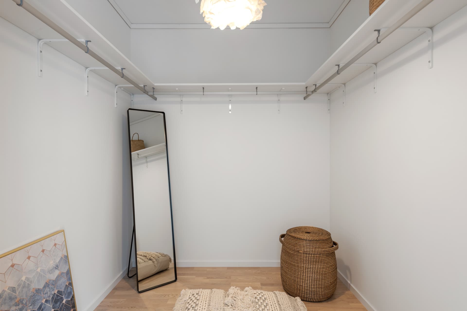 Under trappan till övervåningen finns ett smart, dolt förråd med plats för alla möjliga prylar. På övervåningen hittar du sedan tre rymliga sovrum som standard – alla med egna förvaringsmöjligheter. Master bedroom får dessutom en egen, lyxig walk-in closet. Här uppe finns även ett luftigt allrum som du i framtiden kan välja att göra om till ett extra sovrum.