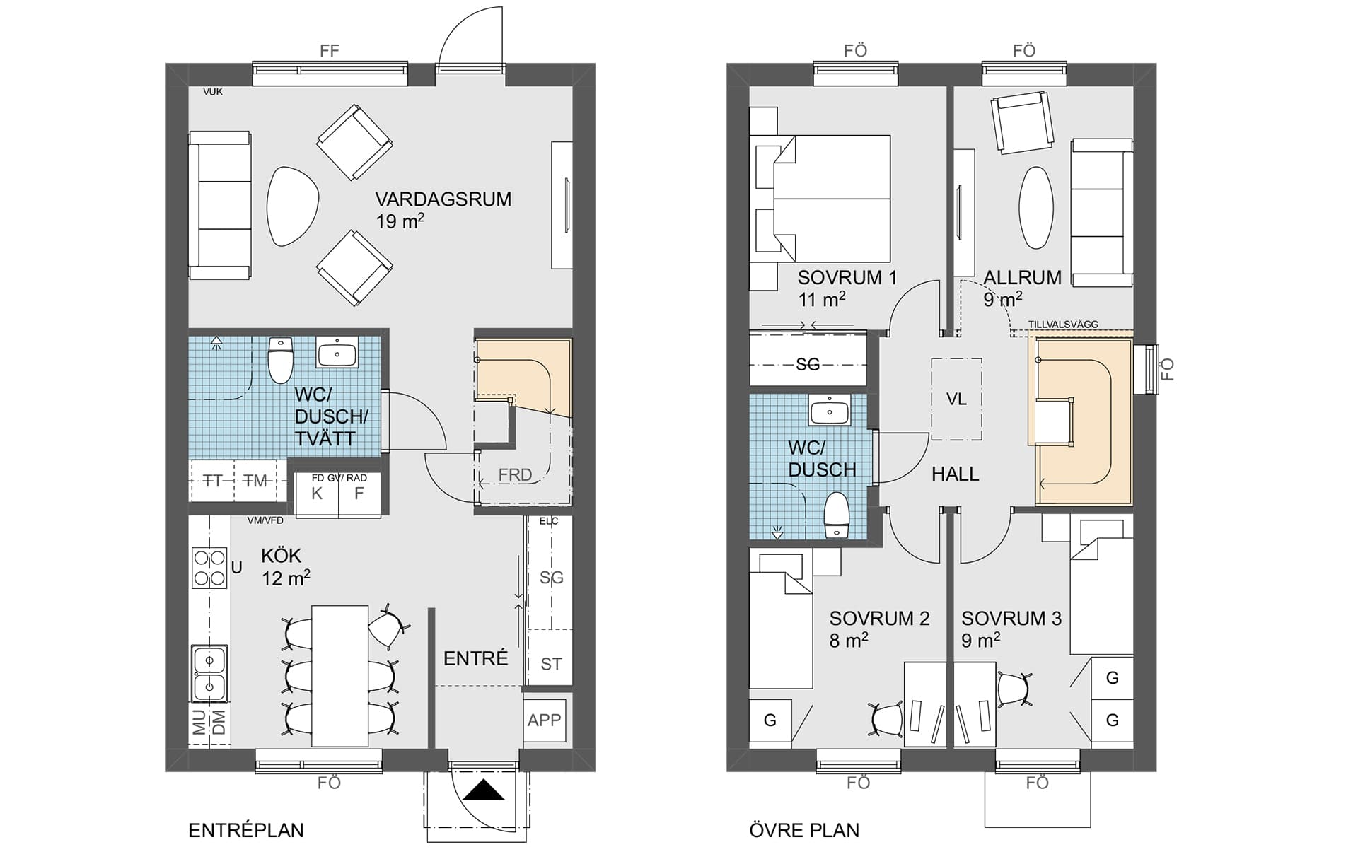 På övervåningen hittar du ett rymligt allrum och tre bra sovrum, varav det största har rymliga skjutdörrsgarderober. Här finns också hemmets andra badrum med wc och duschhörna.