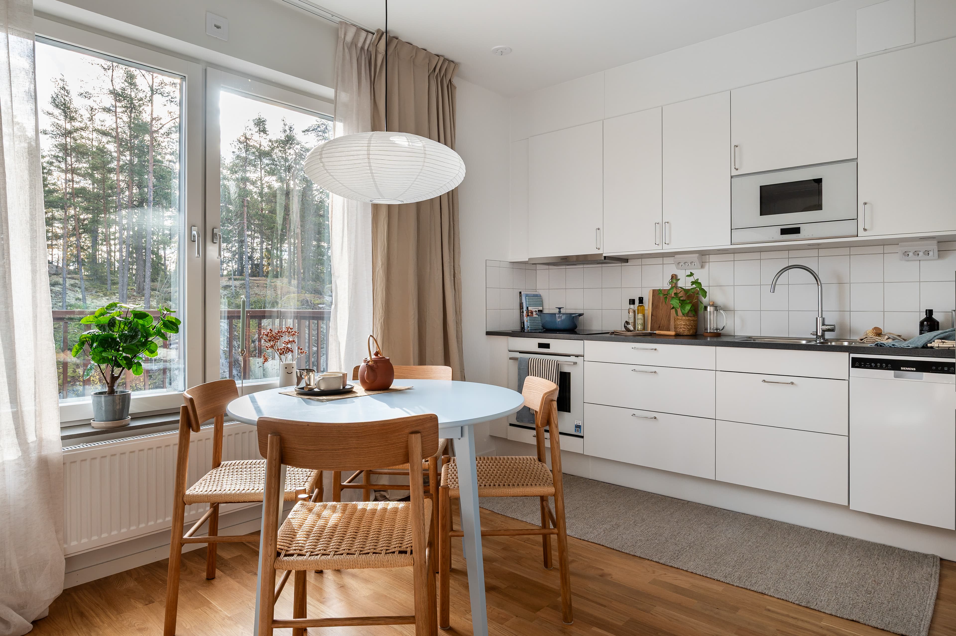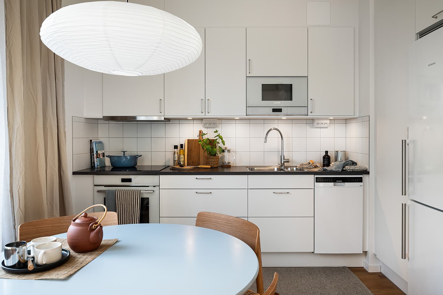 I den stilrena köksdelen finns gott om plats för middagsbjudningar och du behöver inte kompromissa med förvaringen här heller. Ett stort skafferi är vardagslyx för dig som gärna storhandlar och disken behöver du inte tänka på - vitvarorna från Siemens sköter det mesta av arbetet i köket.