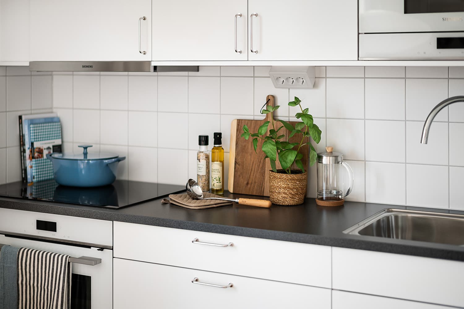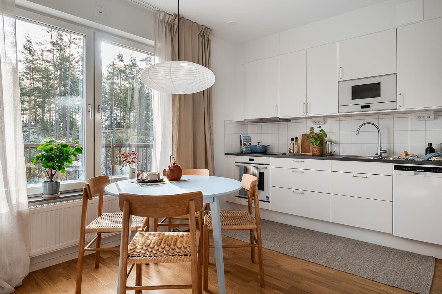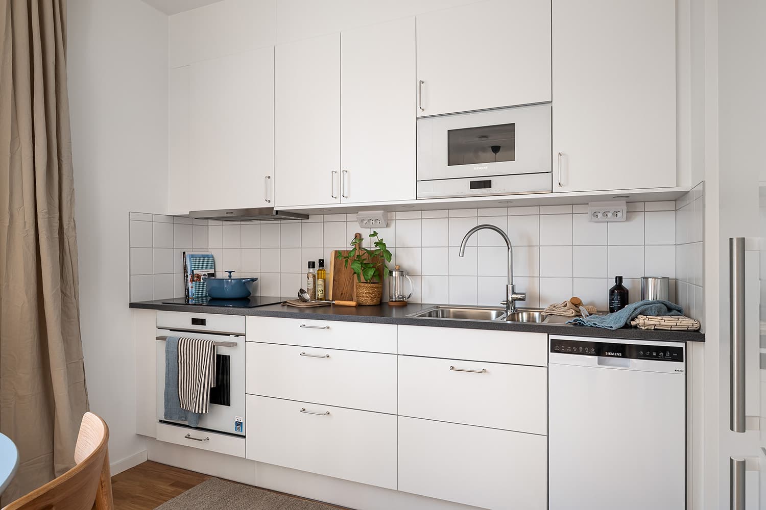 I den stilrena köksdelen finns gott om plats för middagsbjudningar och du behöver inte kompromissa med förvaringen här heller. Ett stort skafferi är vardagslyx för dig som gärna storhandlar! Och du slipper disken, vitvaror från Siemens sköter det mesta av köksjobbet!