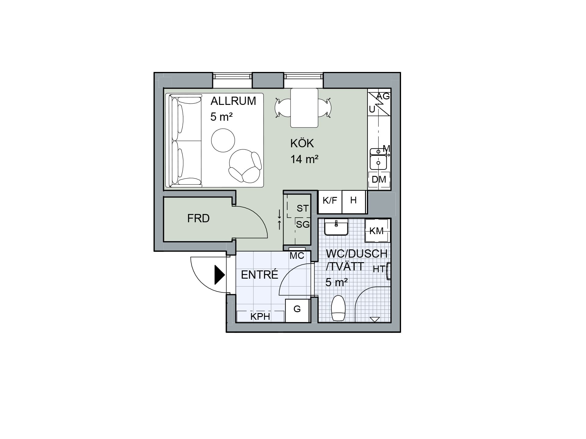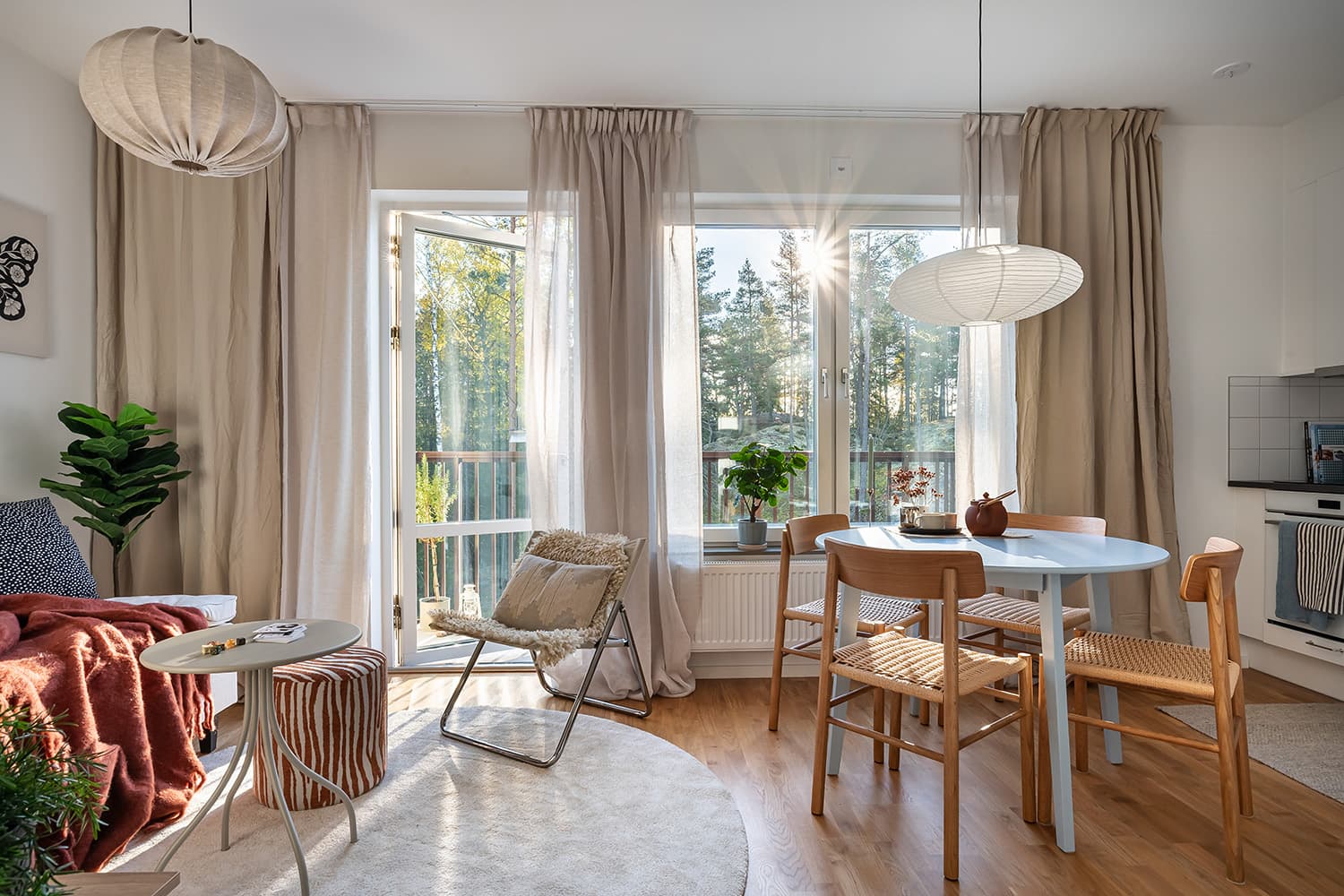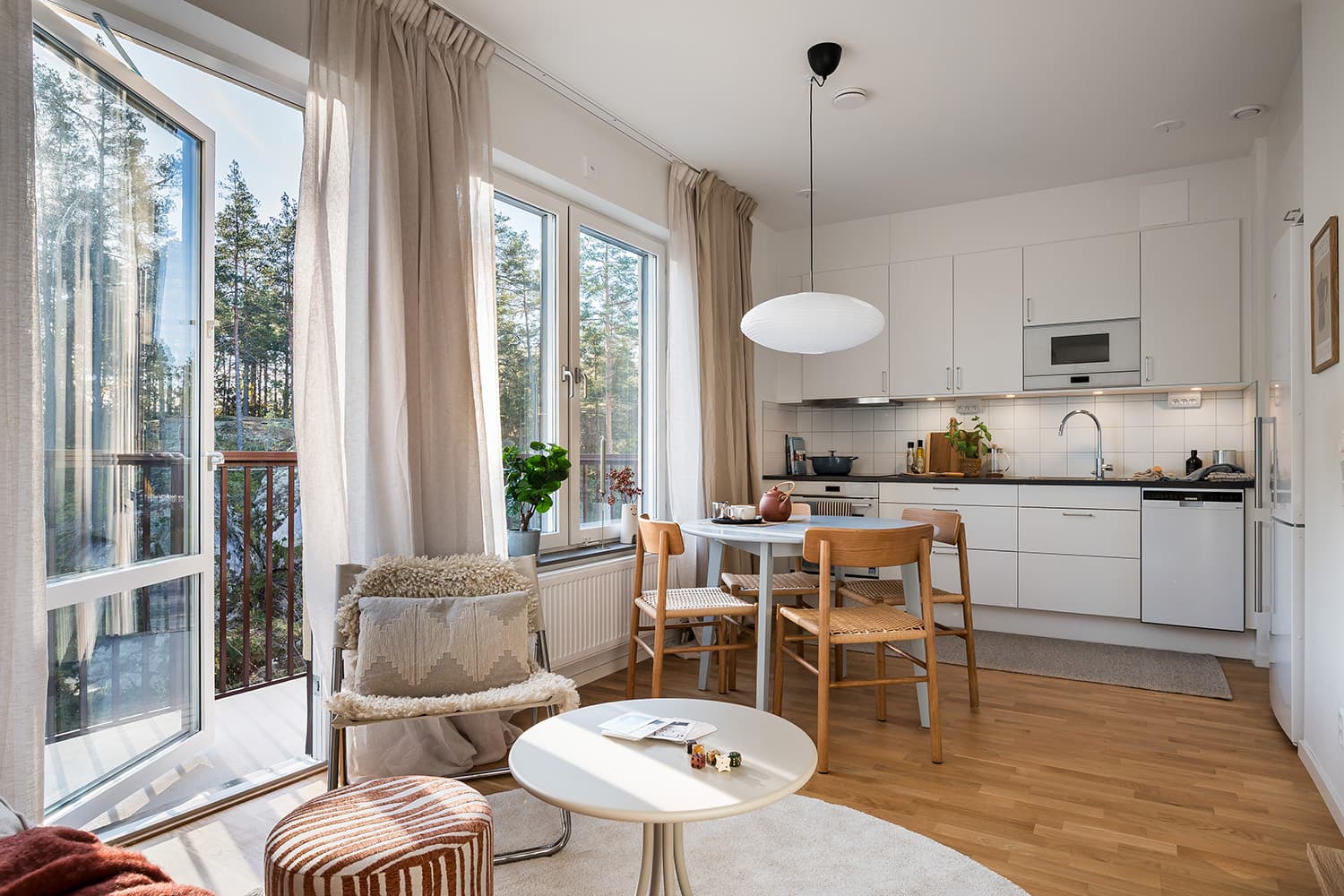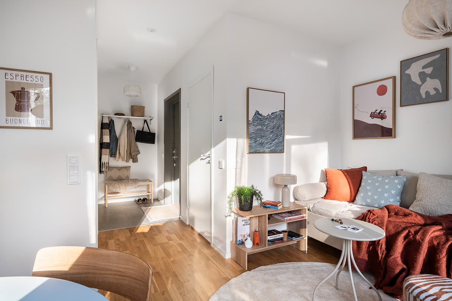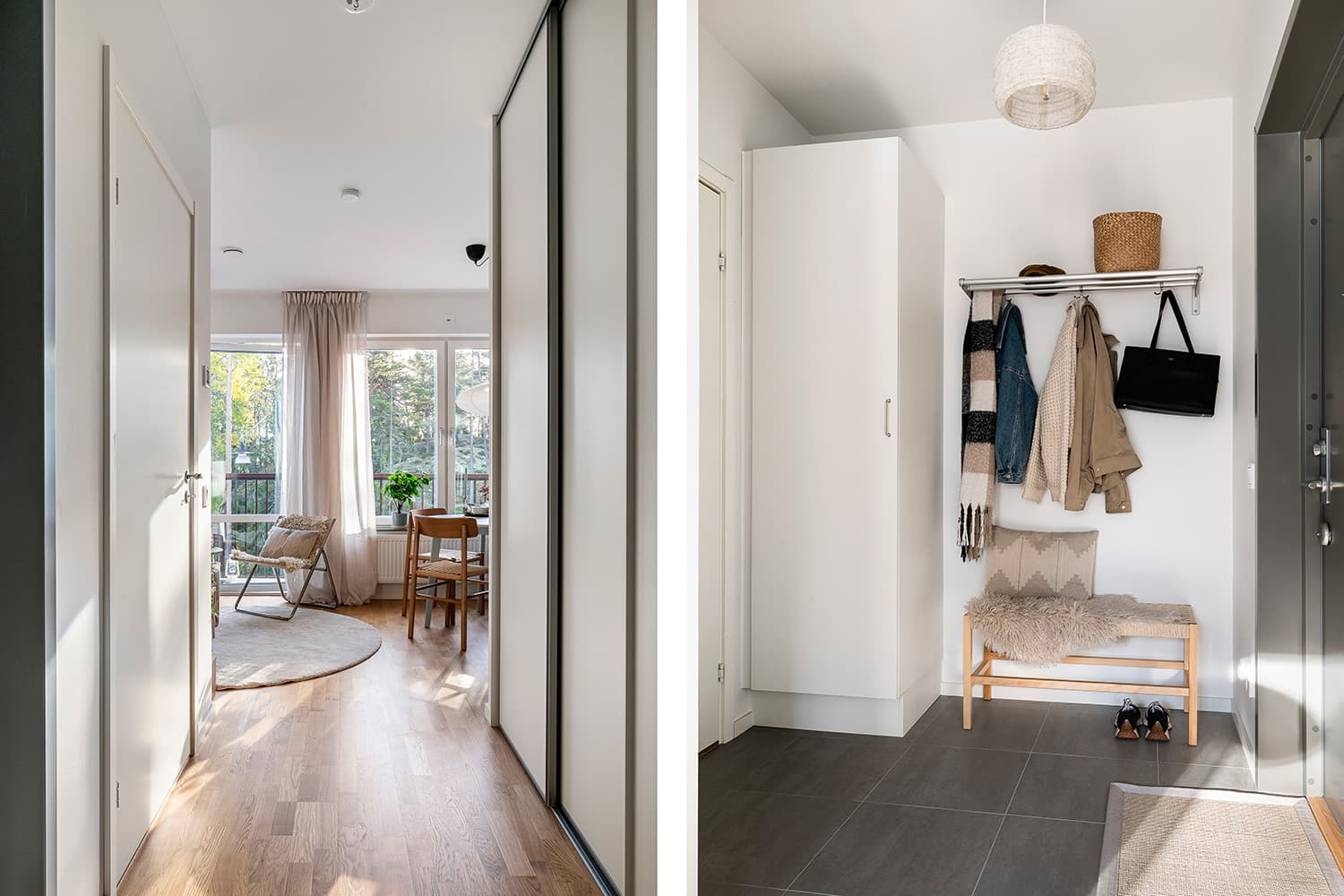 I denna etta möts du av en praktisk entré med klinker, massor av förvaring, hatthylla, garderob och dessutom en Elfa- lösning i passagen mot det ljusa rummet. Även i en 1:a vill man ju ha plats för både ryggsäckar, vantar, stövlar och träningsskor!