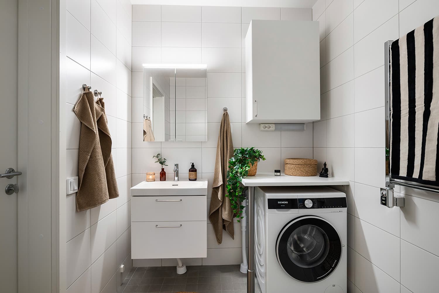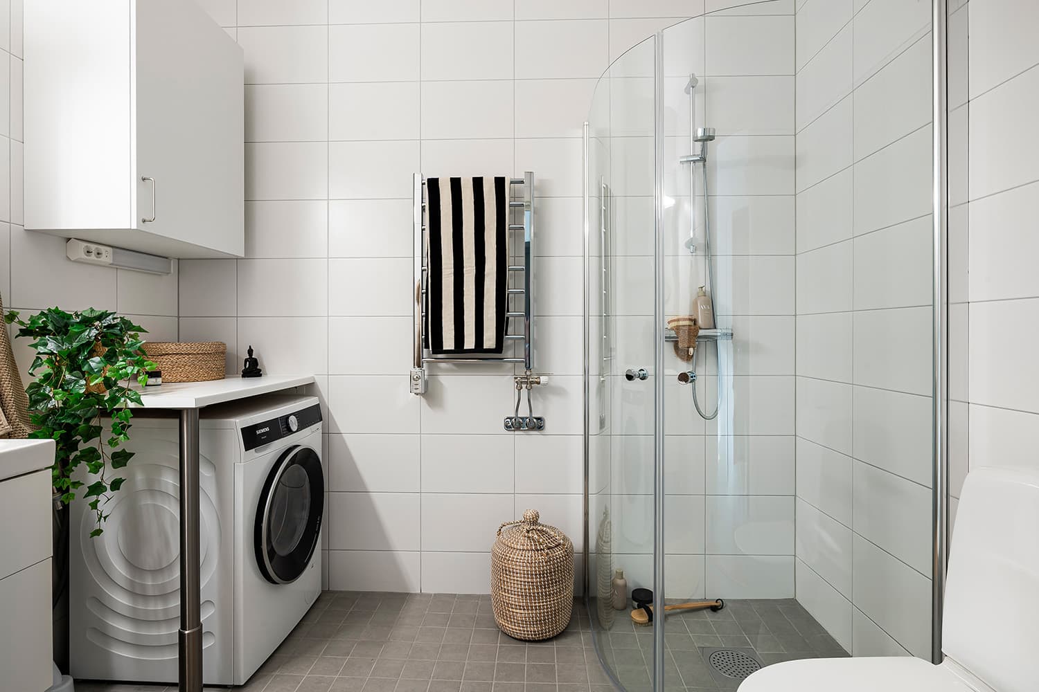 Morgonduschar gör du i helkaklat rymligt badrum med kommod och kombimaskin. Arbetsbänk med belysning och väggskåp för tvättmedel gör tvätten enklare! I lägenheten finns dessutom ett förråd med plats för både kläder, påslakan, julsaker och annat som behöver sparas. Önskar du ännu mer plats så finns det externa förråd att hyra i föreningen.