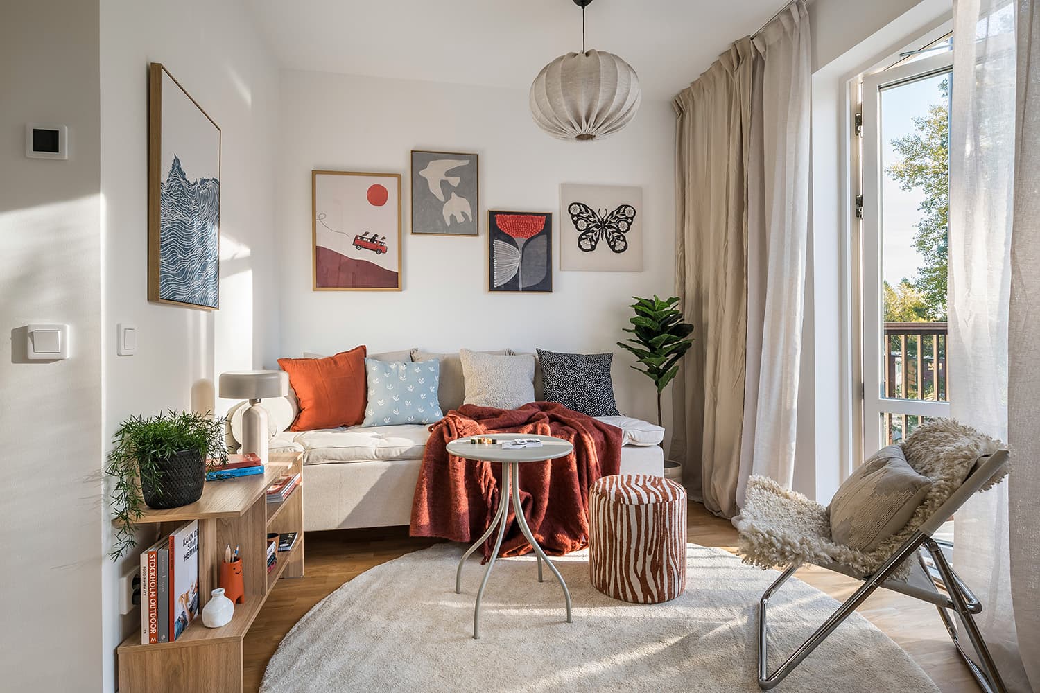 På kvällen blir myshörnan sovrum. Hotellskena monterad i taket gör det enkelt att stänga ute världen med gardiner och sova gott!