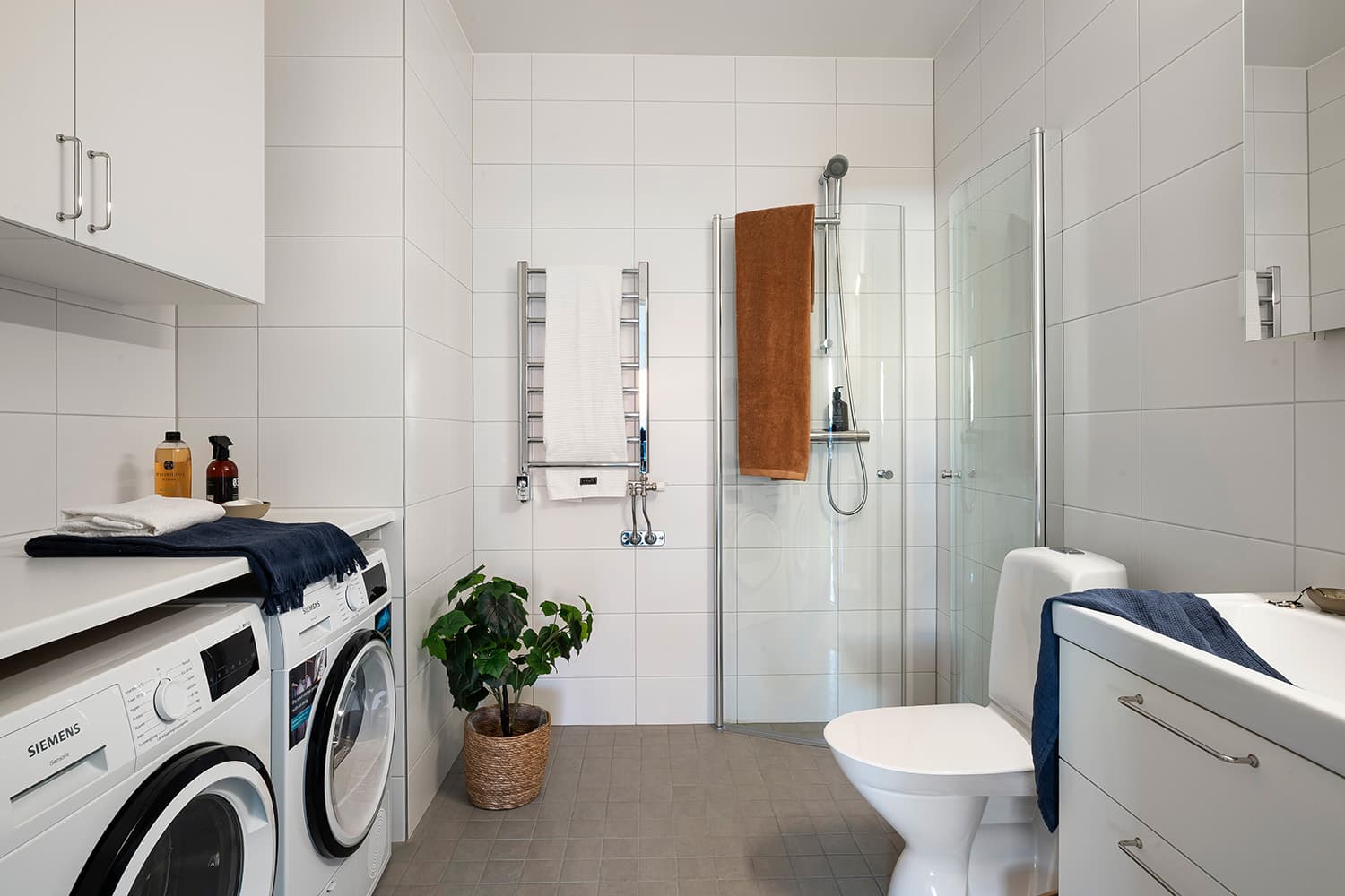Duschar gör du i helkaklat rymligt badrum med kommod och tvättstugedel. Arbetsbänk med belysning och gott om väggskåp gör livet och tvätten enklare!
