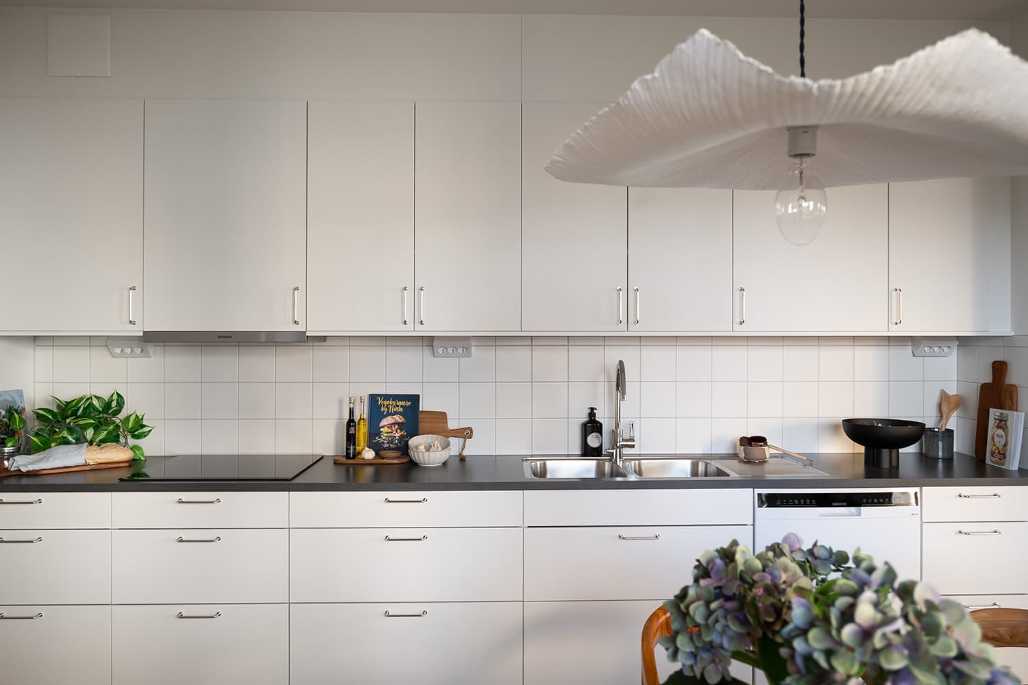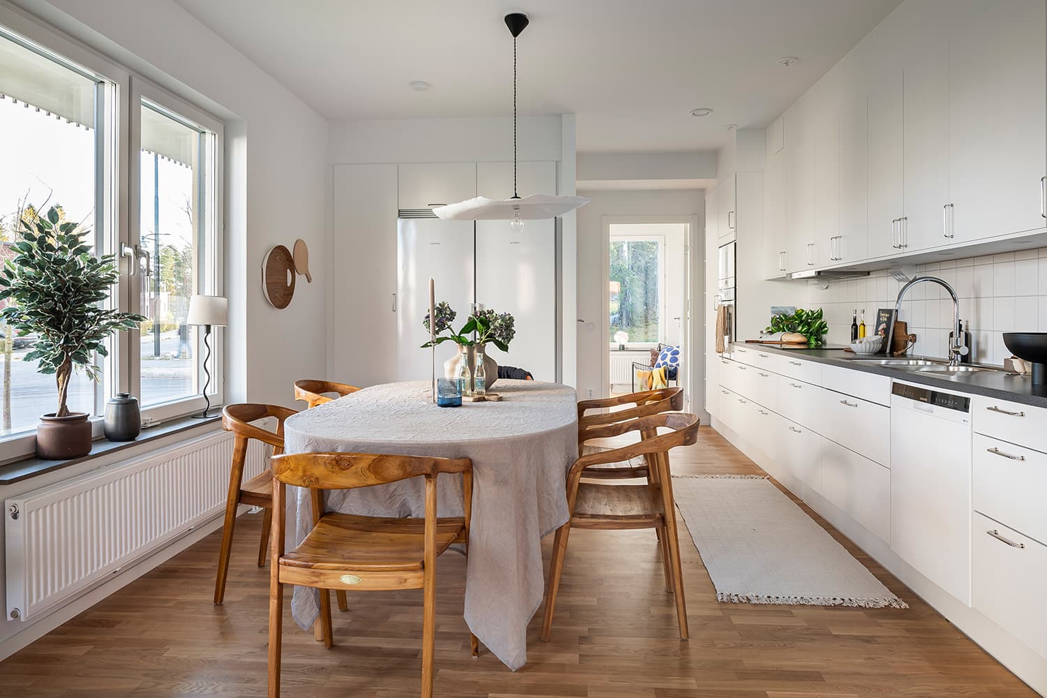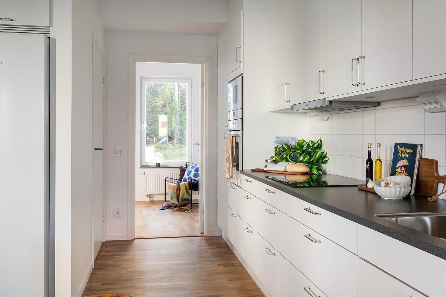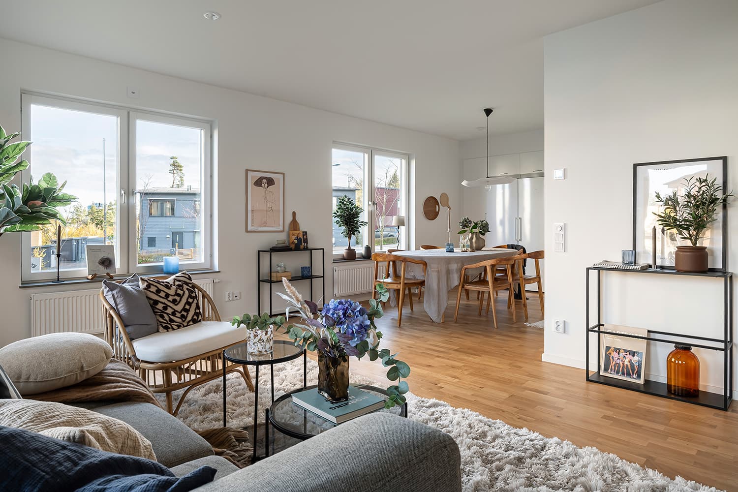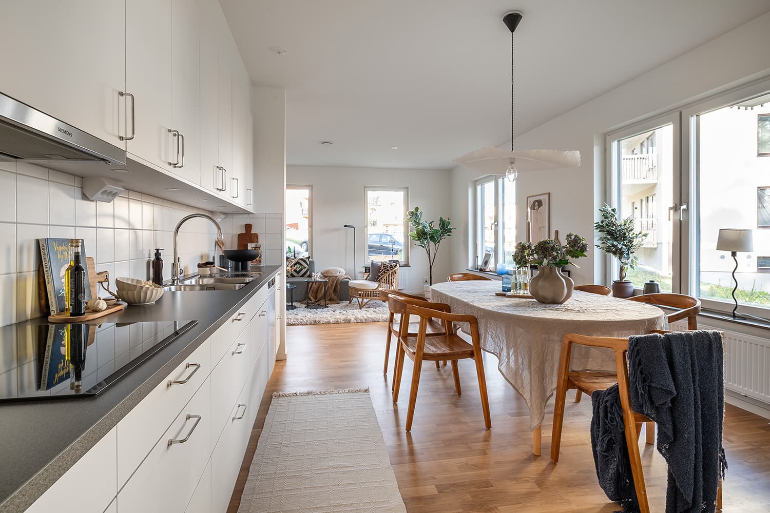 Det stilrena köket bjuder verkligen in till matlagning och middagar. Mycket arbetsyta så många kan hjälpas åt utan att trängas. Matbordet kan bli extra långt när det behövs - då köket övergår i en öppen och ljus vardagsrumsdel. Härifrån når du den generösa stenlagda uteplatsen som du kan göra till din egen grönskande oas. Föreningen tillåter dessutom bygge av insynskydd utifrån deras riktlinjer.