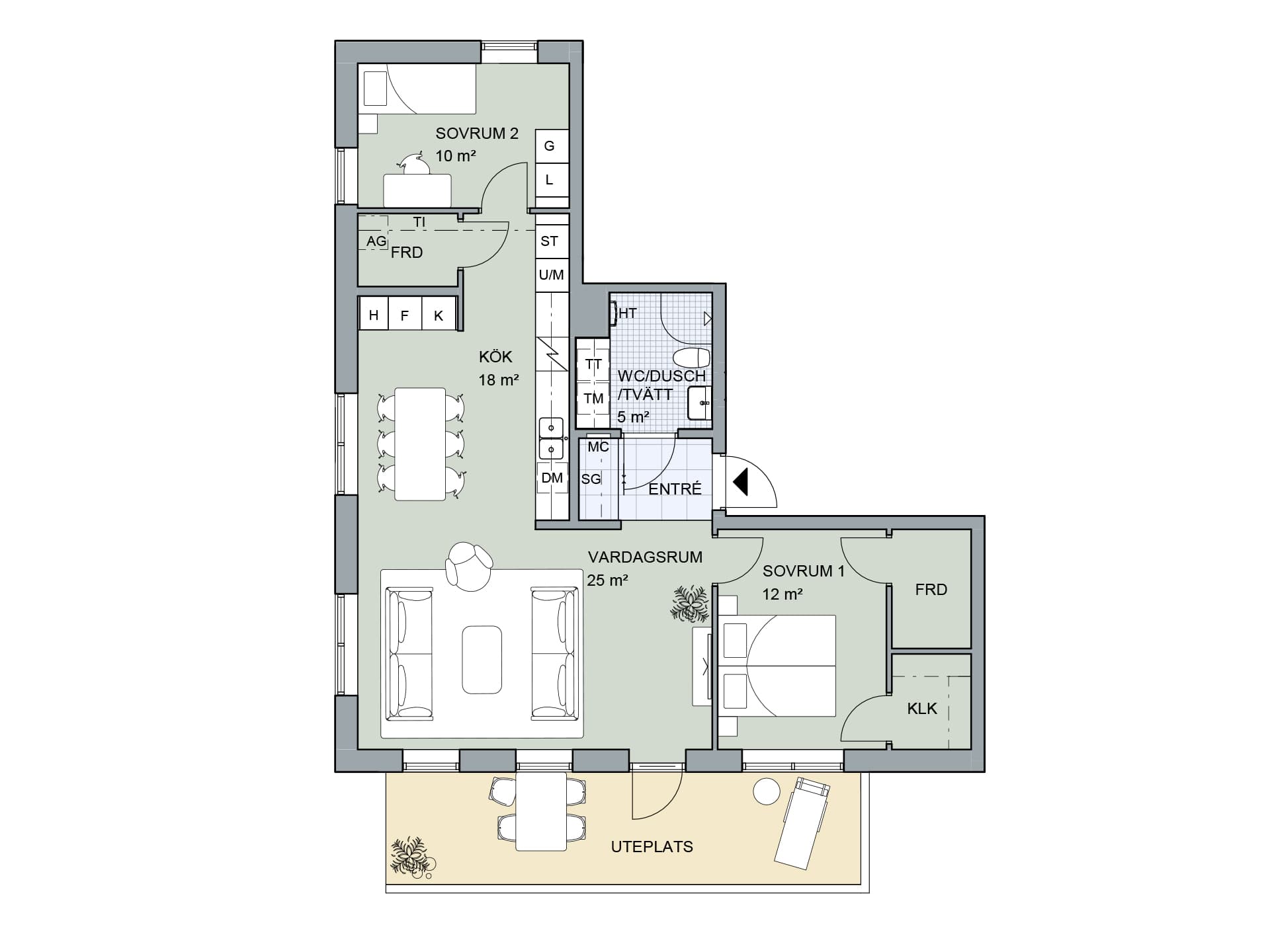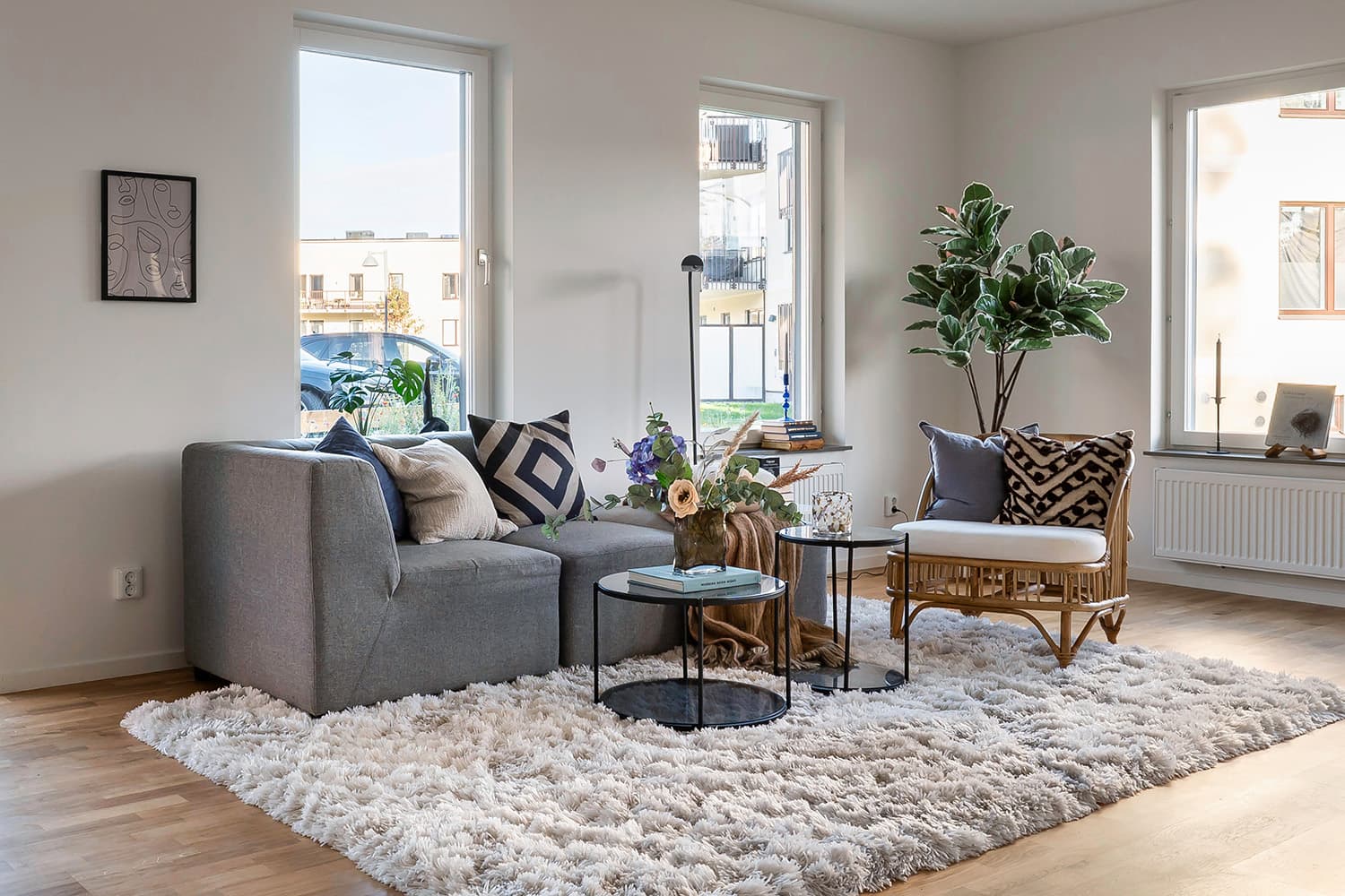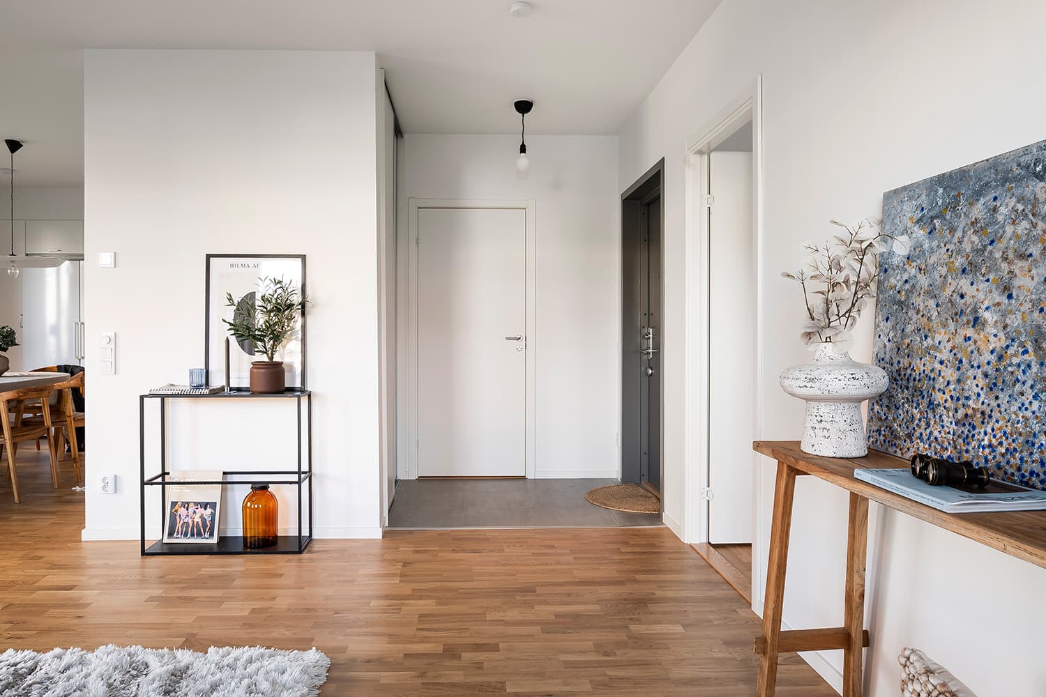 Här får du högt i tak (2,70), fönster åt tre håll och uteplats mot gården. Entré med klinker och skjutdörrsgarderob så att du slipper se alla jackor, ryggsäckar, vantar, stövlar och träningsskor.