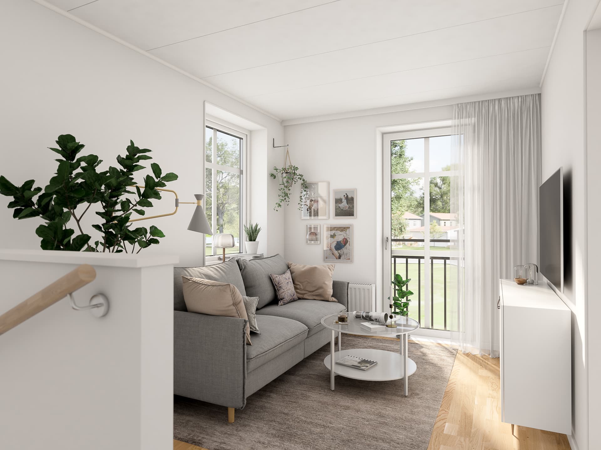 Köket är välutrustat med fullstor kyl och frys, ugn, spishäll, mikrovågsugn, diskmaskin och rejäla arbetsytor. Härifrån är det öppet mot matplatsen, men tack vare den avskiljande väggen mellan kök och vardagsrum så slipper du se disken när du myser i soffan. Från vardagsrummet når du också den härliga altanen, som bjuder ut till familjefrukost, släktkalas och grillkvällar. Kanske sträcker sig festligheterna ända ut på gräsmattan nedanför? En trappa upp har du husets mer privata del, med tre trivsamma sovrum, ett badrum med dusch och WC samt ett inbjudande allrum som rymmer både film- och TV spelskvällar. Här finns också en fransk balkong.