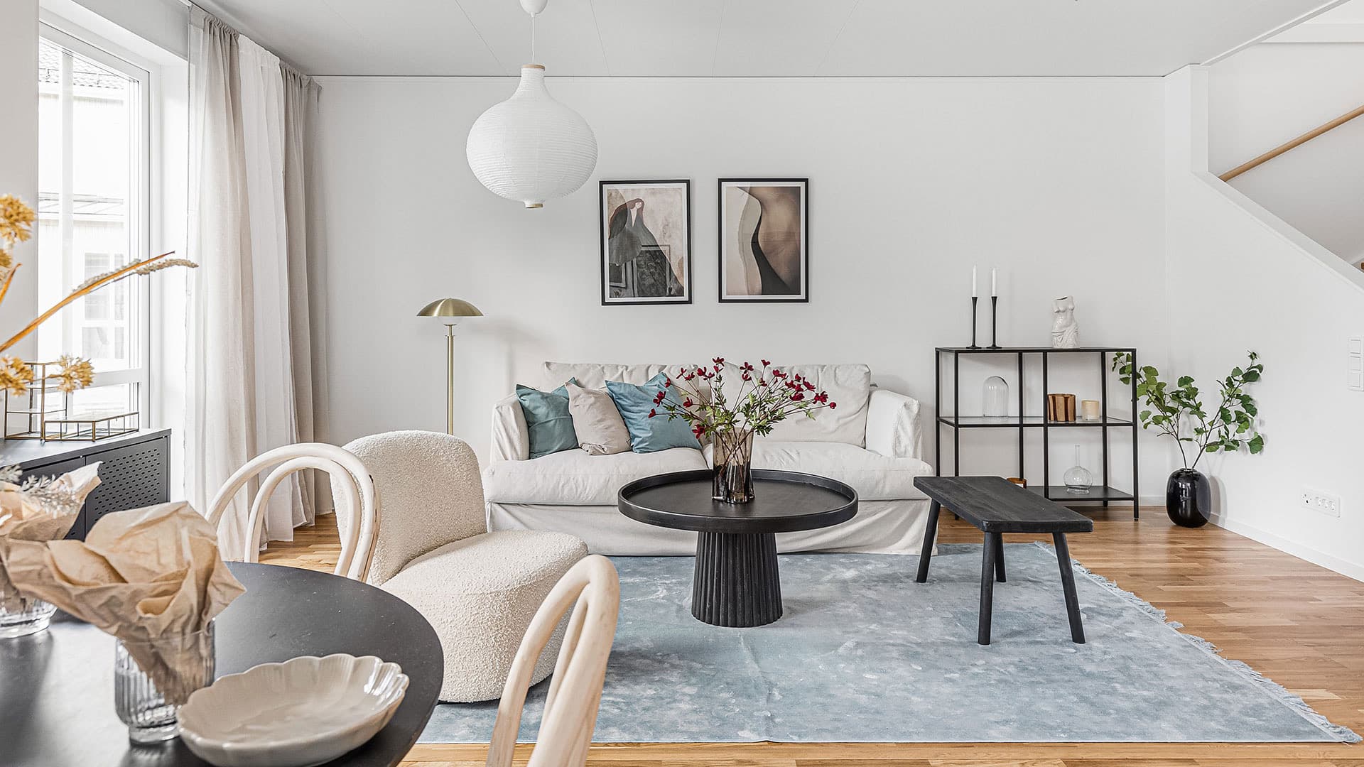 Här har du en ljus och trevlig bostad med kvadratmetrarna på rätt ställe. Direkt i entrén hittar du bekvämligheter som husets ena badrum med WC, dusch, tvättmaskin och torktumlare – och en smart förvaringsyta i form av ett förråd under trappan. Sedan tar en härlig umgängesyta vid, med öppen planlösning mellan kök och vardagsrum.