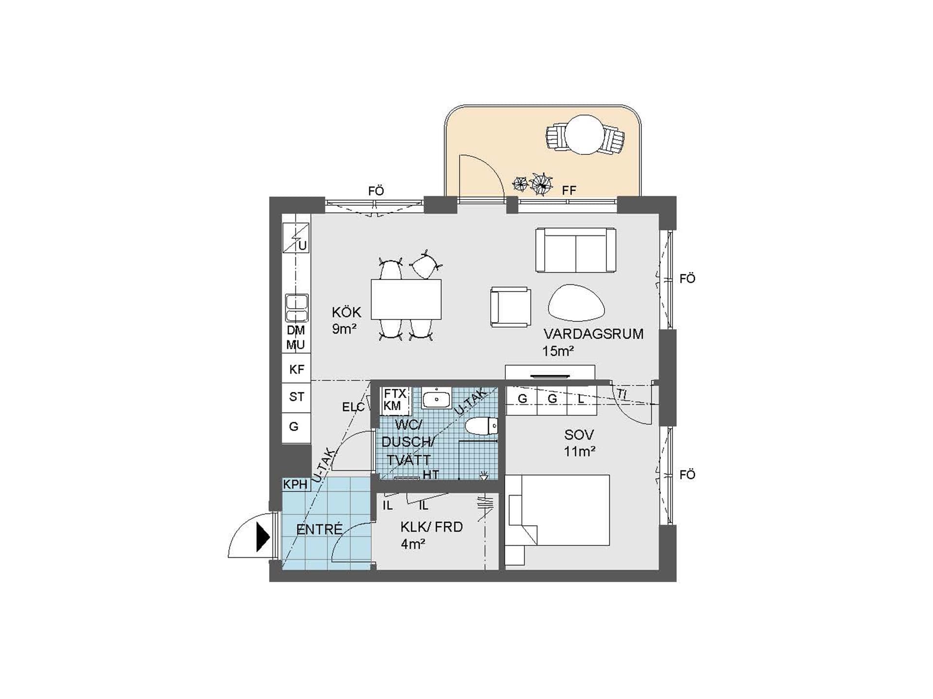 Rymligt sovrum med plats för dubbelsäng, öppet mellan kök och vardagsrum och helkaklat badrum med kombimaskin.