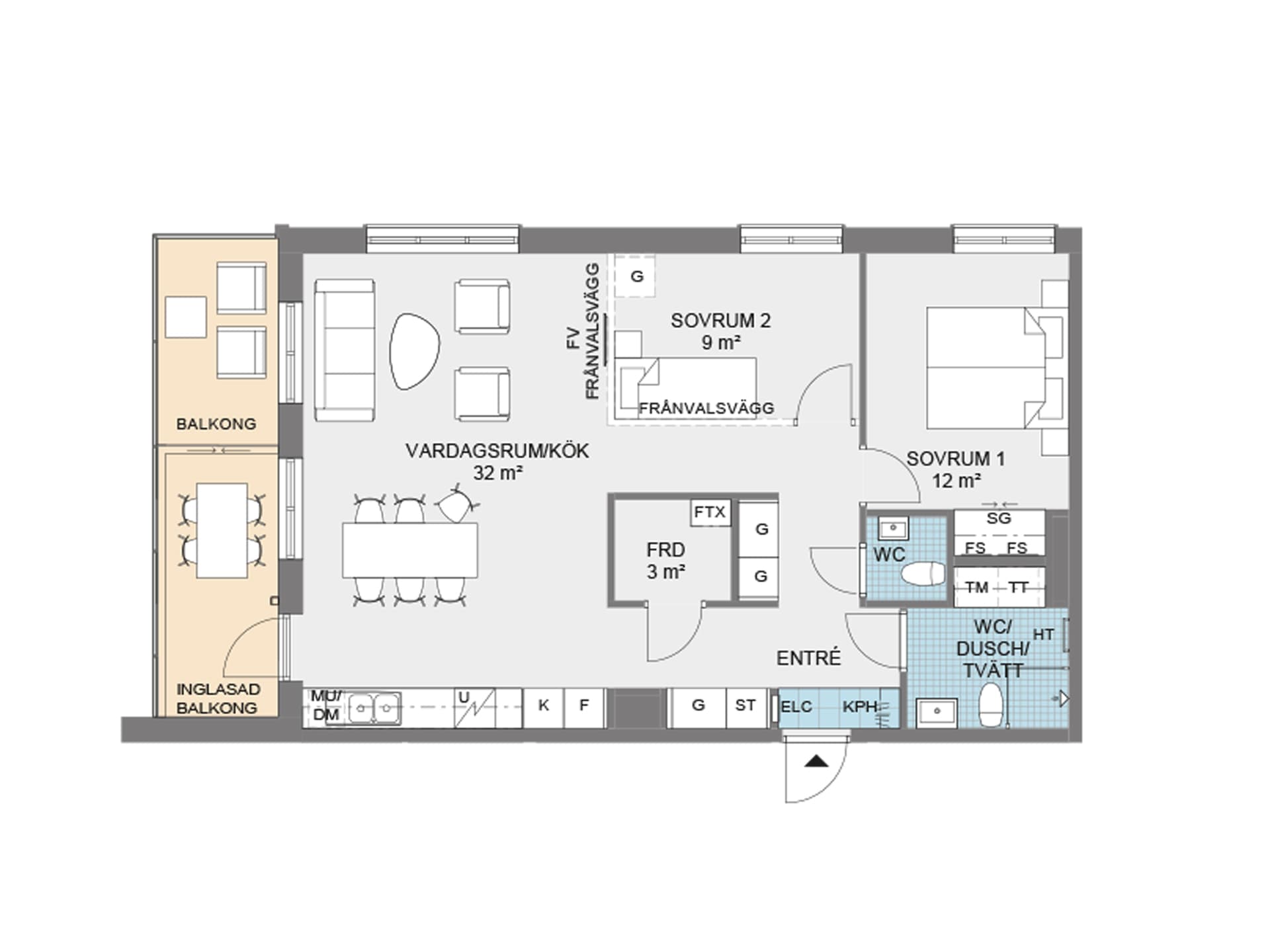 Till vänster har du det välutrustade köket med en rymlig matplats i öppen planlösning mot vardagsrummet. Härifrån når du också den härliga balkongen i västerläge och tack vare den inglasade delen kan du verkligen njuta av kvällarna här.