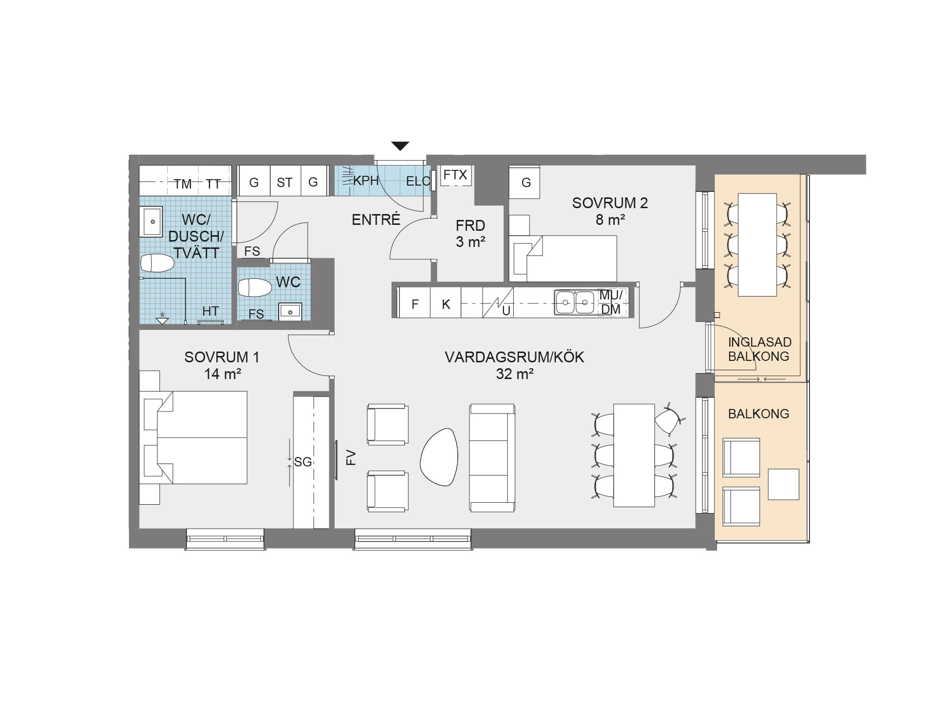 Vidare når du vardagsrummet som är öppet mot kök och matplats samt två rymliga sovrum med ännu mer plats till förvaring. Via vardagsrummet når du också den stora balkongen som löper längs med hela bostadens bredd, med en inglasad del - som förlänger utesäsongen betydligt. Ett hem som rymmer alla bekvämligheter, med andra ord.