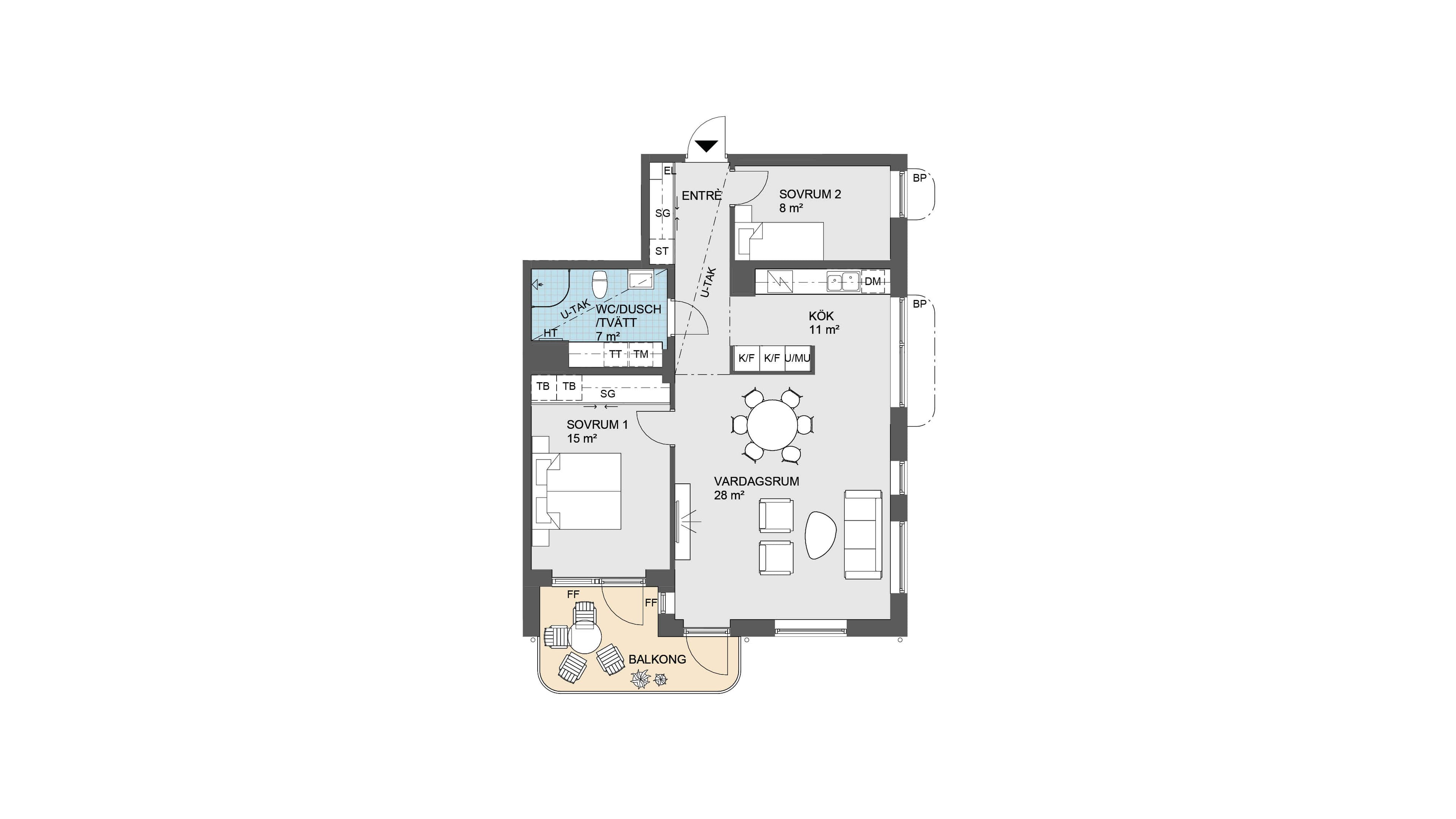 Social och öppen planlösning mellan kök och vardagsrum. Trevlig rundgång, gavelläge och balkong i söderläge. Du väljer kostnadsfritt mellan våra fyra designlinjer – Vår, Sommar, Höst eller Vinter.