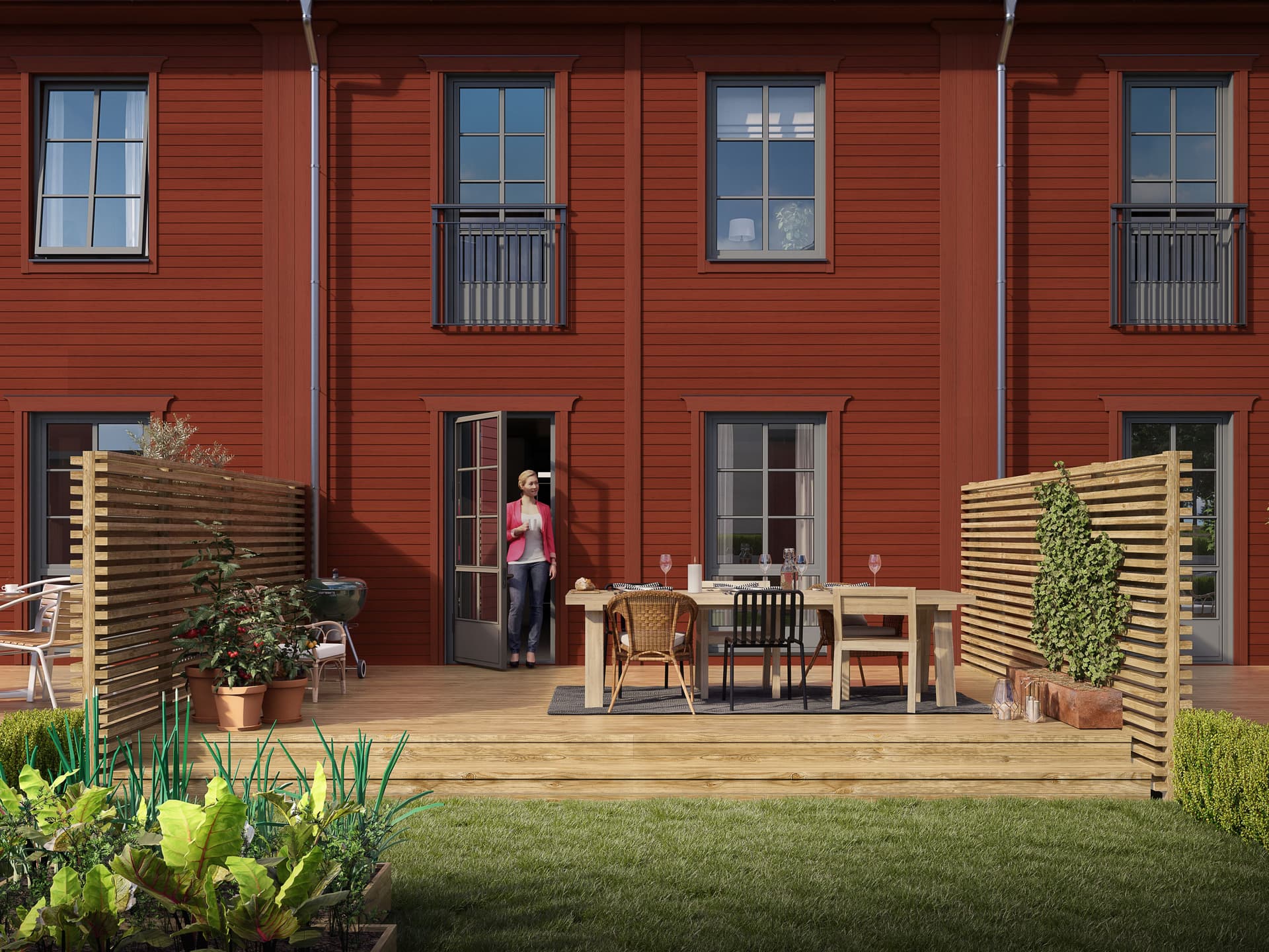 - Det är ett både prisvärt och kvalitetssäkert sätt att bygga på, säger Henrik. Och tack vare konceptets flexibilitet i designen har vi här kunnat ge husen den äkta träkänslan som rimmar så väl med trästaden Nora. En varmröd färgsättning, snickarglädje och liggande panel kombinerar traditionellt med modernt och bidrar till en trivsam kvarterskänsla.